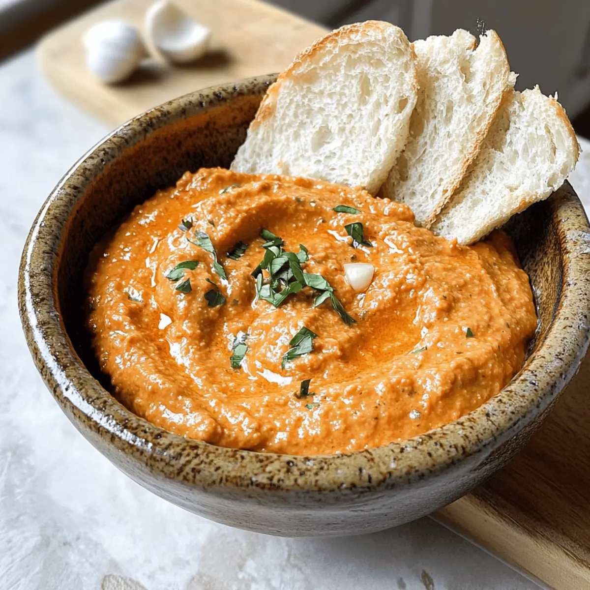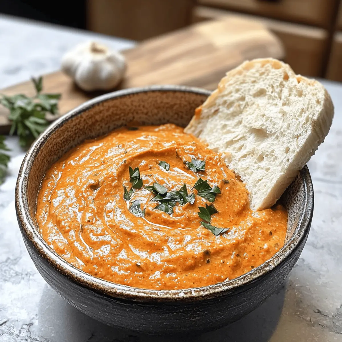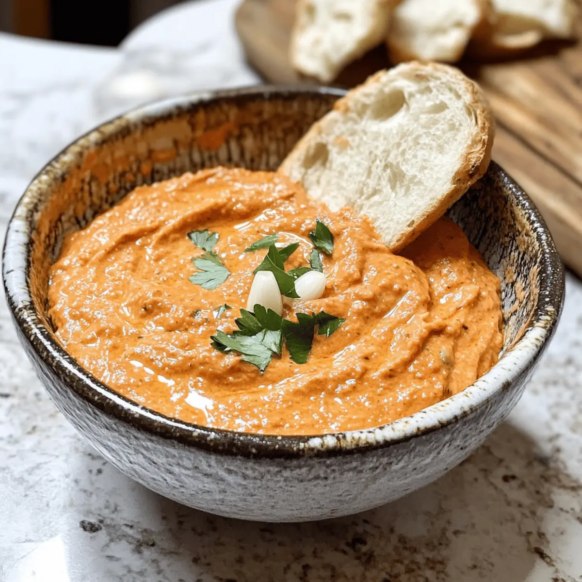 Als ich neulich bei einem Freund zu Besuch war, entdeckte ich einen Dip, der mich sofort begeisterte: die cremige Garlic Ajvar Dip! Die perfekte Kombination aus aromatischem Knoblauch und der warmen Note von Ajvar macht diesen Aufstrich einfach unwiderstehlich. Und das Beste? Die Zubereitung ist kinderleicht und erfordert nur wenige Minuten, sodass ihr mehr Zeit für eure Gäste habt. Dieser vegane Hit eignet sich nicht nur für Buffets, sondern kann auch ein köstlicher Begleiter zu frischem Baguette sein. Die Möglichkeit, den Dip einfach im Voraus zuzubereiten, ist ein weiterer Pluspunkt, der euch helfen wird, beim nächsten Treffen voll durchzustarten. Bist du bereit, diesen geschmackvollen Klassiker in deine Küche zu holen? Warum ist dieser Dip so besonders? Einfachheit: Die Zubereitung könnte nicht einfacher sein – nur ein paar Schritte und schon ist der Dip fertig für den Genuss! Vielseitigkeit: Ob frisch auf Baguette, als Aufstrich für Sandwiches oder als Dip für Gemüsesticks, dieser Ajvar-Aioli ist in jeder Form ein Genuss. Aromatische Harmonie: Die Kombination aus Knoblauch und Ajvar verleiht diesem Dip ein einzigartiges Geschmacksprofil, das einfach begeistert. Vorbereitung: Perfekt für Feiern, denn du kannst ihn einen Tag im Voraus zubereiten. So hast du mehr Zeit für deine Gäste! Vegan: Mit einer einfachen Umstellung auf veganer Mayonnaise wird dieser Dip auch für pflanzenbasierte Ernährungsweisen zur idealen Wahl. Wenn du ähnliche, köstliche Dips ausprobieren möchtest, schau dir auch die Blechkarotten Pommes Aioli an! Ajvar-Aioli Zutaten Für die Basis Mayonnaise (oder vegane Salatsahne) – sorgt für Cremigkeit und Reichhaltigkeit; für eine leichtere Variante kann griechischer Joghurt verwendet werden. Ajvar (mild, z.B. Dittmann) – verleiht Wärme und leichte Süße; kann weggelassen oder durch sonnengetrocknete Tomaten ersetzt werden. Für den Geschmack Knoblauch (3-4 Zehen, gepresst) – sorgt für Würze und Tiefe; die Menge kann nach persönlichem Geschmack angepasst werden; gerösteter Knoblauch mildert den Geschmack. Paprikapulver (1 TL edelsüß) – fügt Farbe und milde Schärfe hinzu; optional und kann bei Bedarf weggelassen werden. Salz – verstärkt den Gesamtgeschmack; nach Belieben anpassen. Dieser Ajvar-Aioli ist der perfekte Dip für jede Feier und bringt jeden zum Schwelgen! Schritt-für-Schritt-Anleitung für Ajvar-Aioli Step 1: Zutaten vorbereiten Bereite alle Zutaten vor, indem du 3-4 Knoblauchzehen schälst und presst. In einer Schüssel kombinierst du dann 200 g Mayonnaise oder vegane Salatsahne mit 2-3 EL Ajvar. Achte darauf, dass alles gut sichtbar in der Schüssel ist, bevor du mit dem nächsten Schritt fortfährst. Step 2: Alle Zutaten vermischen Nutze einen Löffel oder einen Schneebesen, um die Mischung aus Mayonnaise, Ajvar und gepresstem Knoblauch gründlich zu verrühren. Rühre so lange, bis eine cremige und gleichmäßige Konsistenz erreicht ist, was etwa 2-3 Minuten dauern sollte. Achte darauf, dass keine Klumpen mehr sichtbar sind. Step 3: Mit Gewürzen abschmecken Füge einen Teelöffel edelsüßes Paprikapulver und etwas Salz nach Geschmack hinzu. Vermenge alles erneut, bis die Gewürze gleichmäßig verteilt sind. Probieren ist hier wichtig! Das Ajvar-Aioli sollte eine harmonische Balance aus den Aromen von Knoblauch und Ajvar aufweisen. Step 4: Dip kühlen Decke die Schüssel mit Frischhaltefolie ab und stelle sie für mindestens 24 Stunden in den Kühlschrank. Dies ermöglicht, dass die Aromen gut miteinander verschmelzen und der Dip eine optimale Geschmackstiefe erreicht. Falls du es über Nacht kühlen lässt, kannst du die Vorfreude steigern! Step 5: Servieren Vor dem Servieren nimm die Schüssel aus dem Kühlschrank und rühre das Ajvar-Aioli nochmals gut durch. Es sollte kühl und cremig sein, bereit, um mit frisch geschnittenem Baguette, Crackern oder Gemüsesticks genossen zu werden. Stelle sicher, dass es gut aussieht, bevor du es ans Buffet bringst. Expertentipps für Ajvar-Aioli Dipp-Konsistenz: Achte darauf, dass alle Zutaten gut vermischt sind, um eine glatte und cremige Konsistenz zu erreichen. Klumpen sollten vermieden werden. Vorbereitung ist alles: Bereite das Ajvar-Aioli mindestens 24 Stunden im Voraus zu, damit die Aromen richtig verschmelzen können. Geduld zahlt sich aus! Geschmack anpassen: Probiere den Dip, bevor du ihn servierst! So kannst du Salz und Gewürze nach deinem persönlichen Geschmack anpassen, um die perfekte Balance zu finden. Variationen ausprobieren: Experimentiere mit verschiedenen Geschmäckern, indem du gerösteten Knoblauch oder frische Kräuter hinzufügst. So machst du dein Ajvar-Aioli noch einzigartiger! Optimal lagern: Bewahre übrig gebliebenes Ajvar-Aioli in einem luftdichten Behälter im Kühlschrank auf. So bleibt es bis zu einer Woche frisch und lecker. Was passt zu Garlic Ajvar Dip? Dieser köstliche Dip entfaltet sein volles Potenzial, wenn er mit den richtigen Beilagen kombiniert wird. Frisches Baguette: Das Herzstück jeder Dip-Erfahrung – weiches, warmes Baguette ist perfekt zum Eintunken und sorgt für eine harmonische Kombination. Knusprige Cracker: Ihre knusprige Textur ergänzt die Cremigkeit des Dips wunderbar und macht jeden Bissen zu einem genussvollen Erlebnis. Rohkost-Platte: Eine Mischung aus knackigem Gemüse wie Karotten und Paprika bringt Frische und Farbe auf den Tisch – ideal und gesund! Mediterrane Gemüseplatte: Gegrillte Zucchini, Paprika und Auberginen harmonieren perfekt mit dem Ajvar-Aioli und verleihen dem Snackbuffet einen mediterranen Touch. Veganer Brotaufstrich: Für eine abwechslungsreiche Kreation, kombiniere den Dip als Aufstrich mit Brot oder Wraps, verfeinert mit frischen Kräutern. Eiskalte Getränke: Ein spritziger Weißwein oder prickelnde Limonade sorgt für den perfekten Ausklang und hebt die Aromen des Dips hervor. Fruchtige Nachspeise: Frischer Obstsalat oder ein Sorbet bieten einen süßen Abschluss und kontern die 