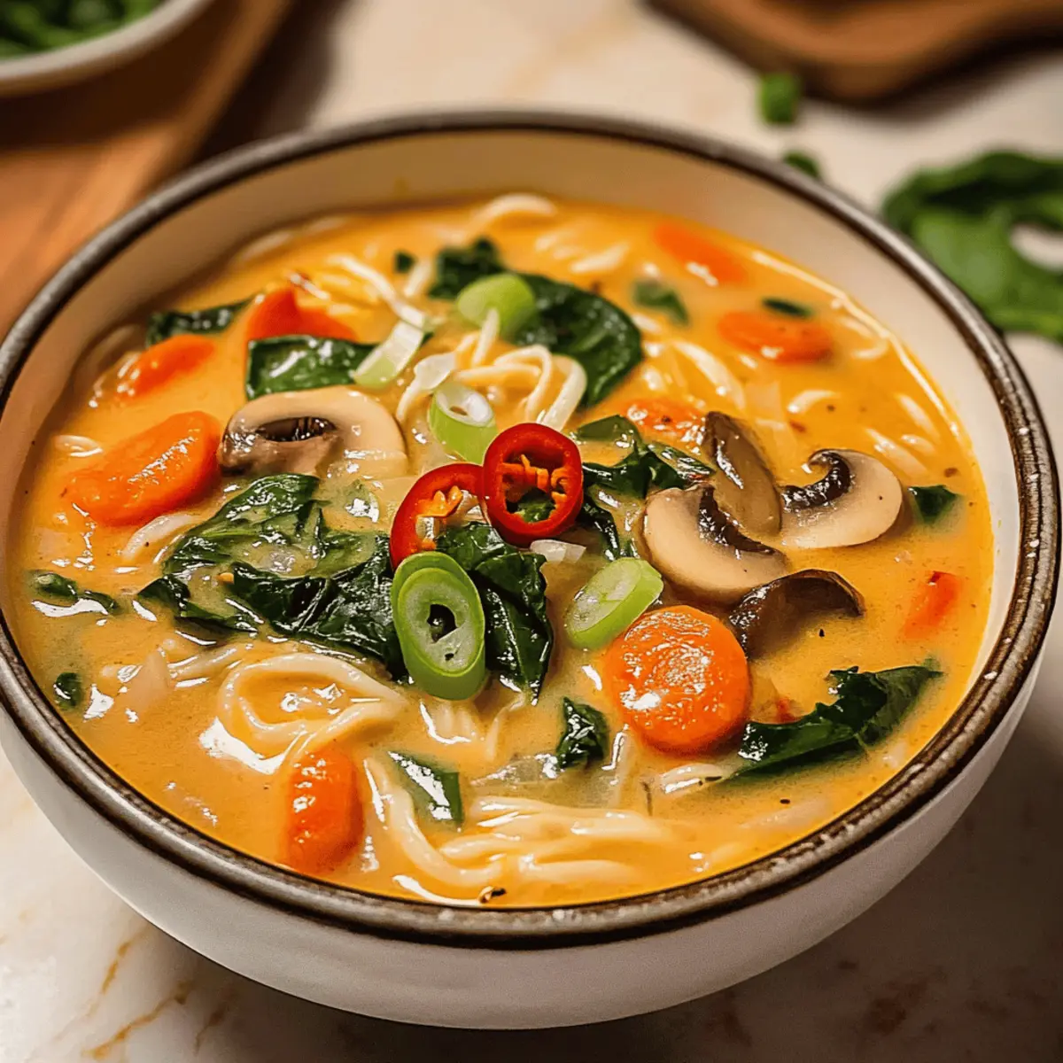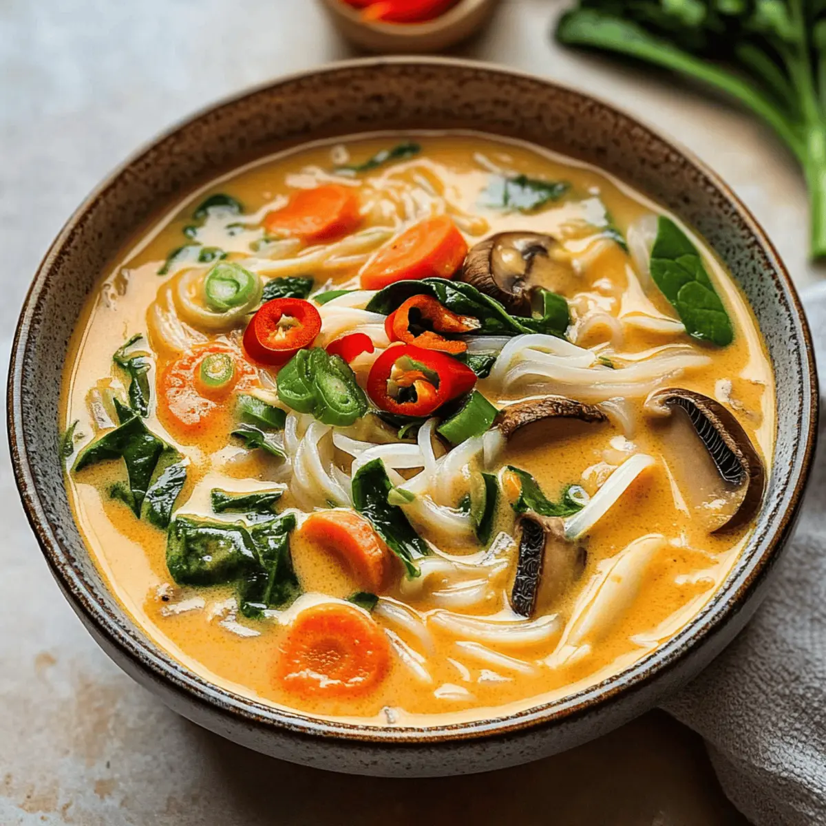 Die Aromen Asiens steigen in die Luft, während ich die ersten Schritte zur Zubereitung meiner Asiatischen Kokos-Curry-Suppe mit Reisnudeln gehe. Diese köstliche, vegane Suppe vereint cremige Kokosmilch, zarte Reisnudeln und frisches Gemüse wie Champignons, Karotten und Spinat. Perfekt für alle, die in der Küche schnell etwas Leckeres zaubern möchten! Mit ihrer schnellen Zubereitung wird diese Suppe zum idealen Begleiter, ob bei kaltem Wetter oder für eine leichte Mahlzeit im Sommer. Sie lässt sich ganz nach Ihrem Geschmack anpassen und bietet Raum für kreative Variationen. Neugierig, wie Sie Ihre eigene Schüssel voller aromatischer Glückseligkeit zubereiten können? Lassen Sie sich von diesem Rezept inspirieren! Warum werden Sie dieses Rezept lieben? Einfachheit: Die Zubereitung der Asiatischen Kokos-Curry-Suppe ist kinderleicht! Mit nur wenigen Schritten und übersichtlichen Zutaten gelingt Ihnen ein köstliches Gericht in kurzer Zeit. Vielseitigkeit: Dieses Rezept lädt zur Anpassung ein. Experimentieren Sie mit unterschiedlichen Gemüsesorten oder passen Sie die Schärfe der Currypaste an, um die perfekte Schale nach Ihrem Geschmack zu kreieren. Aromatischer Genuss: Die Kombination aus cremiger Kokosmilch und frisch gehacktem Gemüse schafft ein Paradebeispiel für asiatische Aromen und sorgt für ein Geschmackerlebnis, das sowohl herzhaft als auch frisch ist. Gesund und nahrhaft: Jede Portion liefert wichtige Nährstoffe und hat nur etwa 385 Kalorien – ideal für eine leichte und gesunde Mahlzeit. Perfekt für jeden Anlass: Ob als schnelles Mittagessen oder als herzhaftes Abendessen – diese Suppe wird Ihre Familie und Freunde begeistern und ist der Star Ihres nächsten gemeinsamen Essens! Asiatische Kokos-Curry-Suppe Zutaten Für die Suppe • Knoblauchzehe – sorgt für ein aromatisches Geschmackserlebnis, kann bei Bedarf durch Knoblauchpulver ersetzt werden. • Ingwer (10-20 g) – bringt Wärme und Würze, kann durch gemahlenen Ingwer für einen milderen Geschmack substituiert werden. • Kokosöl (10 g) – perfekt zum Anbraten, verstärkt den Kokosgeschmack; mit Pflanzenöl austauschbar. • Gemüse-Gewürzpaste (10 g) – fügt Tiefe hinzu, hausgemachte Gemüsebrühe ist ein guter Ersatz. • Rote Currypaste (20 g) – verleiht der Suppe Schärfe; je nach gewünschter Intensität anpassen. • Möhren (2 Stück) – für Süße und Textur, können durch Paprika oder Zucchini ersetzt werden. • Champignons (150 g) – sorgt für einen umami Geschmack; beliebige Pilze können verwendet werden. • Wasser (500 g) – bildet die Basis der Suppe, Gemüsebrühe für mehr Geschmack nutzen. • Kokosmilch (400 g) – sorgt für Cremigkeit und Reichtum; kein Ersatz empfohlen für authentischen Geschmack. • Reisbandnudeln (100 g) – die Hauptkohlenhydrate, können durch Glasnudeln oder Quinoa ersetzt werden. • ½ Limette – sorgt für die nötige Säure; frischen Limettensaft für den besten Geschmack verwenden. • Junger Spinat (30 g) – für die Nährstoffe; Bok Choy ist eine gute Alternativwahl. • Frühlingszwiebeln (2 Stück, Ringe) – halten die Suppe frisch und knusprig; optional als Garnitur. • Chili (1 Stück) – verleiht Schärfe; die Menge nach Geschmack anpassen. Step-by-Step Instructions für Asiatische Kokos-Curry-Suppe mit Reisnudeln Step 1: Knoblauch und Ingwer vorbereiten Schälen Sie die Knoblauchzehe und den Ingwer und schneiden Sie sie in kleine Stücke. Geben Sie diese in den Thermomix und stellen Sie ihn auf Stufe 8 für 3 Sekunden ein, um die Zutaten zu zerkleinern. Achten Sie darauf, dass sie gut gehackt sind und eine aromatische Basis für die Asiatische Kokos-Curry-Suppe bieten. Step 2: Öle und Gewürze anbraten Fügen Sie 10 g Kokosöl, 10 g Gemüse-Gewürzpaste und 20 g rote Currypaste in den Thermomix hinzu. Sautieren Sie die Mischung bei 120°C für 2 Minuten ohne Messbecher, bis die Aromen intensiv werden. Die Gewürze sollten zu duften beginnen und eine schöne goldene Farbe annehmen. Step 3: Gemüse hinzufügen Geben Sie nun 2 in Scheiben geschnittene Möhren und 150 g viertelierte Champignons zu der angebratenen Gewürzmischung in den Thermomix. Sautieren Sie das Gemüse für weitere 2 Minuten bei 120°C mit umgekehrter Rotation, um die zarten Texturen zu bewahren. Die Möhren sollten leicht weich, aber noch knackig sein. Step 4: Brühe und Kokosmilch hinzufügen Gießen Sie 500 g Wasser und 400 g Kokosmilch in den Thermomix. Stellen Sie die Temperatur auf 100°C ein und lassen Sie die Mischung 12 Minuten bei umgekehrter Rotation kochen, während Sie den Simmerkorb als Spritzschutz verwenden. Achten Sie darauf, dass die Suppe gleichmäßig und sanft köchelt. Step 5: Reisnudeln und Limettensaft hinzufügen Fügen Sie nun 100 g Reisbandnudeln und den Saft von ½ Limette in die Suppe ein. Kochen Sie alles für zusätzliche 6 Minuten bei 100°C und verwenden Sie die sanfte Rührfunktion. Die Nudeln sollten weich, aber nicht zu sehr verkocht sein und herrlich mit der cremigen Suppe harmonieren. Step 6: Spinat unterrühren Streuen Sie 30 g frischen, jungen Spinat direkt in die Suppe und lassen Sie ihn für 2 Minuten bei 100°C unter sanftem Rühren ziehen. Der Spinat sollte geschrumpft und zart sein, und seine leuchtend grüne Farbe wird der Suppe ein frisches Aussehen verleihen. Step 7: Servieren Servieren Sie Ihre Asiatische Kokos-Curry-Suppe mit Reisnudeln heiß. Garnieren Sie die Suppe nach Belieben mit geschnittenen Frühlingszwiebeln und einer Prise Chili. Die tollen Farben und der aromatische Duft werden sicher Ihre Familie und Freunde begeistern! Was passt gut zur Asiatischen Kokos-Curry-Suppe mit Reisnudeln? Lassen Sie sich von diesen köstlichen Begleitgerichten inspirieren, um Ihre Mahlzeit zu vervollständigen und ein harmonisches Geschmackserlebnis zu schaffen. Knuspriges Baguette: Perfekt zum Dippen in die cremige Suppe, bringt es eine knusprige Textur ins Spiel. Genießen Sie die Kombination aus Wärme und Knuspr