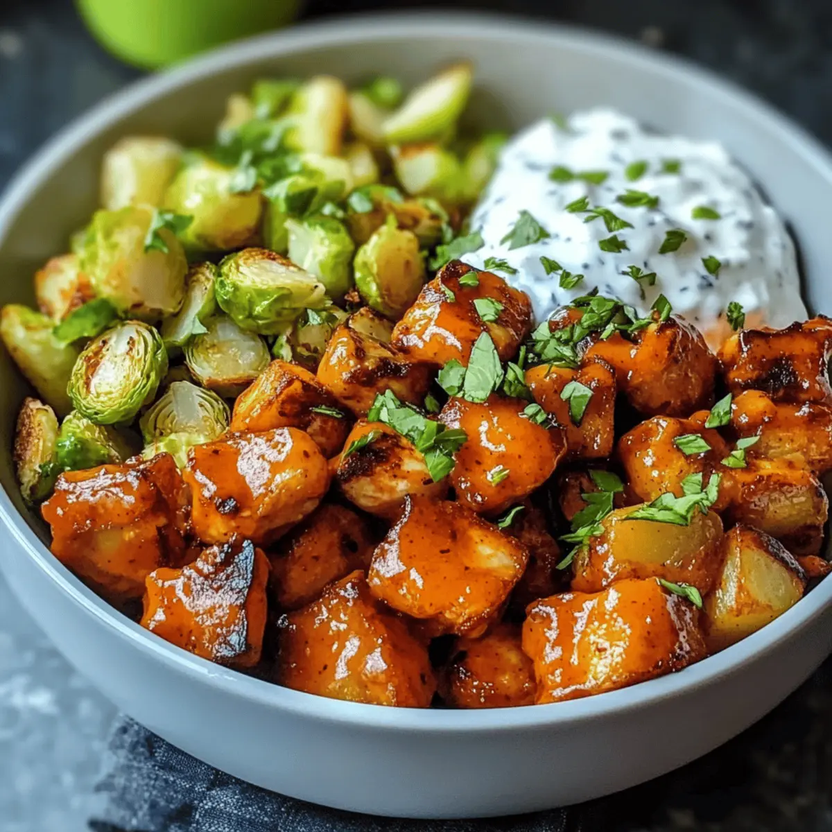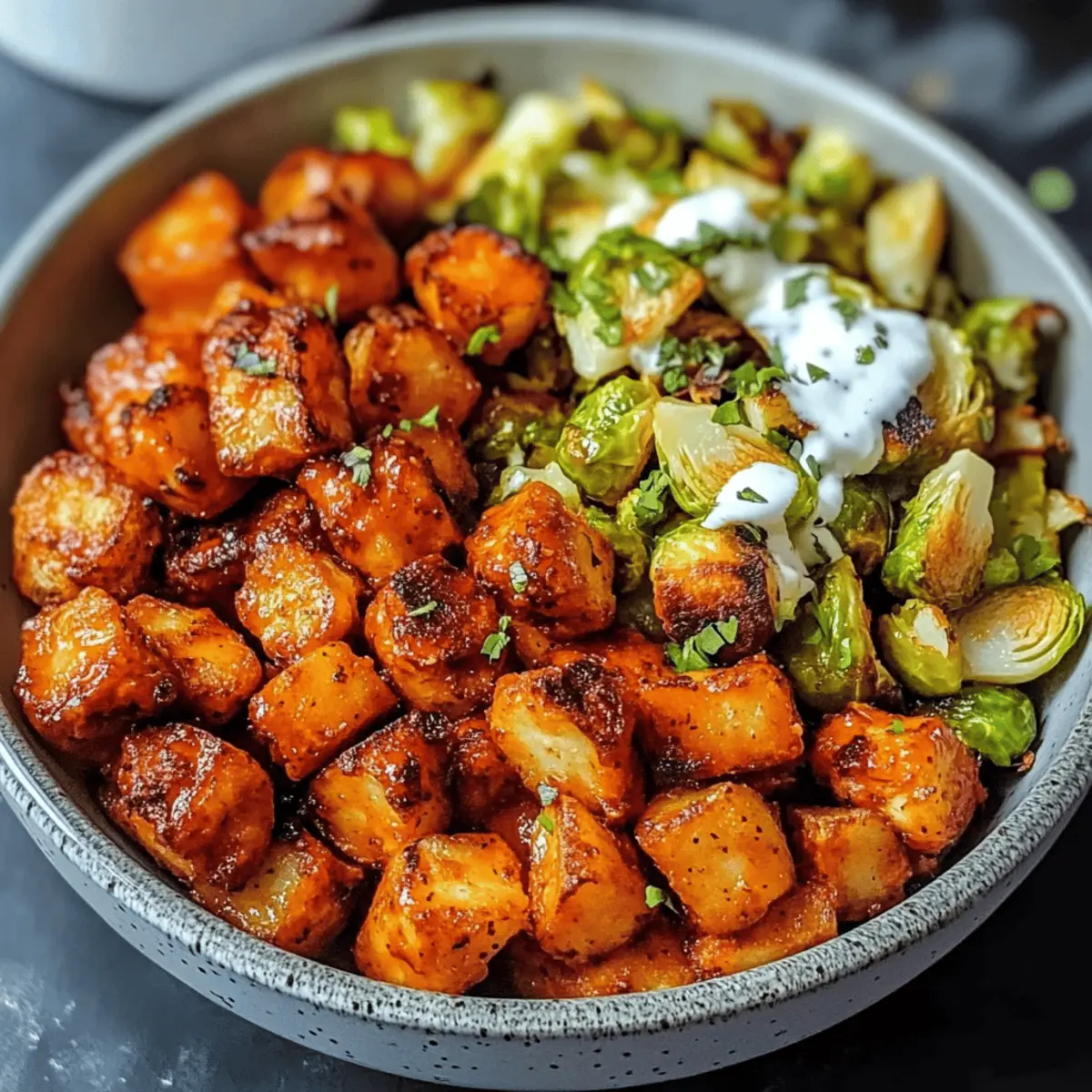 Als ich neulich in meiner Küche stand und das Aroma von knusprigen Kartoffeln und würzigen Buffalo Chicken Bites wahrnahm, wusste ich, dass das Abendessen etwas ganz Besonderes sein würde. Diese Buffalo Bites Schüssel mit knusprigen Kartoffeln und gehobelten Rosenkohl vereint auf genussvolle Weise gesunde Zutaten und kräftige Aromen in einem einzigen Gericht. Perfekt für hektische Wochentage oder entspannte Wochenendabende, begeistert diese Schüssel nicht nur durch ihren Geschmack, sondern sorgt auch für eine ausgewogene Ernährung. Die Kombination aus saftigen Buffalo-Bissen, knackigen Kartoffeln und zarten Rosenkohlblättern macht diese Mahlzeit zu einer echten Geschmacksexplosion. Ganz gleich, ob du ein leidenschaftlicher Hobbykoch bist oder einfach nur Lust auf etwas Gesundes hast, diese Schüssel hat alles, was du brauchst. Bist du bereit, mit mir in die Welt der würzigen Leckereien einzutauchen? Warum wirst du diese Schüssel lieben? Einzigartiger Geschmack: Die Kombination aus würzigen Buffalo Chicken Bites und knusprigen Kartoffeln sorgt für eine Geschmacksexplosion, die jeden begeistert. Gesund und nahrhaft: Mit dieser Schüssel erhältst du eine ausgewogene Mahlzeit, die reich an Protein und Ballaststoffen ist. Einfache Zubereitung: Ideal für hektische Wochentage, da alle Zutaten schnell und unkompliziert zubereitet werden können. Vielseitige Optionen: Du kannst die Zutaten nach Belieben anpassen, zum Beispiel Tofu statt Hähnchen verwenden oder andere Gemüsesorten hinzufügen, um Abwechslung zu schaffen. Perfekt zum Meal Prepping: Bereite die Komponenten im Voraus zu und genieße gesunde Mahlzeiten in der ganzen Woche! Schau dir auch meine Tipps für Meal Prep-Rezepte an, um noch mehr Ideen zu sammeln. Buffalo Bites Schüssel Zutaten • Auf der Suche nach gesunden und köstlichen Zutaten für deine Buffalo Bites Schüssel? Hier sind sie! Für die Buffalo Chicken Bites Hähnchenbrust – Eine exzellente Proteinquelle, die perfekt die würzige Buffalo-Sauce aufnimmt. Buffalo-Sauce – Für die charakteristische pikante Note; achte darauf, eine milchfreie Variante zu wählen, wenn nötig. Für die Kartoffeln Russet-Kartoffeln – Sie bieten eine herzhafte Basis; Süßkartoffeln sind eine süßere, gesündere Alternative. Für die Rosenkohl Rosenkohl – Sorgt für einen erdigen Geschmack und einen schönen Crunch, besonders wenn er geröstet wird. Kann durch grüne Bohnen oder Kohl ersetzt werden. Für das Dressing (optional) Ranch-Dressing – Fügt Cremigkeit hinzu; wähle eine milchfreie Version, wenn du möchtest. Mit diesen Zutaten ist deine Buffalo Bites Schüssel mit knusprigen Kartoffeln und gehobelten Rosenkohl im Nu zubereitet! Step-by-Step Instructions für Buffalo Bites Schüssel mit knusprigen Kartoffeln und gehobelten Rosenkohl Step 1: Zutaten vorbereiten Wasche die Russet-Kartoffeln gründlich und schneide sie in gleichmäßige Würfel. Trimme die Enden der Rosenkohl und schneide sie in feine Scheiben. Achte darauf, dass die Kartoffeln gleichmäßig geschnitten sind, um ein konsistentes Garen zu gewährleisten. Lege die vorbereiteten Zutaten beiseite, während du den Ofen vorheizt. Step 2: Kartoffeln rösten Heize den Ofen auf 220°C (425°F) vor. Lege die gewürfelten Kartoffeln auf ein Backblech, das mit Backpapier ausgelegt ist. Brate die Kartoffeln für 25-30 Minuten, bis sie goldbraun und knusprig sind. Wende die Kartoffeln nach der Hälfte der Zeit, um eine gleichmäßige Röstung zu erzielen und die perfekte Textur zu erreichen. Step 3: Buffalo Chicken Bites zubereiten Erhitze eine große Pfanne bei mittlerer Hitze und füge die Buffalo Chicken Bites hinzu. Brate sie unter regelmäßigem Wenden, bis sie vollständig durchgegart sind und eine knusprige Außenseite haben, etwa 7-10 Minuten. Achte darauf, dass sie schön mit der Buffalo-Sauce überzogen sind, um den charakteristischen Geschmack in der Buffalo Bites Schüssel zu intensivieren. Step 4: Rosenkohl anbraten In der gleichen Pfanne, in der die Chicken Bites zubereitet wurden, füge die gehobelten Rosenkohl hinzu. Brate sie bei mittlerer Hitze für etwa 5-7 Minuten, bis sie zart und leicht karamellisiert sind. Rühre gelegentlich um, um eine gleichmäßige Bräunung zu erreichen. Dies wird der Buffalo Bites Schüssel eine schöne Tiefe und einen köstlichen Crunch verleihen. Step 5: Schüssel zusammenstellen Sobald alle Komponenten fertig sind, nimm eine große Schüssel und beginne mit dem Schichten. Lege zuerst die knusprigen Kartoffeln als Basis, gefolgt von den Buffalo Chicken Bites und schließlich den karamellisierten Rosenkohl. Wenn gewünscht, träufle etwas Ranch-Dressing über die Schüssel, um eine cremige Komponente hinzuzufügen. Serviere die Buffalo Bites Schüssel sofort und genieße jeden Bissen! Expert Tips für die Buffalo Bites Schüssel Gleichmäßige Kartoffelwürfel: Achte darauf, die Kartoffeln in gleichmäßige Stücke zu schneiden, damit sie gleichmäßig garen und knusprig werden. Überwachen der Hähnchenbites: Halte das Hähnchen beim Braten im Auge; übercooked Chicken ist trocken. Ideal ist, wenn es saftig und zart bleibt. Rosenkohl gleichmäßig schneiden: Verwende eine Mandoline, um die Rosenkohl gleichmäßig zu hobeln. So wird alles gleichmäßig gar und hat die beste Textur. Dressing anpassen: Wenn du ein milchfreies Ranch-Dressing verwendest, überprüfe die Zutaten, um sicherzustellen, dass es deinem Geschmack entspricht. Gemüsevariationen einbauen: Experimentiere mit weiteren Gemüsesorten, wie Paprika oder Karotten, um der Buffalo Bites Schüssel zusätzliche Farben und Nährstoffe hinzuzufügen. Buffalo Bites Schüssel Variationen Lass deiner Kreativität freien Lauf und passe diese leckere Buffalo Bites Schüssel ganz nach deinem Geschmack an! Vegetarisch: Tausche das Hähnchen gegen Tofu oder Tempeh aus, um eine pflanzliche Proteinquelle zu genießen. So bleibt das Gericht köstlich und nahrhaft. Süßkartoffeln: Verwende Süßkartoffeln anstell
