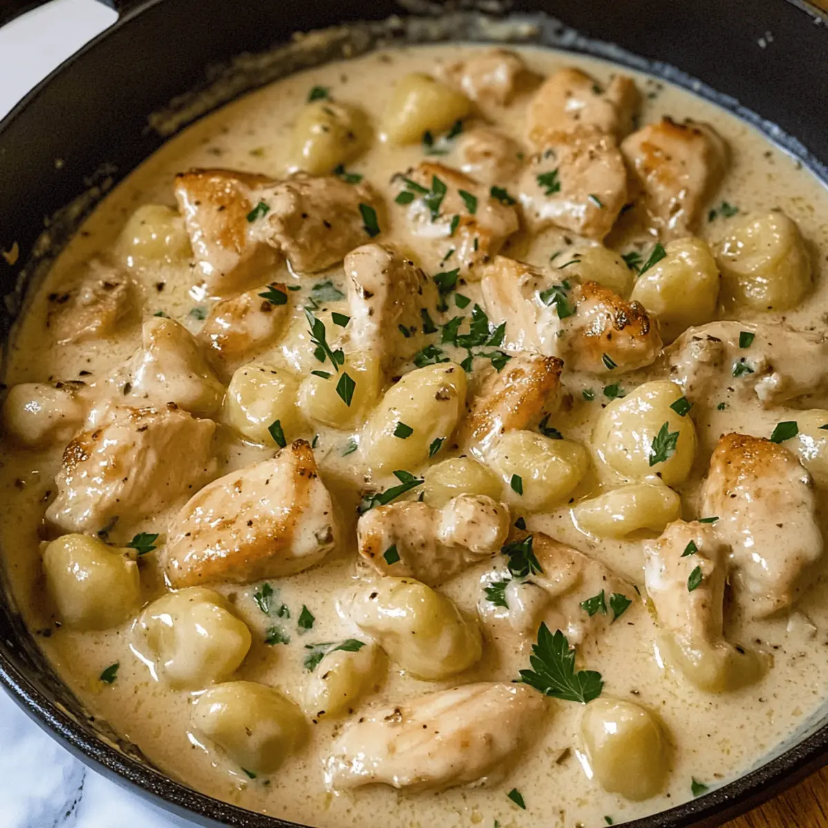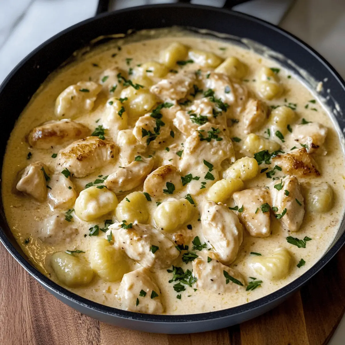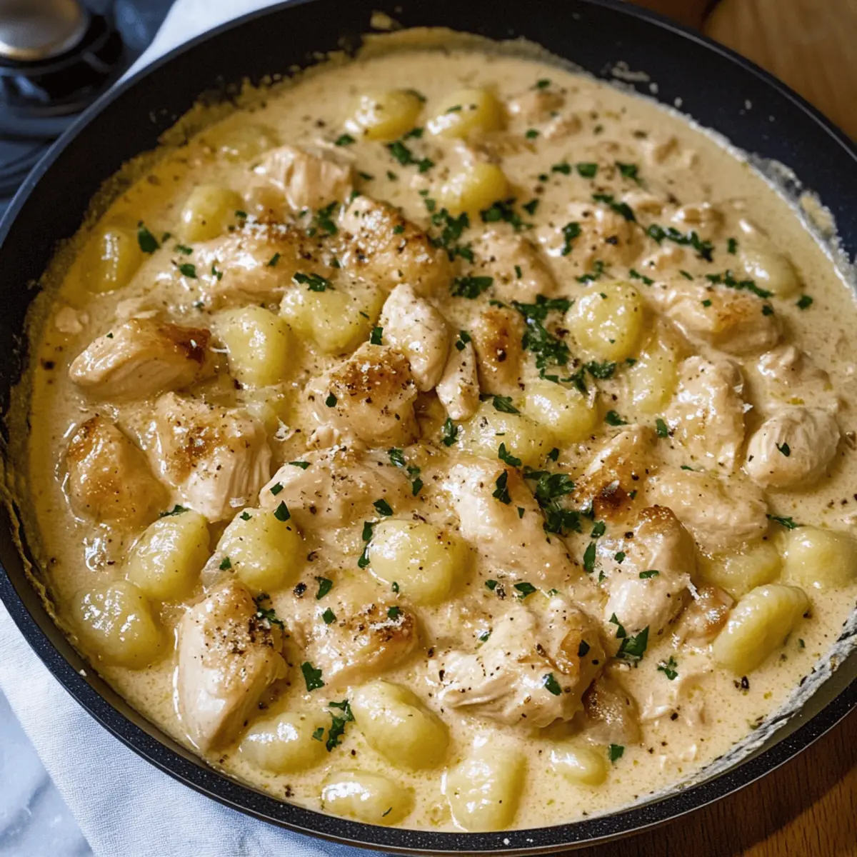 Es war ein hektischer Wochentag, als ich im Kühlschrank nach etwas suchte, das schnell und schmackhaft zu zaubern wäre. Genau in diesem Moment fiel mein Blick auf die Gnocchi – und da wusste ich, dass ich ein Rezept für Cremige Knoblauch-Hähnchen-Gnocchi kreieren musste. Diese Kombination aus zaftigen Hähnchenstücken und den zarten, weichen Gnocchi in einer reichhaltigen, cremigen Soße ist der Inbegriff von Komfortessen. In weniger als 30 Minuten zauberst du ein Gericht, das nicht nur die ganze Familie begeistert, sondern auch für romantische Abende geeignet ist. Und das Beste daran? Es kommt alles in einer Pfanne zusammen, sodass der Abwasch minimal bleibt. Neugierig, wie dieses Wohltat auf deinem Teller aussehen könnte? Lass uns gleich ins Detail gehen! Warum wirst du dieses Rezept lieben? Köstlicher Komfort: Dieses Gericht vereint zartes Hähnchen und flauschige Gnocchi in einer unwiderstehlich cremigen Soße, die deine Geschmacksknospen verwöhnen wird. Einfachheit in der Zubereitung: Mit nur einer Pfanne ist die Zubereitung unkompliziert, perfekt für hektische Wochentage. Familienfreundlich: Dieses Rezept ist optimal für die ganze Familie, es wird sicherlich bei großen und kleinen Essern hervorragend ankommen. Vielseitigkeit: Du kannst es nach Belieben anpassen, indem du zum Beispiel frisches Gemüse wie Spinat hinzufügst oder die Sahne durch griechischen Joghurt ersetzt. Schnell zubereitet: In weniger als 30 Minuten hast du ein köstliches Essen auf dem Tisch, ideal für spontane Dinnerabende. Für mehr leckere Vorschläge, schau dir auch unser Knoblauch Haehnchen Brokkoli oder die Cremige Knoblauch Rindfleisch Pasta an! Cremige Knoblauch-Hähnchen-Gnocchi Zutaten • Für ein unwiderstehliches Geschmackserlebnis, hier die Zutaten. Für das Hähnchen Hähnchenschenkel ohne Knochen und Haut – sorgt für zarten Geschmack; du kannst auch Hähnchenbrust für eine magerere Variante verwenden. Allzweckmehl – verleiht eine schöne Textur und Knusprigkeit; Vollkornmehl ist eine gute Alternative. Salz – hebt die Aromen hervor; unverzichtbar. Schwarzer Pfeffer – fügt der Speise Würze hinzu; wichtig für den Geschmack. Paprika – sorgt für leichte Schärfe und Farbe; optional für zusätzlichen Geschmack. Olivenöl – beim Braten sorgt es für Geschmack; kann durch Pflanzenöl ersetzt werden. Butter – für zusätzliche Reichhaltigkeit in der Soße; mehr Olivenöl für eine leichtere Option verwenden. Für die Soße Schalotten – geben einen milden Zwiebelgeschmack; auch Zwiebeln sind ein guter Ersatz. Knoblauch – entscheidend für den Geschmack; frisch ist am besten. Weißen Kochwein – bringt Säure und Tiefe; für eine alkoholfreie Version Hühnerbrühe verwenden. Low-Sodium Hühnerbrühe – sorgt für den Soßengeschmack; Gemüsebrühe ist eine vegetarische Option. Schlagsahne – für die cremige Konsistenz; kann auch durch Halbfett-Creme ersetzt werden. Frische Thymianblätter – ergänzen das Aroma; getrockneter Thymian kann verwendet werden, Menge auf 1 TL reduzieren. Geriebener Parmesan – bereichert die Soße; Pecorino Romano ist ebenfalls ein Ersatz. Für die Gnocchi und Garnitur Haltbare Mini-Kartoffelgnocchi – sind die Hauptquelle für Kohlenhydrate und garen in der Soße; normale Gnocchi funktionieren auch. Frische Petersilie – sorgt für den letzten Schliff; ist optional. Genieße die Zubereitung deiner Cremigen Knoblauch-Hähnchen-Gnocchi und lass dich von diesem Komfortessen begeistern! Schritt-für-Schritt-Anleitung für Cremige Knoblauch-Hähnchen-Gnocchi Step 1: Hähnchen vorbereiten Die Hähnchenschenkel in mundgerechte Stücke schneiden und in einer Schüssel mit Allzweckmehl, Salz, Pfeffer und Paprika gut vermengen. In einer tiefen Pfanne Olivenöl bei mittlerer Hitze erhitzen. Das gewürzte Hähnchen für etwa 8 Minuten auf jeder Seite braten, bis es goldbraun und durchgegart ist (mindestens 74 °C). Anschließend das Hähnchen aus der Pfanne nehmen und beiseite stellen. Step 2: Aromaten anbraten In derselben Pfanne die Hitze etwas reduzieren und die Butter hinzufügen. Die gehackten Schalotten darin etwa 3 Minuten anbraten, bis sie weich und glasig sind. Dann den zerdrückten Knoblauch hinzufügen und für weitere 1-2 Minuten mitbraten, bis dieser aromatisch duftet. Achte darauf, dass der Knoblauch nicht anbrennt, da er sonst bitter wird. Step 3: Pfanne ablöschen Den weißen Kochwein in die Pfanne gießen und die Röststoffe vom Boden mit einem Holzlöffel abkratzen. Lass die Mischung für etwa 3 Minuten köcheln, bis der Alkohol verdampft und der Wein nahezu vollständig reduziert ist. Der Pfannenboden sollte schön glänzen und die Aromen intensiv. Step 4: Soße zubereiten Jetzt 1½ Tassen Hühnerbrühe und die frischen Thymianblätter in die Pfanne geben. Die Mischung zum Kochen bringen und 2-3 Minuten köcheln lassen, um die Aromen zu vereinen. Anschließend die Schlagsahne einrühren und mixen, bis die Soße gleichmäßig und cremig ist. Sie sollte einen schönen, leicht dickflüssigen Charakter haben. Step 5: Gnocchi kochen Die ungekochten Mini-Kartoffelgnocchi in die Soße geben, die Pfanne abdecken und die Gnocchi bei mittlerer Hitze 6-7 Minuten garen lassen. Rühre gelegentlich um, bis die Gnocchi weich und die Soße gut eingedickt sind. Achte darauf, dass die Gnocchi nicht zu lange kochen, damit sie nicht matschig werden. Step 6: Gericht vollenden Langsam die restliche Hühnerbrühe und den geriebenen Parmesan in die Pfanne einrühren, bis die gewünschte Konsistenz erreicht ist. Das gebratene Hähnchen wieder in die Pfanne geben und alles zusammen erhitzen, bis das Hähnchen erwärmt ist. Die Soße sollte jetzt cremig und reichhaltig sein, die Gnocchi perfekt umhüllt. Step 7: Servieren Die Cremigen Knoblauch-Hähnchen-Gnocchi direkt nach dem Kochen auf Teller anrichten und nach Belieben mit frischer, gehackter Petersilie garnieren. Serviere das Gericht heiß, um die cremige Textur und die Aromen optimal zur Geltung