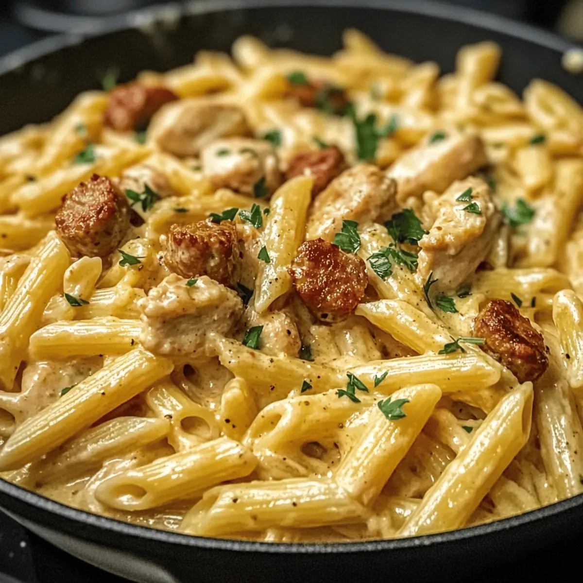 Cremige Pfeffer-Jack-Pasta vereint zartes Hähnchen und rauchige Wurst zu einem schnellen, leckeren Gericht voller Geschmack.