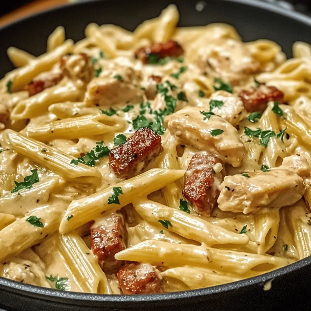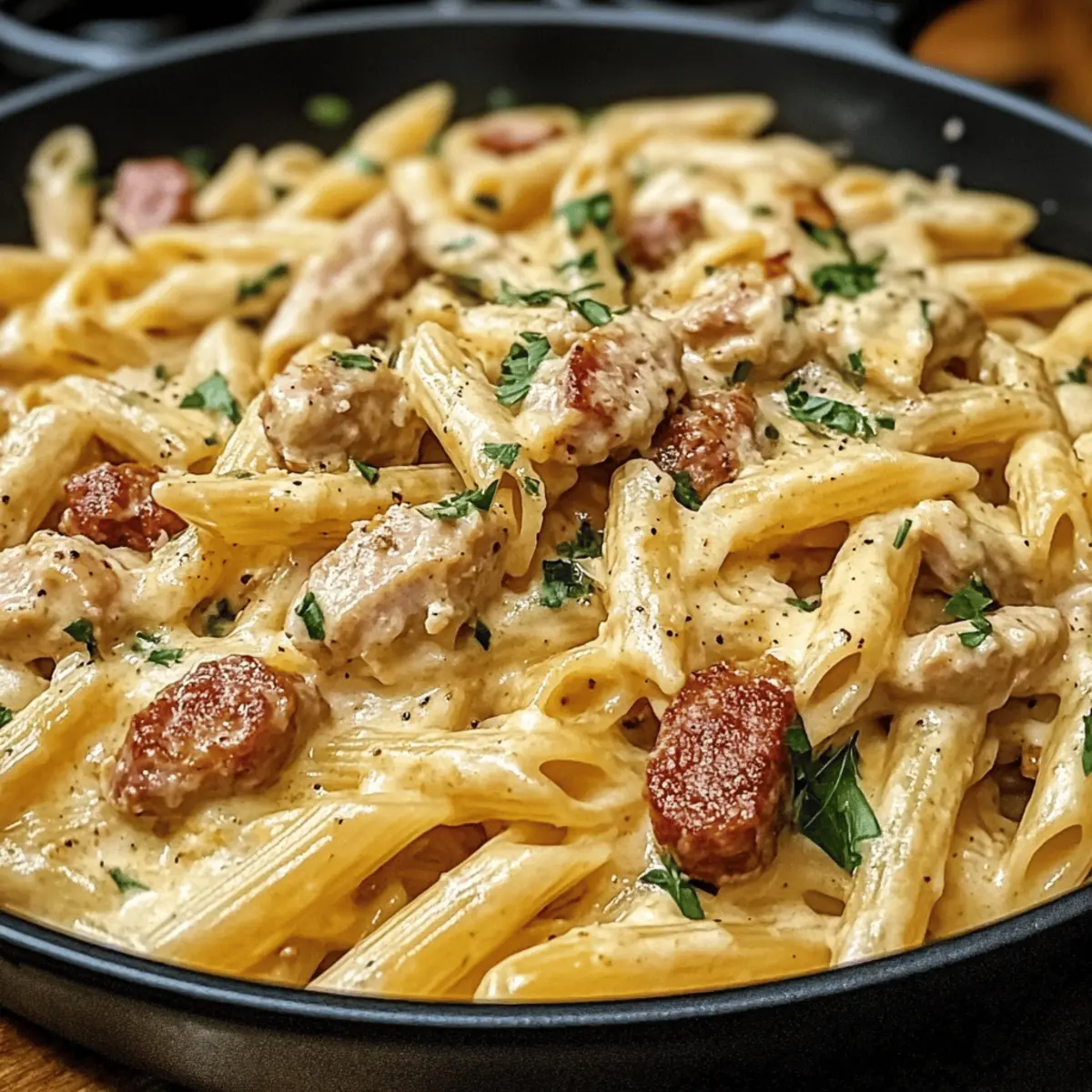 Geben Sie das angebratene Hähnchen, die Wurst und die gekochte Pasta in die Pfanne mit der cremigen Sauce. Vermengen Sie alles vorsichtig, sodass die Pasta gleichmäßig mit der Sauce überzogen ist. Lassen Sie das Gericht etwa 1-2 Minuten auf niedriger Hitze stehen, damit sich die Aromen verbinden und die Pasta die cremige Sauce aufnehmen kann.