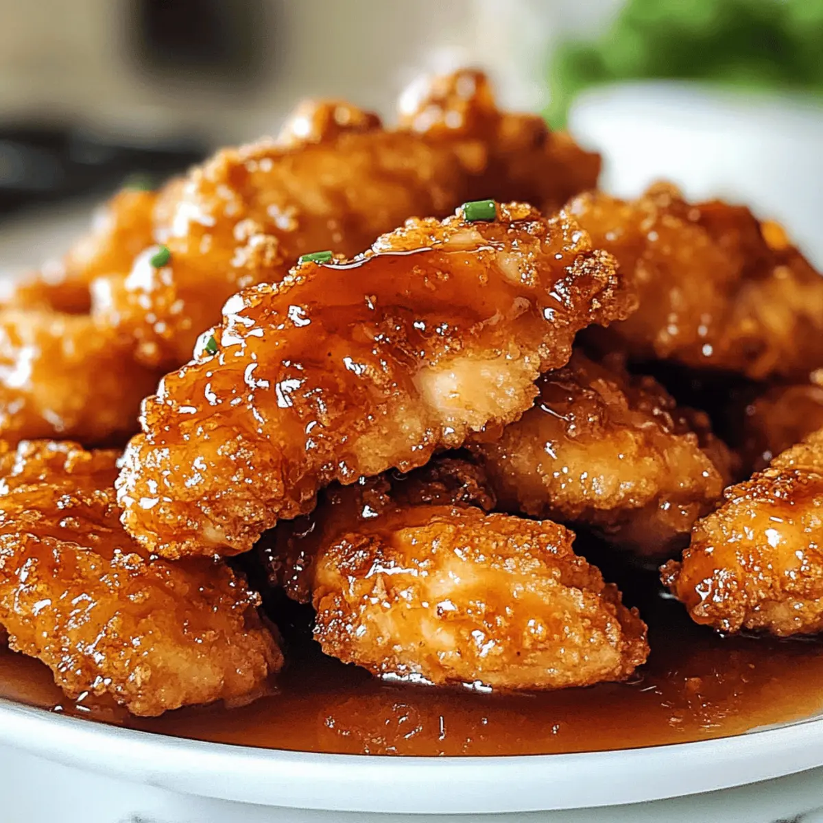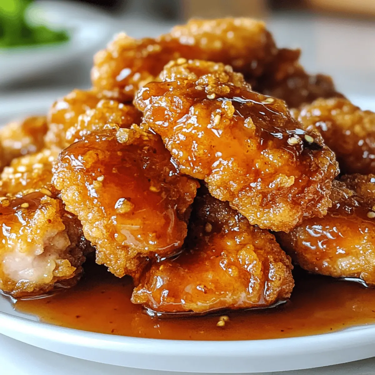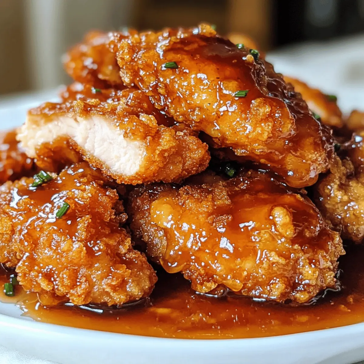 Es gibt Momente, in denen ein Gericht einfach alles verändert – wie dieses Rezept für Doppelt knuspriges Honig-Knoblauch-Hühnchen. Die Kombination aus einem knusprigen Äußeren und einer süßen, klebrigen Glasur ist einfach unwiderstehlich. Perfekt für ein schnelles Familienessen unter der Woche oder als Highlight bei einem besonderen Anlass, bietet dieses Rezept eine aufregende Abwandlung des klassischen Brathuhns mit asiatischen Aromen. Nicht nur, dass es kinderfreundlich ist und sicherlich alle begeistern wird, es lässt sich auch nach Belieben anpassen, um deinen persönlichen Geschmack zu treffen. Was hältst du davon, deine nächste Essensrunde mit einem Hauch von Crunch und Süße zu bereichern? Warum ist dieses Hühnchen besonders? Unwiderstehlicher Crunch: Jeder Bissen dieses Doppelt knusprigen Honig-Knoblauch-Hühnchens sorgt für eine fantastische knusprige Textur, die nicht nur den Gaumen erfreut, sondern auch das Auge anzieht. Süße und Würze: Die klebrige Glasur aus Honig und Knoblauch zaubert eine harmonische Balance aus süßen und herzhaften Aromen. Family-Friendly: Dieses Gericht ist ideal für die ganze Familie. Es vereint liebevolle Aromen und lässt sich leicht an die Vorlieben deiner Lieben anpassen. Schnell und Einfach: Mit wenigen Schritten kannst du ein unglaubliches Abendessen zaubern, das den Aufwand von Fast Food weit hinter sich lässt. Kreative Variationen: Du kannst alles anpassen, von zusätzlichen Gewürzen bis hin zu vegetarischen Alternativen wie Tofu – entdecke deine ganz eigene Version! Probier dazu mal eine Beilage wie gedämpften Reis oder frisches Gemüse, um das Gericht perfekt zu ergänzen. Doppelt knuspriges Honig-Knoblauch-Hühnchen Zutaten Für das Hühnchen • Hähnchenbrustfilets (oder Oberschenkel) – Zart und saftig, die perfekte Grundlage für das Frittieren. • Buttermilch – Macht das Hühnchen besonders zart und fügt einen milden, angenehm säuerlichen Geschmack hinzu. • Allzweckmehl – Gibt der Panade die gewünschte Knusprigkeit beim Frittieren. • Maisstärke – Wichtig für die Extra-Knusprigkeit der Panade; ist ein Muss, um wirklich das Doppelt knusprige Ergebnis zu erzielen. • Salz & schwarzer Pfeffer – Grundlegende Gewürze, die den Geschmack des Hähnchens heben. • Paprika, Knoblauchpulver, Zwiebelpulver, Cayennepfeffer – Sorgen für eine geschmackliche Tiefe und eine leichte Schärfe in der Kruste. • Pflanzenöl – Zum Frittieren erforderlich, um eine goldbraune und knusprige Oberfläche zu erzielen. Für die Glasur • Olivenöl – Grundlage für die Sauce, die dem Gericht zusätzlichen Geschmack verleiht. • Knoblauch (6 Zehen) – Sorgt für ein aromatisches Geschmacksprofil in der Glasur. • Honig – Für die Süße und die schöne Viskosität der Glasur. • Sojasauce – Fügt Umami und eine salzige Note hinzu, um die Aromen auszugleichen. • Schwarzer Pfeffer – Ergänzt die Süße der Sauce wunderbar. Die Kombination dieser Zutaten macht das Doppelt knusprige Honig-Knoblauch-Hühnchen zu einem echten Genuss, der sowohl Kinder als auch Erwachsene begeistert! Schritt-für-Schritt-Anleitung für Doppelt knuspriges Honig-Knoblauch-Hühnchen Step 1: Hühnchen marinieren Schneide die Hähnchenbrustfilets längs in zwei Hälften und lege sie in eine Schüssel mit Buttermilch. Stelle sicher, dass das Hühnchen vollständig bedeckt ist. Lasse es mindestens 1 Stunde oder besser noch über Nacht im Kühlschrank marinieren, damit es zart und saftig wird. Step 2: Panierung vorbereiten Mische in einer großen Schüssel das Allzweckmehl, die Maisstärke, Salz, Pfeffer, Paprika, Knoblauchpulver, Zwiebelpulver und Cayennepfeffer zusammen. Diese Mischung sorgt für die knusprige Panade des Doppelt knusprigen Honig-Knoblauch-Hühnchens. Stelle sicher, dass du die Zutaten gleichmäßig vermischst, um einen gleichmäßigen Geschmack zu gewährleisten. Step 3: Hühnchen panieren Nehme das marinierte Hühnchen aus der Buttermilch und lasse überschüssige Flüssigkeit abtropfen. Wälze jede Stücke gründlich in der Mehlmischung und drücke sie leicht an, damit die Panade gut haftet. Lege die panierten Stücke auf einen Teller oder ein Gitter und lasse sie kurz ruhen, damit die Panade an den Hähnchenstücken haftet. Step 4: Hühnchen frittieren Erhitze in einem großen Topf oder einer Fritteuse das Pflanzenöl auf 175°C (350°F). Frittierte die Hähnchenteile in kleinen Portionen für etwa 7-9 Minuten oder bis sie goldbraun und knusprig sind. Achte darauf, die Hähnchenteile nicht zu überladen, um eine gleichmäßige Garung zu gewährleisten. Nach dem Frittieren das Hühnchen auf einem Gitter abtropfen lassen. Step 5: Sauce zubereiten Für die Glasur erhitze in einem kleinen Topf das Olivenöl und füge den gehackten Knoblauch hinzu. Sauté den Knoblauch für etwa 1-2 Minuten, bis er goldbraun und aromatisch ist. Füge dann den Honig, die Sojasauce und den schwarzen Pfeffer hinzu und lasse die Mischung bei schwacher Hitze köcheln, bis sie leicht eingedickt ist. Step 6: Hühnchen glasieren Tauche oder bestreiche jedes Stück des knusprigen Hühnchens mit der heißen Honig-Knoblauch-Sauce direkt vor dem Servieren. Diese letzte Berührung verleiht deinem Doppelt knusprigen Honig-Knoblauch-Hühnchen den perfekten süßen und herzhaften Glanz, der jedem Bissen Geschmack verleiht. Was passt gut zu Doppelt knusprigem Honig-Knoblauch-Hühnchen? Ein vollendetes Menü bietet die perfekte Kombination von Aromen und Texturen, um das Geschmackserlebnis zu bereichern. Gedämpfter Reis: Er ist eine wunderbare Grundlage, die die süße Glasur des Hühnchens wunderbar aufnimmt und für ein harmonisches Zusammenspiel sorgt. Frisches Gemüse: Bunte, saisonale Gemüsesorten, kurz angebraten, bringen eine knackige Frische und ein leichte Bitternote, die perfekt mit der Süße des Hühnchens harmoniert. Eine Kombination aus zartem Gemüse und aromatischem Hühnchen sorgt für ein ausgewogenes Abmeal. Cremige Kartoffelpü