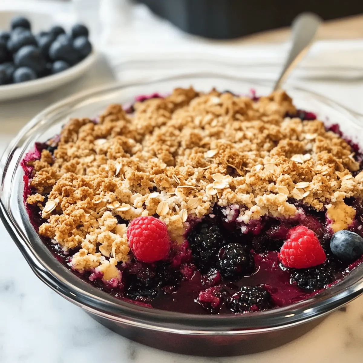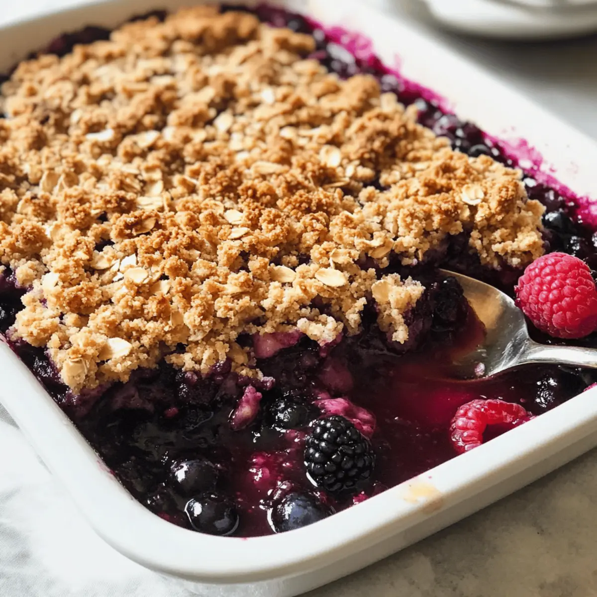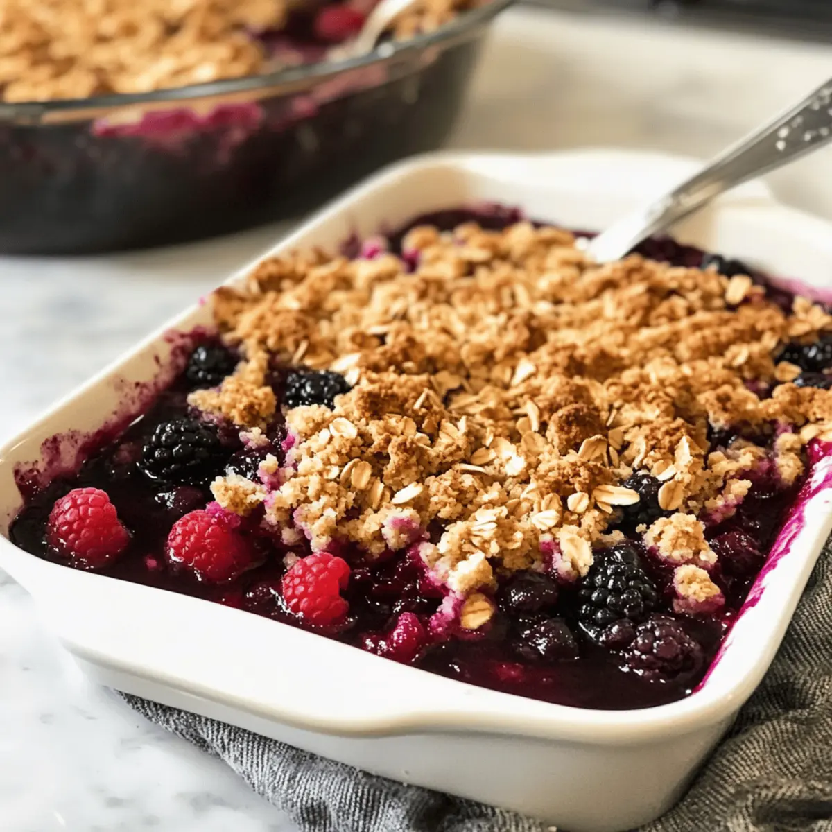 Als ich neulich durch den Supermarkt schlenderte, fiel mir die bunte Auswahl an gefrorenen Beeren ins Auge – eine wahre Schatztruhe für jeden Dessertliebhaber! Wenn du auf der Suche nach einem einfachen und dennoch beeindruckenden Rezept bist, dann ist der Dreifach-Beeren-Crisp mit Haferkruste genau das Richtige für dich. Diese köstliche Mischung aus saftigen Himbeeren, Blaubeeren und Brombeeren, die von einer knusprigen Haferkruste umhüllt wird, bietet nicht nur ein absolutes Geschmackserlebnis, sondern ist auch glutenfrei (mit den richtigen Haferflocken). Mit wenigen, leicht erhältlichen Zutaten lässt sich dieses himmlische Dessert ruckzuck zubereiten und bringt jede Familie zum Staunen. Ideal für gesellige Abende oder für einen süßen Abschluss nach einem stressigen Tag – möchtest du wissen, wie einfach du diese Leckerei nachbacken kannst? Warum wirst du dieses Dessert lieben? Einfachheit, die begeistert: Die Zubereitung ist denkbar unkompliziert und benötigt nur grundlegende Backkenntnisse. Fruchtige Frische: Die Kombination aus Himbeeren, Blaubeeren und Brombeeren sorgt für ein aufregendes Geschmackserlebnis. Vielseitigkeit: Du kannst die gefrorenen Beeren nach Lust und Laune variieren oder sogar Nüsse in die Kruste einarbeiten. Gemütliche Textur: Die knackige Haferkruste ergänzt perfekt die saftige Füllung und sorgt für einen unwiderstehlichen Genuss. Schnell zubereitet: Ideal für spontane Dessertvorstellungen, da du wahrscheinlich bereits viele Zutaten zu Hause hast. Genieße diesen Dreifach-Beeren-Crisp mit Haferkruste warm mit einer Kugel Vanilleeis für das perfekte Finale eines jeden Tages! Dreifach-Beeren-Crisp Zutaten • Voller Geschmack mit einfachen Zutaten! Für die Beerenfüllung Gefrorene Mischbeeren – Diese geben den Hauptgeschmack und sind eine köstliche Kombination aus Himbeeren, Blaubeeren und Brombeeren. Maisstärke – Verdickt die Füllung und absorbiert überschüssige Feuchtigkeit beim Backen. Frischer Limettensaft – Erfrischt die Beeren und sorgt für eine spritzige Note zur Süße. Für die Haferkruste Brauner Zucker – Verleiht der Kruste eine karamellartige Süße, die hervorragend zu den Beeren passt. Zucker – Süßt die Kruste und die Füllung nach Belieben. Ungesalzene Butter – Schlüsselzutat für eine reichhaltige und knusprige Kruste; für eine milchfreie Option kann Kokosöl verwendet werden. Schnellkochende Haferflocken – Sorgt für eine zähe Konsistenz und ist wichtig für die Textur. Achte darauf, glutenfreie Haferflocken zu verwenden, wenn nötig. Alte Haferflocken – Fügen der Kruste zusätzliche Bissfestigkeit hinzu. Weitere Zutaten Meersalz – Balanciert die Süße und verstärkt die Aromen insgesamt. Schritt-für-Schritt-Anleitung für Dreifach-Beeren-Crisp mit Haferkruste Step 1: Ofen vorheizen Heize deinen Ofen auf 175°C vor und fette eine 20×20 cm große Backform mit Antihaftspray ein. Dies sorgt dafür, dass der Dreifach-Beeren-Crisp mit Haferkruste später leicht aus der Form gelöst werden kann. Step 2: Beerenmix vorbereiten In einer großen Schüssel die gefrorenen Mischbeeren, Maisstärke, frischen Limettensaft und Zucker gut vermengen, bis die Beeren gleichmäßig überzogen sind. Lasse die Mischung einige Minuten stehen, damit sich die Aromen entfalten und der Zucker schmilzt. Step 3: Beerenfüllung in die Form geben Übertrage die vorbereitete Beerenfüllung in die gefettete Backform. Streue die restliche Maisstärke-Zucker-Mischung gleichmäßig über die Beeren, um überschüssige Feuchtigkeit zu binden und die Füllung beim Backen zu verdicken. Step 4: Haferkruste zubereiten In einer separaten Schüssel die schnellkochenden und alten Haferflocken, Zucker, braunen Zucker und Meersalz vermengen. Kühle die ungesalzene Butter, schneide sie in kleine Stücke und vermenge sie mit den trockenen Zutaten, bis die Mischung krümelig ist. Step 5: Haferkruste auf die Beeren geben Verteile die Haferkruste gleichmäßig über die Beerenfüllung, sodass sie vollständig bedeckt ist. Drücke die Kruste leicht an, um eine gleichmäßige Textur zu erzielen, die beim Backen schön knusprig wird. Step 6: Backen und genießen Backe den Dreifach-Beeren-Crisp mit Haferkruste für 55 bis 60 Minuten, bis die Beeren blubbern und die Kruste goldbraun ist. Achte darauf, ihn bei Bedarf mit Alufolie abzudecken, falls die Oberfläche zu schnell bräunt. Lass ihn vor dem Servieren kurz abkühlen. Was passt gut zu Dreifach-Beeren-Crisp mit Haferkruste? Genieße diesen fruchtigen Genuss in Kombination mit köstlichen Beilagen, die das Geschmackserlebnis perfekt abrunden. Vanilleeis: Eine klassische Begleitung, die mit ihrer cremigen Textur die fruchtige Füllung wunderbar ergänzt. Lass das Eis sanft auf dem warmen Crisp schmelzen für ein himmlisches Zusammenspiel. Schlagsahne: Leichte und fluffige Schlagsahne bringt eine süße Note und cremigen Kontrast zur knusprigen Haferkruste. Ideal für Schokoladenliebhaber, die einen zusätzlichen Touch suchen. Karamellsauce: Ein süßer Drizzle aus Karamellsauce verleiht dem Dessert ein luxuriöses Finish. Der mix aus süß und salzig wird auch die anspruchsvollsten Gaumen erfreuen. Frische Minze: Ein Blatt frische Minze sorgt nicht nur für ein schönes Aussehen, sondern auch für eine erfrischende Note. Der leichte Geschmack harmoniert ideal mit den süßen Beeren und hebt das Aroma hervor. Gezuckerter Joghurt: Serviere einen Klecks griechischen Joghurts, um eine cremige Textur hinzuzufügen. Die leicht säuerliche Note des Joghurts kann das süße Aroma der Beeren wunderbar balancieren. Fruchtcocktail: Ein bunter Fruchtcocktail als Beilage unterstreicht die Fruchtigkeit des Crisps. Mische saisonale Früchte für einen zusätzlichen frischen Kontrast. Diese Kombinationen machen den Dreifach-Beeren-Crisp mit Haferkruste zu einem unwiderstehlichen Highlight auf jedem Desserttisch! Dreifach-Beeren-Crisp mit Haferkruste Variationen Lass deiner Kreativität freien Lauf, um dieses 