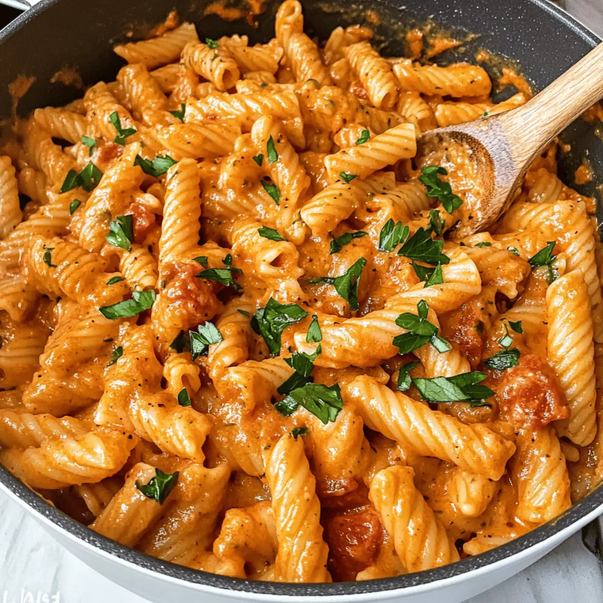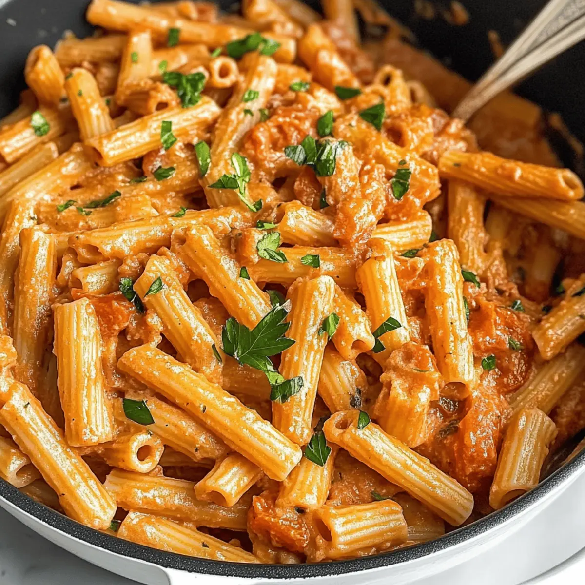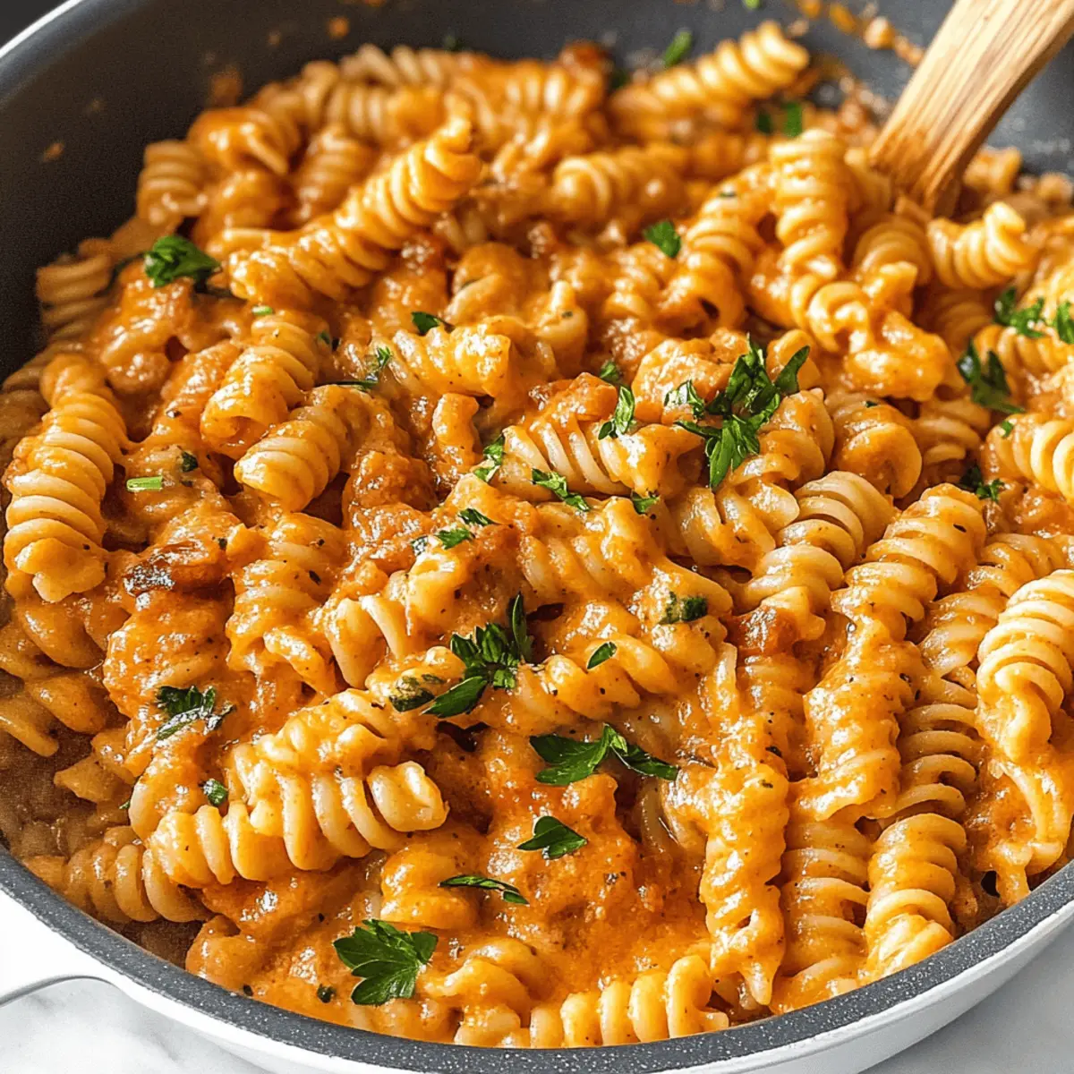 Ein kurzer Blick auf die Uhr zeigte mir, dass ich nur noch 30 Minuten hatte, um das Abendessen vorzubereiten. In solchen Momenten brauche ich eine Geheimwaffe in der Küche – wie meine Ein Topf Cremige Tomatennudeln. Dieses Rezept vereint die köstlichen Aromen reifer Tomaten und die cremige Textur, die jeden Bissen zu einem Genuss macht. Perfekt für geschäftige Wochentage, denn alles wird in einem einzigen Topf zubereitet und die Reinigung danach bleibt kinderleicht. Mit dieser schnellen und köstlichen Mahlzeit kommen sowohl Kinder als auch Erwachsene voll auf ihre Kosten. Wer kann da schon widerstehen? Welche Variationen du ausprobieren möchtest, um deinem eigenen Twist zu verleihen, bleibt ganz dir überlassen! Warum wirst du dieses Rezept lieben? Schnelligkeit: In nur 30 Minuten zauberst du ein köstliches Gericht, ideal für stressige Wochentage. Ein Topf: Alles wird in nur einem Topf zubereitet, was nicht nur Zeit spart, sondern auch die Reinigung zum Kinderspiel macht. Cremige Textur: Die Kombination aus Parmesan und Frischkäse ergibt eine wunderbar cremige Soße, die die Pasta perfekt umhüllt. Vielfältige Variationen: Experimentiere mit frischem Gemüse oder füge Fleisch hinzu, um deinen eigenen Geschmack zu treffen. Familienfreundlich: Sowohl Kinder als auch Erwachsene lieben dieses Rezept – es wird zum neuen Favoriten am Esstisch! Kombiniere deine Ein Topf Cremige Tomatennudeln mit einem frischen Salat oder knusprigem Brot für ein rundum gelungenes Essen! Ein Topf Cremige Tomatennudeln Zutaten • Für jeden Pastaliebhaber das perfekte Rezept! Für die Soße Olivenöl – sorgt für reichhaltigen Geschmack und eignet sich hervorragend zum Anbraten. Verwende nach Belieben auch ein anderes Kochöl. Zwiebel (1 kleine, gehackt) – bringt Süße und Tiefe ins Gericht. Schalotten sind eine gute Alternative. Knoblauch (1 Zehe, gehackt) – verleiht eine kräftige Note. Knoblauchpulver kann ebenfalls verwendet werden. Getrocknete Tomaten (⅓ Tasse, gehackt, optional) – intensiviert den Tomatengeschmack und sorgt für eine interessante Konsistenz. Lass sie weg, wenn die Kinder skeptisch sind; frische Tomaten funktionieren auch. Tomatenmark (1 Esslöffel) – intensiviert den Tomatengeschmack und dicken die Soße. Bei Bedarf kann auch Tomatensoße verwendet werden. Italian Seasoning (2 Teelöffel) – eine Kräutermischung, die für Aroma sorgt. Ersetze sie durch getrockneten Basilikum und Oregano. Hühnerbrühe oder Wasser (3 Tassen) – die Flüssigkeit, die zum Garen der Pasta und für die Soße benötigt wird. Für eine vegetarische Version eignet sich Gemüsebrühe. Dosen-Tomaten (1 Dose, 15 oz, ungewässert) – sorgt für Feuchtigkeit und Textur. Frische Tomaten können verwendet werden, aber achte auf die Flüssigkeitsanpassung. Kurze Pasta (1 Packung, 12 oz) – die Basis dieses köstlichen Gerichts. Penne oder Fusilli sind ebenfalls bestens geeignet. Salz & Pfeffer – zum Abschmecken. Für die Cremigkeit Parmesan (½ Tasse, gerieben) – sorgt für einen cremigen Geschmack. Nährhefe kann als vegane Alternative genutzt werden. Frischkäse (¼ Tasse) ODER Ricotta/Mascarpone – macht die Soße wunderbar cremig. Jede Art von weichem Käse tut es; auch Sauerrahm geht im Notfall. Gehackte Petersilie (optional) – eine frische Kräuterbeigabe. Basilikum kann auch verwendet werden. Egal, ob du die Ein Topf Cremige Tomatennudeln das erste Mal zubereitest oder ein erfahrener Koch bist, diese Zutaten werden dir helfen, ein schmackhaftes und schnelles Gericht zu kreieren! Schritt-für-Schritt-Anleitung für Ein Topf Cremige Tomatennudeln Schritt 1: Aromastoffe anbraten Erhitze das Olivenöl in einem großen Topf bei mittlerer Hitze. Füge die gehackte Zwiebel und den Knoblauch hinzu und brate sie etwa 2 Minuten lang an, bis sie weich und aromatisch sind. Wenn du möchtest, ergänze die getrockneten Tomaten und brate sie ebenfalls für eine weitere Minute mit. Rühre das Tomatenmark und das italienische Gewürz unter, um alles gut zu vermischen. Schritt 2: Flüssigkeiten und Pasta hinzufügen Gieße die Hühnerbrühe in den Topf und kratzen alle angebratenen Stücke vom Boden ab. Füge die ungewässerten Dosentomaten (mit Flüssigkeit) und die kurze Pasta hinzu. Würze die Mischung mit Salz und Pfeffer. Bring alles zum Kochen und warte, bis es sprudelt, um die Aromen zu vereinen. Schritt 3: Pasta kochen Reduziere die Hitze, sodass die Mischung nur noch köchelt, und koche die Pasta 10 bis 15 Minuten lang, bis sie al dente ist. Rühre gelegentlich um, damit die Pasta nicht am Boden kleben bleibt. Wenn die Mischung zu trocken erscheint, kannst du nach Bedarf etwas mehr Brühe hinzufügen, um die perfekte cremige Konsistenz zu erreichen. Schritt 4: Käsesorten einrühren Nehme den Topf vom Herd und rühre den geriebenen Parmesan und den Frischkäse unter, bis alles schön geschmolzen und vereint ist. Die Ein Topf Cremige Tomatennudeln sollten nun eine zarte, cremige Soße haben, die die Pasta perfekt umhüllt. Wenn gewünscht, füge jetzt die gehackte Petersilie hinzu, um einen frischen Geschmack zu erhalten. Schritt 5: Ruhen lassen und servieren Lass das Gericht für etwa 3 bis 4 Minuten ruhen, damit die Soße etwas eindickt und sich die Aromen setzen können. Danach ist es bereit zum Servieren. Genieße die köstlichen Ein Topf Cremige Tomatennudeln alleine oder mit einem frischen Salat und knusprigem Brot für ein rundum gelungenes Essen! Meal Prep für Ein Topf Cremige Tomatennudeln Die Ein Topf Cremige Tomatennudeln sind eine hervorragende Wahl für die Meal Prep! Du kannst die gehackte Zwiebel, den Knoblauch und die getrockneten Tomaten bis zu 3 Tage im Voraus zubereiten und in einem luftdichten Behälter im Kühlschrank aufbewahren. Auch die Käsesorten kannst du bereits abmessen und zusammenstellen, sodass sie beim Kochen schnell zur Hand sind. Wenn du bereit bist, das Gericht zuzubereiten, erhitze einfach das Olivenöl, füge die vorbereiteten Zutaten hinzu und fo
