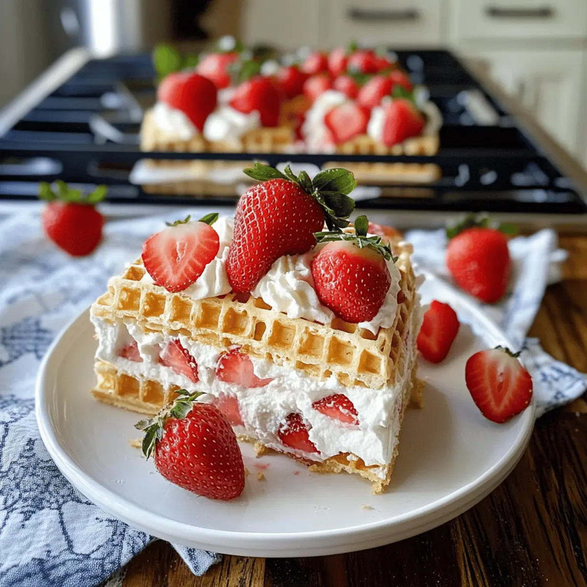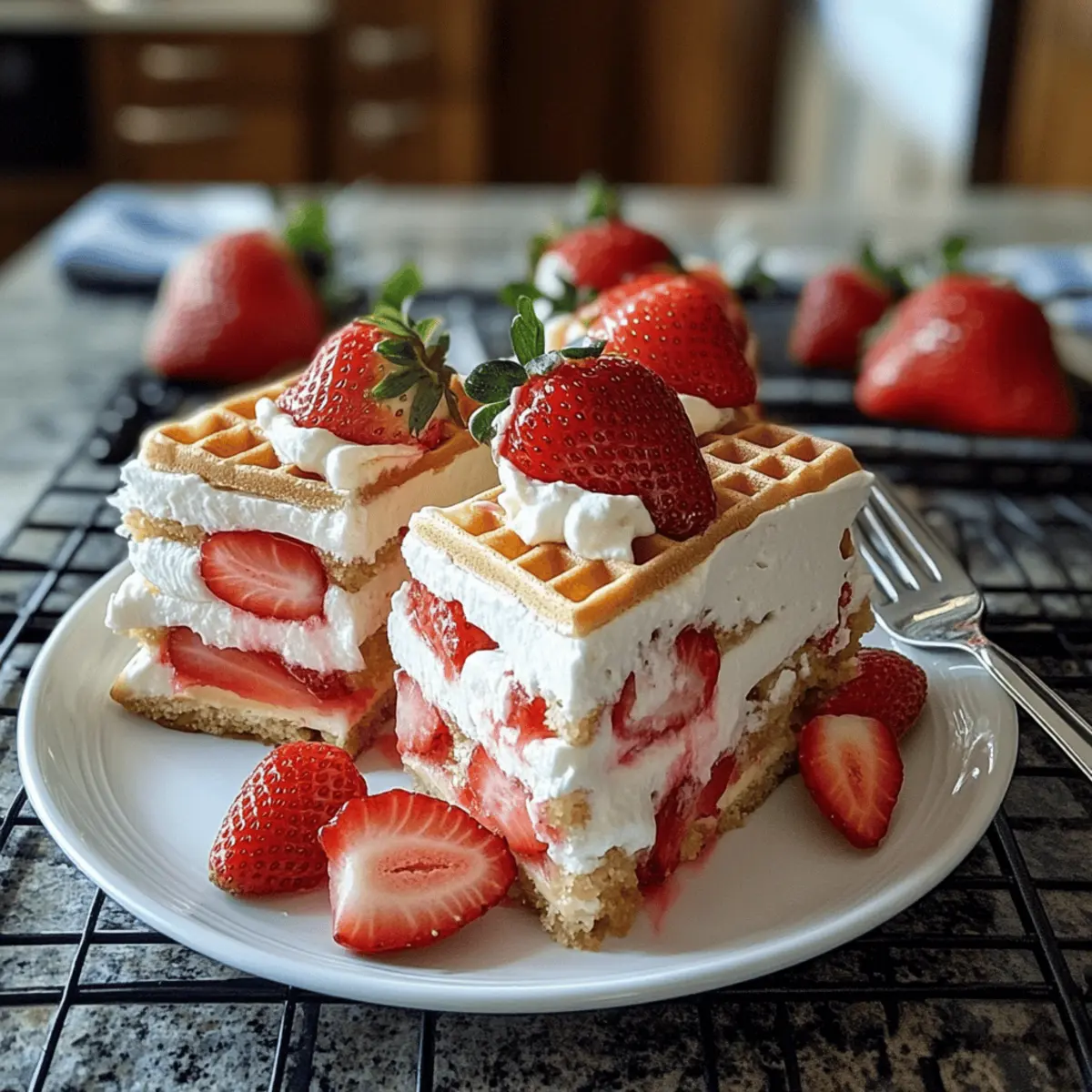 Erdbeerwaffelkuchen ist ein köstliches, schnell zubereitetes Dessert für heiße Tage, ideal für gesellige Anlässe und ohne Backen.