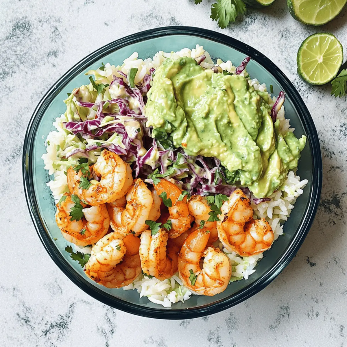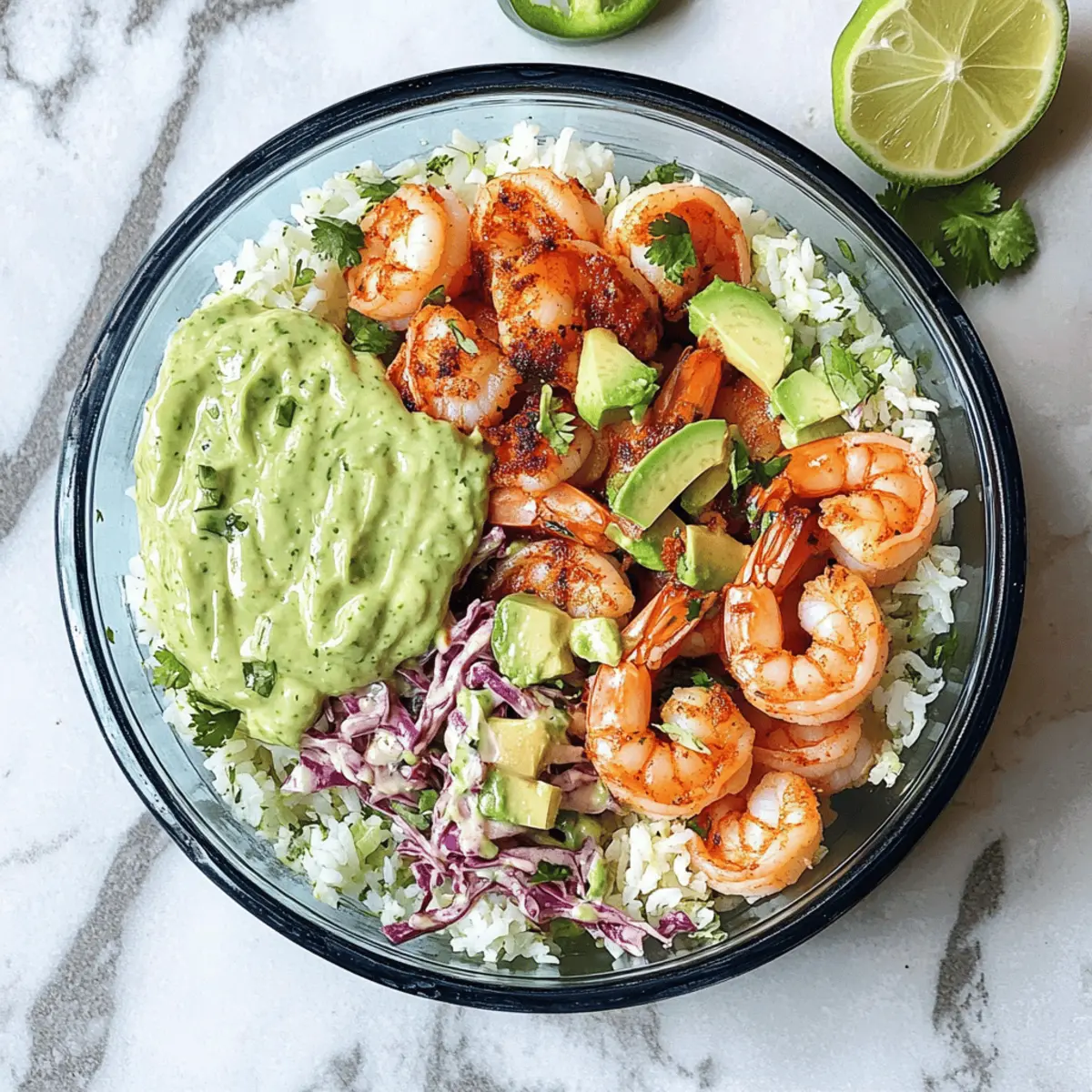 „Hast du jemals darüber nachgedacht, wie du das Glück der mexikanischen Küche in eine unkomplizierte Mittagsmahlzeit verwandeln kannst?“ Mit diesen Garnelen-Taco-Mittagschalen wird dir das spielend leicht gelingen! Dieses Rezept kombiniert saftige Garnelen mit einem erfrischenden Koriander-Limetten-Reis und einer pikanten Jalapeño-Coleslaw, und wird köstlich abgerundet von einem cremigen Avocado-Koriander-Dressing. Der große Vorteil? Sie sind nicht nur gesund und diätfreundlich, sondern auch ideal für Meal Prep, sodass du deine Mittagspausen mit weniger Aufwand genießen kannst. Egal, ob du im stressigen Büro bist oder dir einfach eine leckere Abwechslung wünschst – diese Schalen sind ein voller Genuss! Bist du bereit, dein Mittagessen auf das nächste Level zu heben? Warum sind Garnelen-Taco-Mittagschalen so beliebt? Gesundheit: Diese Mittagschalen sind nicht nur lecker, sondern auch gesund. Die Kombination aus proteinreichen Garnelen, frischem Gemüse und aromatischem Reis sorgt für ein ausgewogenes Mittagessen. Einfachheit: Die Zubereitung ist kinderleicht! Du benötigst nur wenige Schritte, um eine köstliche und nahrhafte Mahlzeit zu zaubern. Vielseitigkeit: Variiere die Zutaten ganz nach deinem Geschmack! Ob du Garnelen durch Hühnchen, Tofu oder sogar schwarze Bohnen ersetzen möchtest, die Möglichkeiten sind endlos. Meal Prep: Perfekt für die Wochenvorbereitung! Diese Schalen lassen sich leicht portionieren und bleiben bis zu vier Tage frisch – ideal für beschäftigte Tage. Frische Aromen: Das cremige Avocado-Koriander-Dressing bringt einen extra Kick und macht die Schalen besonders schmackhaft. Wenn du nach mehr gesunden Rezeptideen suchst, schau dir doch mal unsere Tipps für nahrhafte Meal Prep-Mahlzeiten an! Garnelen-Taco-Mittagschalen Zutaten • Entdecke die köstlichen Zutaten für die Garnelen-Taco-Mittagschalen, die perfekt für dein gesundes Mittagessen sind! Für die Garnelen Garnelen – die Hauptquelle für Protein in diesem Gericht; frische oder gefrorene Garnelen funktionieren hervorragend. Für den Reis Koriander-Limetten-Reis – dient als aromatische Basis; du kannst auch braunen Reis oder Quinoa verwenden, um den Ballaststoffgehalt zu erhöhen. Für die Coleslaw Jalapeño – sorgt für die würzige Note; tausche sie gegen eine mildere Paprika aus, wenn du es weniger scharf magst. Kohl – bringt einen schönen Crunch; frisch und knackig für die beste Textur. Für das Dressing Avocado – fügt Cremigkeit und gesunde Fette hinzu; kann auch durch ein Tahini-Dressing für einen nussigen Geschmack ersetzt werden. Koriander – bringt frische und Aromen, die die Schalen lebendig machen. Für die Gewürze Salz, Pfeffer, Kreuzkümmel – unterstreichen den Geschmack der Garnelen; passe die Menge nach deinem Geschmack an. Schritt-für-Schritt-Anleitung für Garnelen-Taco-Mittagschalen Step 1: Reis kochen Beginne mit dem Koriander-Limetten-Reis. Spüle eine Tasse Reis unter kaltem Wasser ab, bis das Wasser klar ist. Koche ihn in einem Topf mit zwei Tassen Wasser zum Kochen bringen und dann auf niedrige Hitze reduzieren. Lasse den Reis etwa 15-20 Minuten lang köcheln, bis das Wasser aufgenommen und der Reis weich ist. Füge einen Esslöffel Limettensaft und frischen Koriander hinzu, um ihm Geschmack zu verleihen. Step 2: Dressing zubereiten Während der Reis kocht, bereite das cremige Avocado-Koriander-Dressing vor. Mische dafür eine reife Avocado, eine Handvoll frischen Koriander, den Saft einer Limette, Salz und Pfeffer in einem Mixer. Mixe alles, bis eine glatte, cremige Konsistenz erreicht ist. Stelle das Dressing beiseite, damit sich die Aromen entfalten können, während du die restlichen Zutaten zubereitest. Step 3: Coleslaw herstellen Jetzt ist es an der Zeit, die Jalapeño-Coleslaw zuzubereiten. Schneide etwa zwei Tassen frischen Kohl in feine Streifen und eine Jalapeño in kleine Stücke. Vermische beides in einer Schüssel und füge ein paar Esslöffel des Avocado-Koriander-Dressings hinzu. Rühre alles gut um, sodass das Gemüse gleichmäßig mit dem Dressing bedeckt ist. Lasse die Coleslaw mindestens 10 Minuten im Kühlschrank ruhen, damit die Aromen durchziehen können. Step 4: Garnelen braten Erhitze eine Pfanne bei mittlerer Hitze und füge einen Esslöffel Öl hinzu. Wähle frische oder aufgetaute Garnelen und würze sie mit Salz, Pfeffer und Kreuzkümmel. Brate die Garnelen ca. 3-4 Minuten lang, bis sie sich rosa und undurchsichtig färben. Achte darauf, die Garnelen nicht zu lange zu braten, um ein Überkochen zu vermeiden. Nimm sie dann vom Herd. Step 5: Schalen zusammenstellen Nun ist es Zeit, die Garnelen-Taco-Mittagschalen zusammenzustellen! Verwende Meal Prep-Behälter, um eine Schicht des Koriander-Limetten-Reis hinzuzufügen. Platziere dann die saftigen Garnelen darauf und füge eine großzügige Portion der Jalapeño-Coleslaw hinzu. Träufle schließlich noch etwas vom Avocado-Koriander-Dressing darüber für zusätzlichen Geschmack und eine cremige Textur. Step 6: Servieren und genießen Um die Garnelen-Taco-Mittagschalen zu genießen, serviere sie gekühlt oder bei Raumtemperatur. Du kannst zusätzlich Limettenstücke und mehr Dressing bereitstellen, um jedem eine individuelle Note zu verleihen. Diese Schalen sind ideal für eine gesunde Mittagspause und lassen sich ganz nach deinem Geschmack anpassen! Was passt zu Garnelen-Taco-Mittagschalen? Diese Garnelen-Taco-Mittagschalen sind nicht nur ein Geschmackserlebnis, sondern bieten auch viele Optionen für aromatische Begleiter. Limetten-Wedges: Frische Limettenstückchen bringen eine zusätzliche spritzige Note und fördern den Geschmack der Schalen. Avocado-Scheiben: Cremige Avocado ergänzt die Schalen perfekt und bringt eine sahnige Textur, die wunderbar harmoniert. Tortilla-Chips: Die knusprigen Chips liefern einen interessanten Crunch und eignen sich hervorragend zum Dippen in das Avocado-Koriander-Dressing. Wasser mit Zitrone: Erfrischendes Zitronenwasser rundet