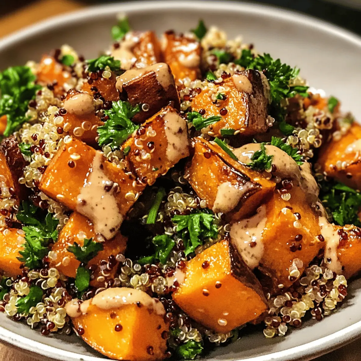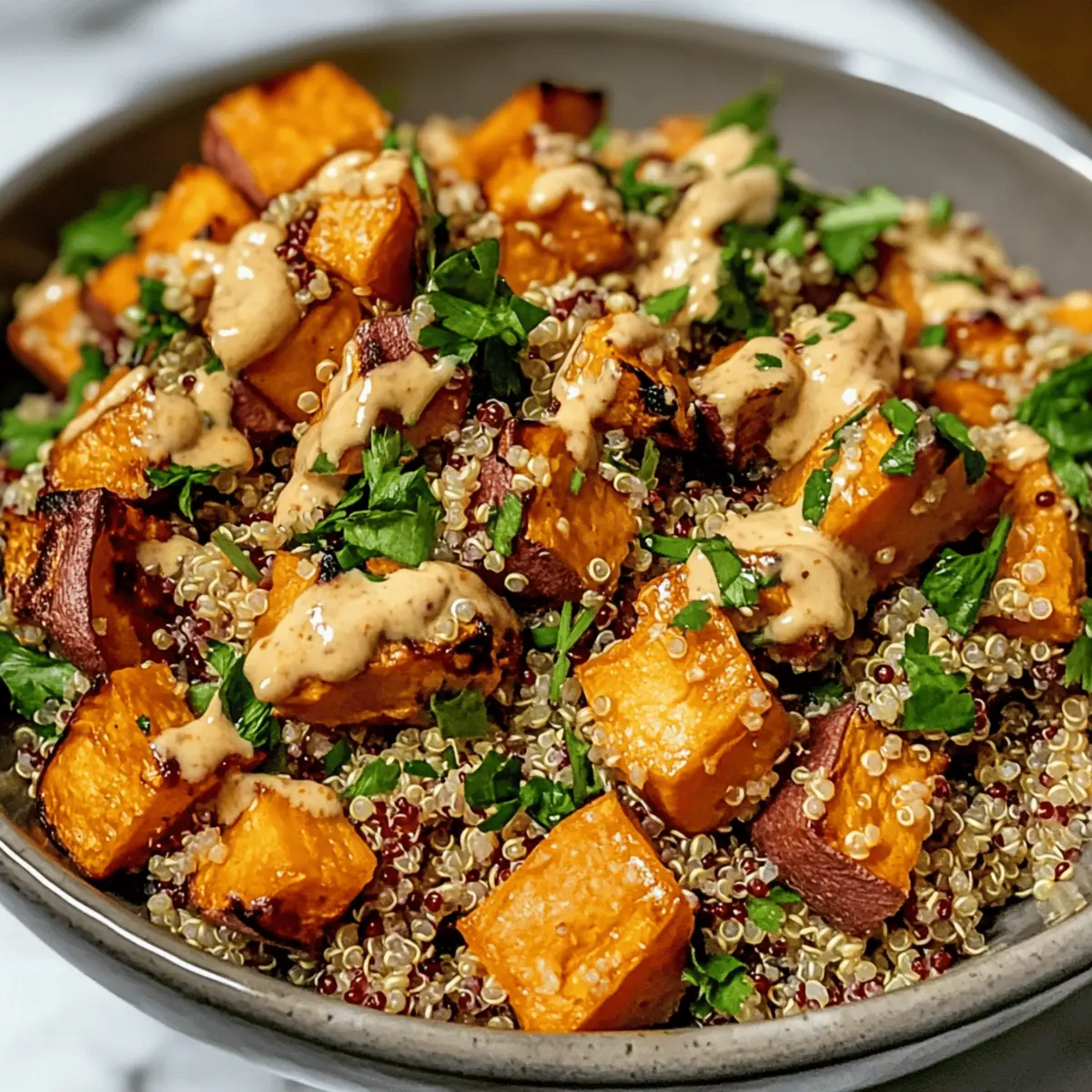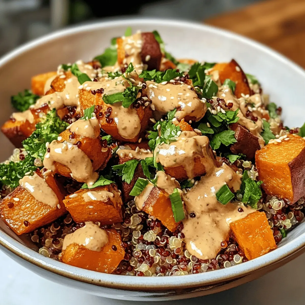 Der erste Biss in meinen Gerösteten Süßkartoffel-Quinoa-Salat mit Sesam-Miso-Sauce ist wie ein kleines Geschmackserlebnis, das mich sofort zurück zu diesem sonnigen Herbsttag bringt, an dem ich diese Kombination für das erste Mal zubereitet habe. Es ist eine perfekte Balance aus süßen, weichen Süßkartoffeln und nussiger Quinoa, die nicht nur absolut köstlich, sondern auch unglaublich nährstoffreich ist. Diese leckere salad ist nicht nur eine gute Wahl für diejenigen, die sich gesund ernähren möchten, sondern auch ein wahres Geschmackserlebnis für alle, die das monotone Fast Food hinter sich lassen wollen. Mit einer schnellen Zubereitungszeit und dem Potenzial, als Hauptgericht oder Beilage zu glänzen, verspricht dieser Salat, deine nächste Mahlzeit auf unkomplizierte Weise aufzuwerten. Was denkst du, bist du bereit, diese genussvolle Kombination auszuprobieren? Warum wirst du diesen Salat lieben? Einfachheit trifft Geschmack: Die Zubereitung ist einfach und benötigt nur minimalen Aufwand, perfekt für alle Kochlevel. Vielseitig und anpassbar: Ob als leichtes Mittagessen oder als beeindruckende Beilage zu deinem Hauptgericht, dieser Salat ist extrem vielseitig. Nährstoffreich und gesund: Voll mit Ballaststoffen und pflanzlichem Protein, sorgt er für eine gesunde Mahlzeit ohne Verzicht auf Geschmack. Umami-Explosion: Die Sesam-Miso-Sauce bringt eine unvergleichliche Tiefe, die jeden Bissen zu einem Freude macht. Perfekt für Meal Prep: Bereite ihn im Voraus zu und genieße den Salat mehrere Tage lang! Wenn du noch mehr gesunde Ideen suchst, schau dir auch unseren Rhabarberkuchen Mit Mascarpone an oder probiere die leckeren Gefüllte Süßkartoffeln Mit für weitere Inspiration. Roasted Sweet Potato Quinoa Salad Ingredients Für den Salat Süßkartoffeln – Sie bringen süße Aromen und sind reich an Ballaststoffen, die hervorragend für deine Gesundheit sind. Alternativ können auch Kürbisstücke verwendet werden. Quinoa – Diese hochwertige, pflanzliche Proteinquelle verleiht dem Salat eine tolle Textur. Vorher gründlich abspülen, um Bitterstoffe zu entfernen. Olivenöl – Perfekt zum Rösten der Süßkartoffeln, sorgt es für Geschmack und eine knusprige Oberfläche. Kokosöl kann ebenfalls verwendet werden. Salz – Gibt dem Gericht die nötige Würze. Weitere Gewürze wie Paprika können hinzugefügt werden. Pfeffer – Damit verleihst du dem Salat eine angenehme Schärfe. Frisch gemahlener Pfeffer wird empfohlen. Frühlingszwiebeln – Sie bringen einen milden Zwiebelgeschmack und Frische. Kann durch rote Zwiebeln ersetzt werden. Korianderblätter/Petersilie (optional) – Für einen zusätzlichen frischen Geschmack. Basilikum ist eine alternative Wahl. Sesamsamen (optional) – Fügen einen knusprigen und nussigen Crunch hinzu. Für die Sesam-Miso-Sauce Miso-Paste – Die Hauptzutat, die eine tiefgehende Umami-Note liefert. Achte darauf, eine halal-zertifizierte Paste zu wählen. Tahini – Sorgt für eine cremige Konsistenz in der Sauce. Kann durch Erdnussbutter ersetzt werden. Reisessig – Bringt eine zarte Zitrusnote in die Sauce. Äpfelessig kann ebenfalls verwendet werden. Sojasauce – Gewährleistet salzige Tiefe und Geschmack. Glutenfreie Sojasauce ist eine Option. Ahornsirup/Agavendicksaft – Für eine süße Note, die die Aromen der Sauce harmonisiert. Honig kann auch verwendet werden. Sesamöl – Fügt den charakteristischen nussigen Geschmack hinzu. Warmes Wasser – Um die Sauce nach Bedarf zu verdünnen und die gewünschte Konsistenz zu erreichen. Fühle die Vorfreude auf deinen Gerösteten Süßkartoffel-Quinoa-Salat mit Sesam-Miso-Sauce! Jeder Bissen wird dich und deine Gäste erfreuen. Schritt-für-Schritt-Anleitungen für den Gerösteten Süßkartoffel-Quinoa-Salat mit Sesam-Miso-Sauce Step 1: Süßkartoffeln rösten Heize den Ofen auf 200°C vor. Schneide die Süßkartoffeln in gleich große Würfel von etwa 2 cm, damit sie gleichmäßig garen. Verteile die Süßkartoffelwürfel auf einem Backblech, beträufle sie mit 1 EL Olivenöl und würze sie mit Salz und Pfeffer. Röste die Süßkartoffeln für 25–30 Minuten im vorgeheizten Ofen, bis sie goldbraun und weich sind. Wende sie einmal während des Röstens für eine gleichmäßige Garung. Step 2: Quinoa kochen Spüle die Quinoa unter kaltem Wasser gründlich ab, um Bitterstoffe zu entfernen. Koche in einem Topf 1 ½ Tassen Wasser oder Gemüsebrühe auf und füge die Quinoa hinzu. Reduziere die Hitze und lasse die Quinoa für etwa 15 Minuten köcheln, bis das Wasser vollständig aufgesogen ist. Nimm den Topf vom Herd und lasse die Quinoa 5 Minuten abgedeckt stehen, bevor du sie mit einer Gabel auflockerst. Step 3: Sesam-Miso-Sauce zubereiten In einer kleinen Schüssel vermischst du die Miso-Paste, Tahini, Reisessig, Sojasauce, Ahornsirup und Sesamöl. Rühre alles gut um, bis eine gleichmäßige Masse entsteht. Falls die Sauce zu dick ist, füge nach Bedarf warmes Wasser hinzu, bis du die gewünschte Konsistenz erreicht hast. Diese cremige Sesam-Miso-Sauce verleiht dem Gerösteten Süßkartoffel-Quinoa-Salat eine herrliche Umami-Note. Step 4: Salat anrichten In einer großen Schüssel vereinst du die gekochte Quinoa mit den gerösteten Süßkartoffeln. Füge die geschnittenen Frühlingszwiebeln hinzu und, falls gewünscht, auch frische Korianderblätter oder Petersilie für zusätzliche Aromen. Gieße die Sesam-Miso-Sauce über den Salat und vermenge alles vorsichtig, damit sich die Aromen gut verbinden und jede Zutat gleichmäßig mit der Sauce überzogen ist. Step 5: Servieren Der Geröstete Süßkartoffel-Quinoa-Salat mit Sesam-Miso-Sauce kann warm oder bei Raumtemperatur serviert werden. Garniere ihn optional mit gerösteten Sesamsamen für zusätzlichen Crunch und Nussgeschmack. Dieser Salat eignet sich hervorragend als leichtes Mittagessen oder als Beilage zu deinem Hauptgericht und wird sicherlich deine Geschmacksknospen erfreuen. Was passt gut zu Geröstetem Süßkartoffel-Qui