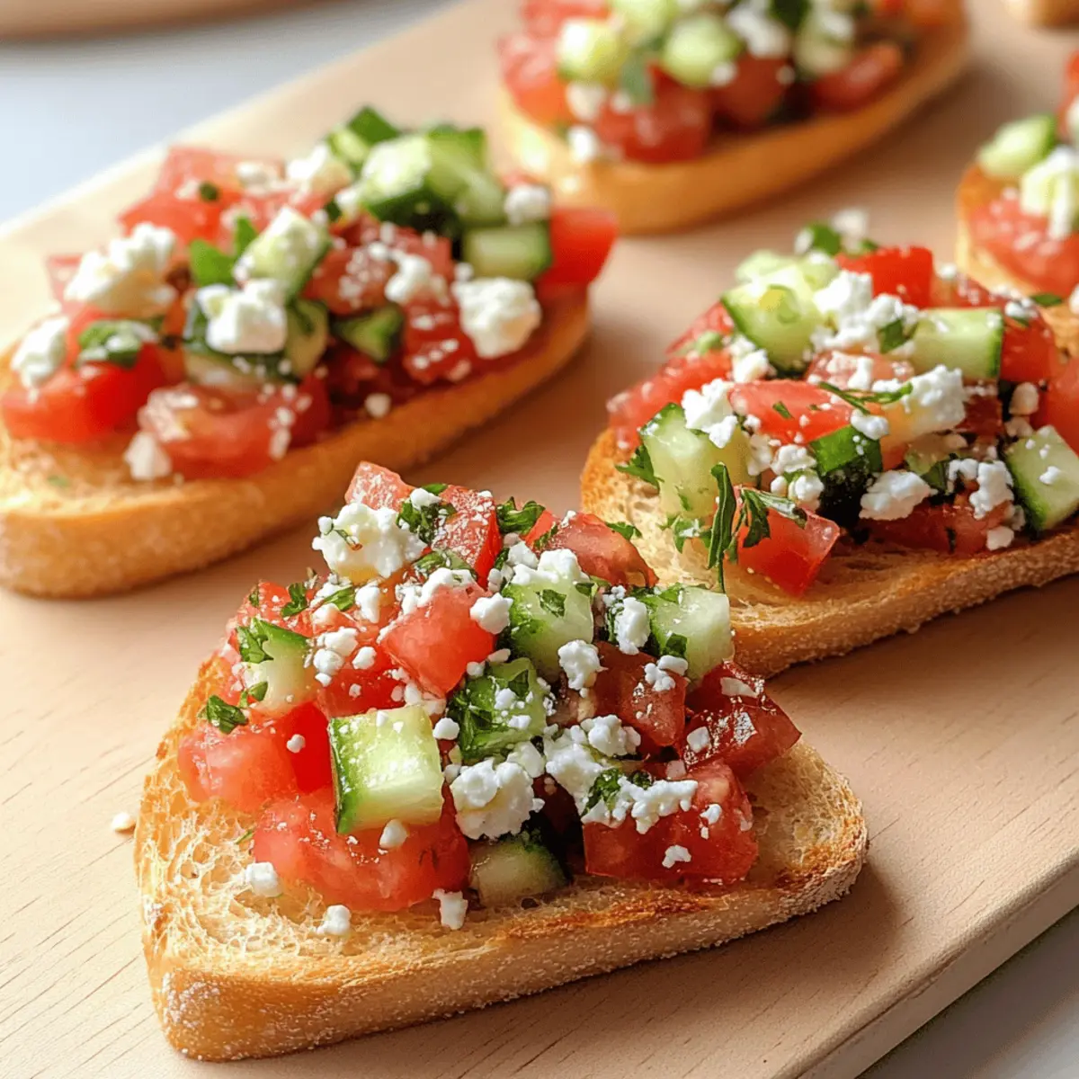 Serviere die Griechische Bruschetta sofort, damit die Gäste die frischen Aromen und den Crunch genießen können.