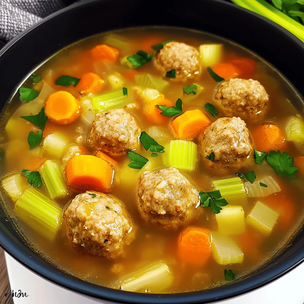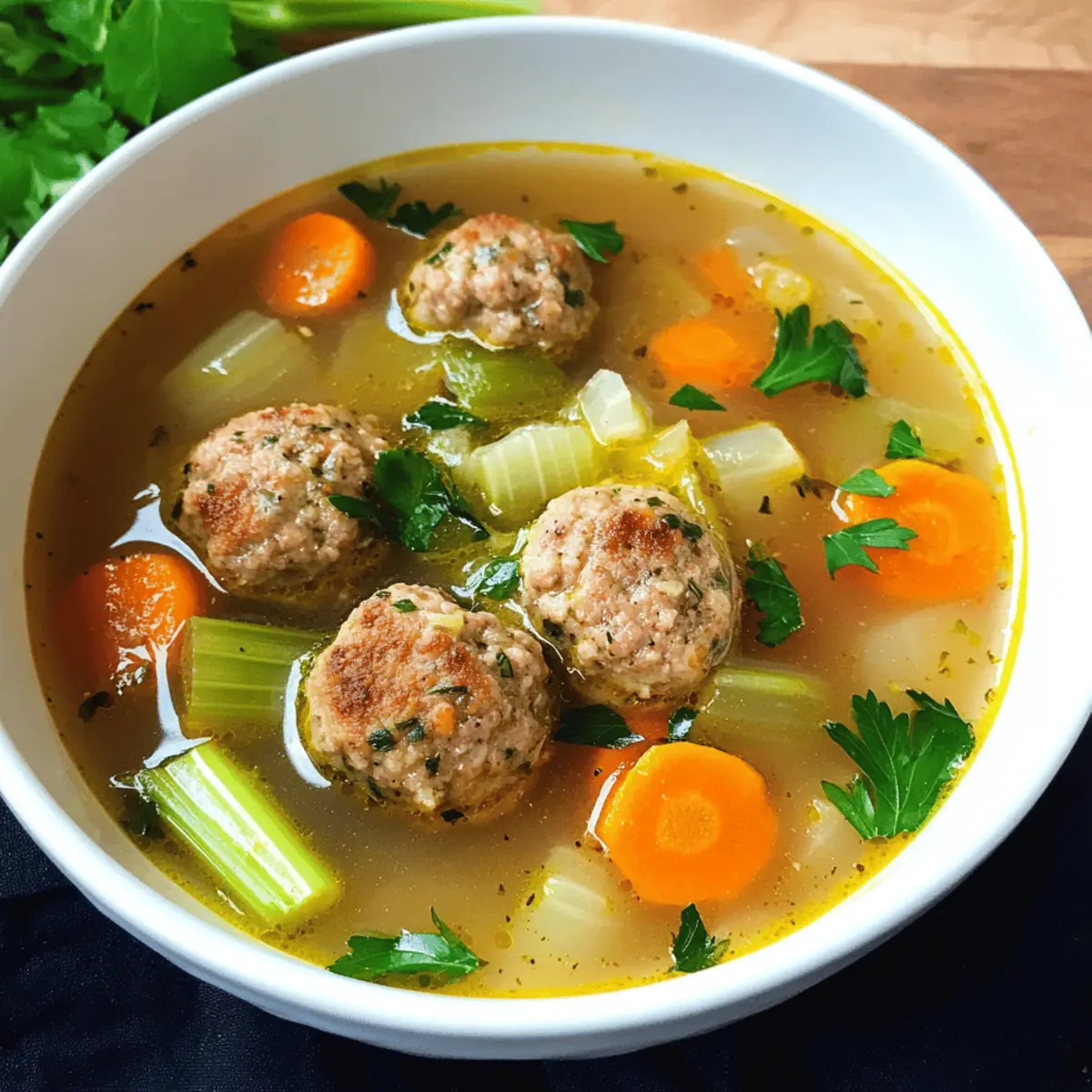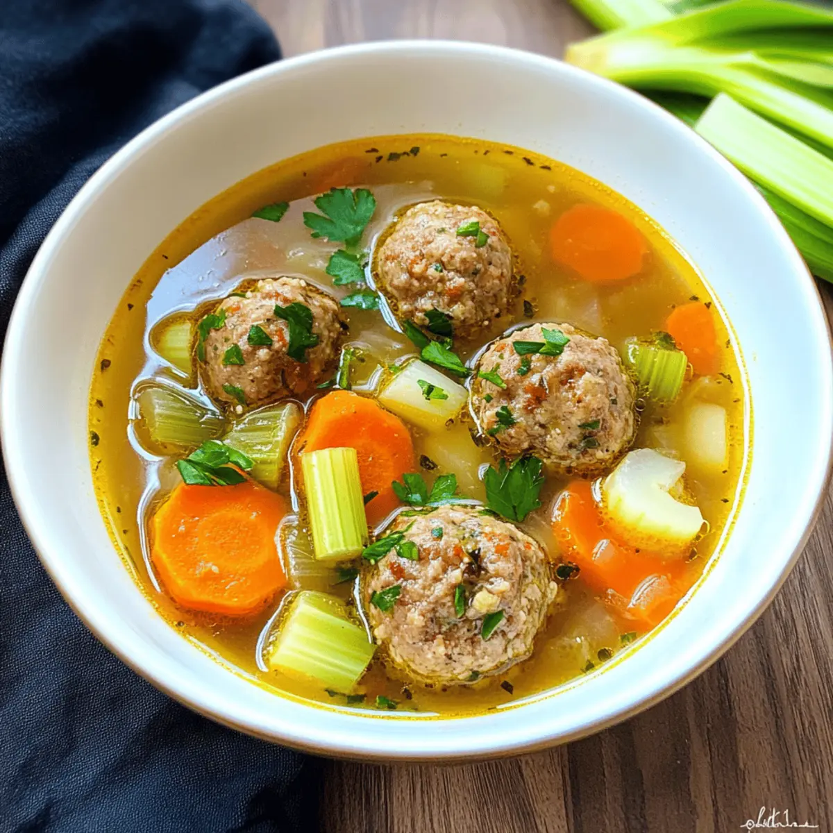 Als ich letzte Woche die kühle Luft spürte, wusste ich, dass es an der Zeit war, meine Küche in einen Ort der Gemütlichkeit zu verwandeln. Nichts wärmt die Seele mehr als eine dampfende Schüssel Hackbällchen-Suppe mit frischem Gemüse. Diese einfache und schmackhafte Suppe vereint zarte Hackbällchen mit knackigem Gemüse und ist in kürzester Zeit zubereitet – perfekt für ein schnelles, hausgemachtes Abendessen nach einem langen Tag. Egal, ob für die ganze Familie oder nur für dich alleine, diese Hackbällchen-Suppe ist ein echtes Wohlfühlgericht, das sich leicht an die Vorlieben deiner Liebsten anpassen lässt. Neugierig, wie du dir diese herzhafte Köstlichkeit selbst zaubern kannst? Lass uns loslegen! Warum ist diese Hackbällchen-Suppe einzigartig? Herzhaft und nahrhaft: Diese Suppe kombiniert zarte Hackbällchen mit frischem Gemüse und sorgt für ein echtes Geschmackserlebnis. Schnell und einfach: In weniger als 30 Minuten zauberst du ein köstliches Gericht, ideal für beschäftigte Abende. Anpassungsfähig: Verändere die Zutaten ganz nach deinem Geschmack – von verschiedenen Gemüsesorten bis hin zu alternativen Proteinquellen. Wohlfühlfaktor: Die Kombination von Aromen erinnert an gemütliche Familienabende und verbreitet ein Gefühl von Geborgenheit. Gesundheitlich vorteilhaft: Reich an Protein und lediglich mit einem niedrigen Kohlenhydratanteil (besonders ohne Kartoffeln), ist diese Suppe perfekt für gesunde Essgewohnheiten. Hackbällchen-Suppen-Zutaten • Diese köstliche Hackbällchen-Suppe benötigt frische Zutaten für den besten Geschmack! Für die Hackbällchen • Hackfleisch – sorgt für Protein und einen herzhaften Geschmack; du kannst auch Puten- oder Hühnerhack verwenden. • Semmelbrösel – binden die Hackbällchen; ersetze sie durch glutenfreie Breadcrumbs für eine glutenfreie Option. • Eier – helfen, die Mischung zu binden; ein Leinsamen-Ei ist eine vegane Alternative. Für das Gemüse • Staudensellerie – verleiht der Suppe eine knackige Textur; kannst es weglassen oder durch Fenchel ersetzen. • Lauch – fügt Süße und Tiefe hinzu; Schalotten können als Alternative dienen. • Möhren – sorgen für eine süße Note und Farbe; ersetze sie durch Pastinaken für einen anderen Geschmack. • Knoblauchzehe – verbessert das Aroma; Knoblauchpulver ist eine schnellere Substitute. Für die Brühe • Wasser – bildet die Grundlage der Suppe; nutze selbstgemachte Brühe für intensiveren Geschmack. • Instant Rinderbrühe – verstärkt die Brühe schnell; Gemüsebrühe ist eine vegetarische Alternative. • Lorbeerblätter – verleihen Tiefe; kannst sie weglassen, wenn du keine zur Hand hast. • Pfefferkörner – sorgen für Würze; ersetze sie durch gemahlenen Pfeffer. Für die Gewürze • Salz und Pfeffer – sind essentiell für die Würze; passe die Menge nach Geschmack an. • Majoran – gibt aromatischen Geschmack; Thymian kann als Ersatz verwendet werden. Zum Sautieren • Öl – benötigt für das Sautieren des Gemüses; Olivenöl ist eine gesunde Wahl. Diese Zutaten schaffen die perfekte Grundlage für deine Hackbällchen-Suppe und sorgen für ein unvergleichliches Geschmackserlebnis! Schritt-für-Schritt-Anleitung für die Hackbällchen-Suppe Step 1: Gemüse vorbereiten Wasche das Gemüse gründlich. Schneide den Staudensellerie, den Lauch, die Möhren und die Kartoffeln in kleine Stücke, sodass sie gleichmäßig garen können. Halbiere die Knoblauchzehe und lege sie zur Seite. Diese vorbereiteten Zutaten sind die Basis für die geschmackvolle Hackbällchen-Suppe. Step 2: Brühe kochen Nehme einen großen Topf und gib die gehackten Gemüse, die Knoblauchhälften, die Lorbeerblätter und die Pfefferkörner hinzu. Fülle den Topf mit Wasser und würze alles mit Salz, Pfeffer und/oder der Instant Rinderbrühe. Bringe die Mischung zum Kochen und lasse sie dann etwa 10 Minuten lang bei mittlerer Hitze köcheln, bis das Gemüse weich ist. Step 3: Hackbällchen zubereiten In einer großen Schüssel kombinierst du das Hackfleisch, die Semmelbrösel, die Eier, den Majoran und die Petersilie. Würze die Mischung nach Geschmack und forme daraus etwa zwölf gleichgroße Hackbällchen. Diese Bällchen sind der Star der Hackbällchen-Suppe und sorgen für eine herzliche Mahlzeit. Step 4: Hackbällchen garen Nachdem die Brühe köchelt, gib die Hackbällchen vorsichtig in die Suppe. Decke den Topf ab und lasse die Bällchen für 15 bis 20 Minuten garen, dabei darf die Suppe nicht sprudelnd kochen. Achte darauf, dass die Hackbällchen durchgegart sind und eine angenehme, zarte Konsistenz haben. Step 5: Suppe vollenden Sobald die Hackbällchen fertig sind, entferne die Lorbeerblätter, die Knoblauchhälften und die Pfefferkörner aus der Suppe. Überprüfe die Würze und füge nach Bedarf zusätzliches Salz und Pfeffer hinzu. Serviere die Hackbällchen-Suppe heiß, garniert mit frischer Petersilie, um deinen Gästen eine einladende Mahlzeit zu präsentieren. Expertentipps für die Hackbällchen-Suppe Gleichmäßige Hackbällchen: Achte darauf, dass die Hackbällchen gleichmäßig groß sind, damit sie gleichmäßig garen und die Textur der Suppe harmonisch bleibt. Klare Brühe: Entferne beim Kochen die Schaumbläschen von der Oberfläche, um eine klare und appetitliche Brühe für deine Hackbällchen-Suppe zu erhalten. Gemüsestücke anpassen: Schneide das Gemüse in gleich große Stücke, um sicherzustellen, dass es gleichmäßig gart. Größere Stücke bieten eine herzhaftere Textur in der Suppe. Überkochen vermeiden: Lasse die Suppe nur leicht köcheln, während die Hackbällchen garen, um ihre Zartheit zu bewahren und ein Überkochen zu vermeiden. Würze abstimmen: Taste die Brühe vor dem Servieren ab; zusätzliche Gewürze wie frischer Pfeffer oder ein Spritzer Zitrone können das Aroma deiner Hackbällchen-Suppe wunderbar aufpeppen. Hackbällchen-Suppe Variationen Kreiere eine ganz individuelle Hackbällchen-Suppe, di