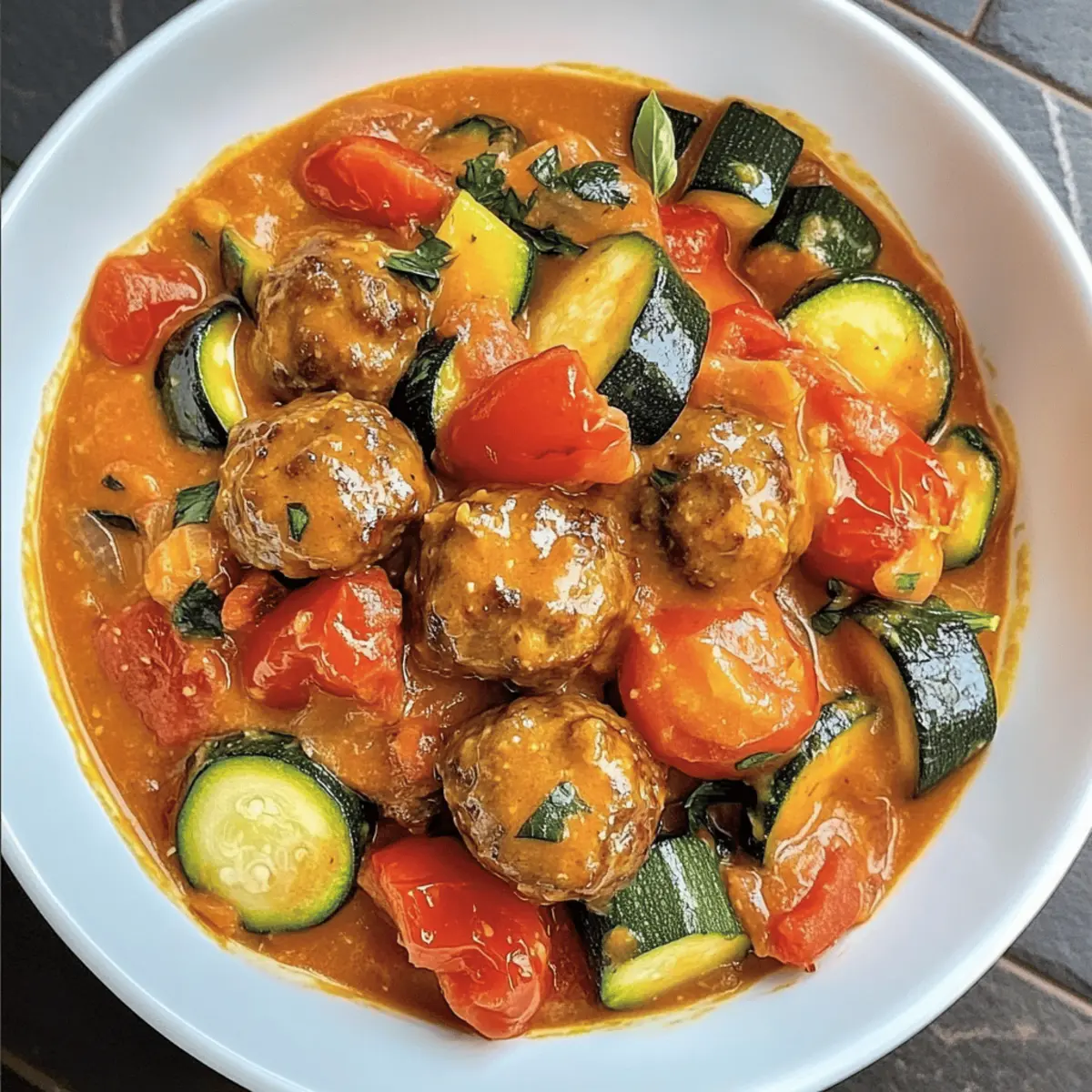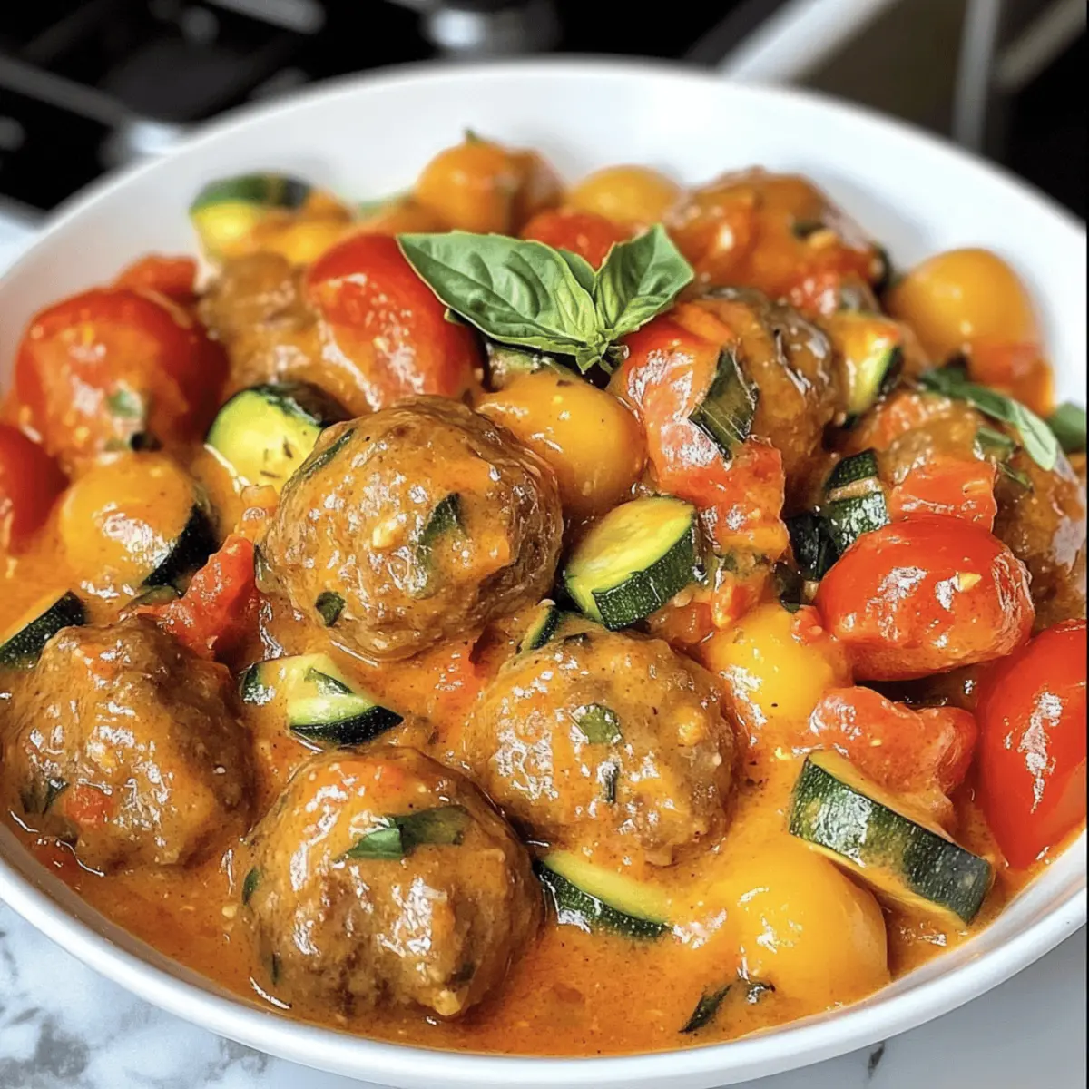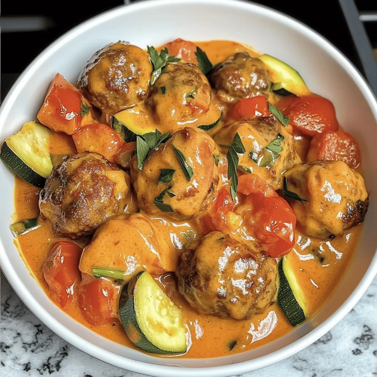 Stellen Sie sich vor, ein köstlicher Duft zieht durch Ihre Küche – saftige Hackbällchen Toscana, die aromatisch mit frischen Zucchini und reifen Tomaten kombiniert sind, warten darauf, von Ihnen entdeckt zu werden. Diese One-Pot-Mahlzeit bringt nicht nur mediterranen Flair auf den Tisch, sondern überzeugt auch durch ihre einfache Zubereitung und die Möglichkeit, eine Vielzahl von Zutaten zu verwenden. Egal, ob für ein schnelles Familienessen oder eine gemütliche Runde mit Freunden, diese Hackbällchen sind stets ein Hit. Und das Beste? Sie lassen sich spielend leicht an verschiedene Geschmacksvorlieben anpassen und sorgen dafür, dass jeder satt und glücklich nach Hause geht. Bist du bereit, loszulegen und deiner Familie eine Freude zu machen? Warum lieben wir Hackbällchen Toskana? Einfachheit, die begeistert: Diese Hackbällchen sind schnell und unkompliziert zuzubereiten. Ideal für stressige Wochentage oder unvorhergesehene Gäste! Vielseitigkeit, die Freude bringt: Ob Gemüse variieren oder eine vegane Version kreieren, die Möglichkeiten sind endlos. Herzhafter Genuss, der begeistert: Die Kombination aus frischen Zutaten und einer cremigen Tomatensauce sorgt für ein Geschmackserlebnis, das alle begeistert. Gesunde Wahl, die schmeckt: Perfekt für Low-Carb-Ernährung, wenn man sie mit Gemüse oder Blumenkohlreis serviert. Diese Hackbällchen sind die ideale Lösung, wenn man seinen Liebsten eine leckere Mahlzeit auf den Tisch zaubern möchte! Hackbällchen Toskana Zutaten Hinweis: Diese Zutatenliste reicht aus, um köstliche Hackbällchen Toskana zuzubereiten, die Ihr Abendessen bereichern werden. Für die Hackbällchen Gemischtes Hackfleisch (400g) – Sorgt für einen saftigen Geschmack; kann durch Pute oder Huhn ersetzt werden. Ei – Bindet die Zutaten zusammen; ein Flachsei kann für eine vegane Option verwendet werden. Geriebene Zwiebel – Fügt Feuchtigkeit hinzu, was die Hackbällchen zart macht; frische Zwiebel kann auch genutzt werden. Altes Brötchen (oder Semmelbrösel) – Agiert als Binder; kann durch glutenfreie Brösel ersetzt werden. Senf – Gibt zusätzliche Tiefe; kann weggelassen oder durch Dijon ersetzt werden. Gewürze (Salz, Pfeffer, Oregano, Tomatenmark) – Verstärken die Aromen und verleihen dem Gericht Charakter. Für die Soße Ersatzsahne (15% Fett) – Sorgt für die cremige Konsistenz der Soße; kann durch fettarmen Joghurt ersetzt werden. Zucchini – Fügt Frische und Textur hinzu; kann durch gelbe Zucchini ersetzt werden. Tomaten – Grundgeschmack für die Soße; frische oder konservierte Tomaten sind beide geeignet. Zwiebel – Verleiht der Soße ein reichhaltiges Aroma; Schalotten können eine milde Alternative sein. Gemüsebrühe – Schafft eine geschmackvolle Basis; kann auch durch Wasser ersetzt werden. Schritt-für-Schritt-Anleitung für Hackbällchen Toskana Step 1: Hackbällchen vorbereiten Vermengen Sie in einer großen Schüssel das gemischte Hackfleisch mit dem Ei, der geriebenen Zwiebel, dem alten Brötchen, dem Senf und den Gewürzen. Kneten Sie die Mischung gut durch, bis alle Zutaten gleichmäßig verteilt sind. Formen Sie dann mit den Händen kleine Bällchen, die etwa die Größe einer Walnuss haben. Legen Sie die geformten Hackbällchen auf einen Teller und stellen Sie sie beiseite. Step 2: Hackbällchen garen Vorheizen Sie den Ofen auf 200 Grad Celsius (ober-/unterhitze) oder bereiten Sie die Airfryer auf 180 Grad Celsius vor. Backen Sie die Hackbällchen auf einem mit Backpapier belegten Blech oder rösten Sie sie im Airfryer für etwa 10-15 Minuten, bis sie goldbraun und durchgegart sind. Achten Sie mit einem Fleischthermometer darauf, dass die Innentemperatur mindestens 75 Grad Celsius erreicht. Step 3: Gemüse anbraten Erhitzen Sie in einer großen Pfanne etwa 2 Esslöffel Olivenöl bei mittlerer Hitze. Geben Sie die gewürfelte Zwiebel hinzu und sautieren Sie sie etwa 3-5 Minuten, bis sie schön weich und glasig ist. Die Zwiebel sollte weich und leicht karamellisiert sein, wodurch sie ein reichhaltiges Aroma entfaltet, das die Basis für die Soße der Hackbällchen Toskana bietet. Step 4: Gemüse hinzufügen Fügen Sie die gewürfelte Zucchini und die gewürfelten Tomaten in die Pfanne hinzu und sautieren Sie alles zusammen für weitere 2 Minuten. Rühren Sie gelegentlich um, damit das Gemüse gleichmäßig gart und die Aromen sich harmonisch verbinden. Bei dieser kurzen Garzeit bleiben die Zucchini und Tomaten frisch und knackig. Step 5: Soße köcheln lassen Gießen Sie die Ersatzsahne in die Pfanne und fügen Sie die Gewürze hinzu. Rühren Sie alles gut um, bis sich die Sahne mit dem Gemüse vermischt hat. Lassen Sie die Mischung etwa 5 Minuten leicht köcheln, damit die Aromen sich entfalten können und die Soße leicht eindickt. Die Hackbällchen Toskana erhalten dadurch eine köstliche, cremige Textur. Step 6: Hackbällchen hinzufügen Geben Sie die fertig gebratenen Hackbällchen vorsichtig in die Soße und rühren Sie sanft um, sodass sie gut mit der cremigen Tomatensauce überzogen sind. Lassen Sie die Hackbällchen für etwa 2-3 Minuten in der Soße ziehen, damit sie die Aromen aufnehmen. Servieren Sie die Hackbällchen Toskana heiß mit Beilagen nach Wahl für ein fantastisches, herzhaftes Abendessen. Was passt zu Hackbällchen Toskana? Sichere dir ein herzhaftes italienisches Festmahl – die perfekten Beilagen für deine Hackbällchen Toskana bringen Genuss und Abwechslung auf den Tisch. Cremige Polenta: Ein samtig-zartes Karottenpüree ergänzt die Hackbällchen mit einer eleganten Textur und mildem Geschmack. Frischer Rucola-Salat: Der knackige, würzige Salat bringt eine erfrischende Note, die wunderbar mit der herzhaften Soße harmoniert. Verwöhne deine Gäste mit einem spritzigen Dressing aus Zitronensaft. Knoblauchbrot: Geröstetes, aromatisches Brot mit einer Knpirschigkeit, das perfekt ist, um die köstliche Soße aufzusaugen. Jeder Bissen wird zu einem Genuss! Zucchini-Nudeln: Eine leich