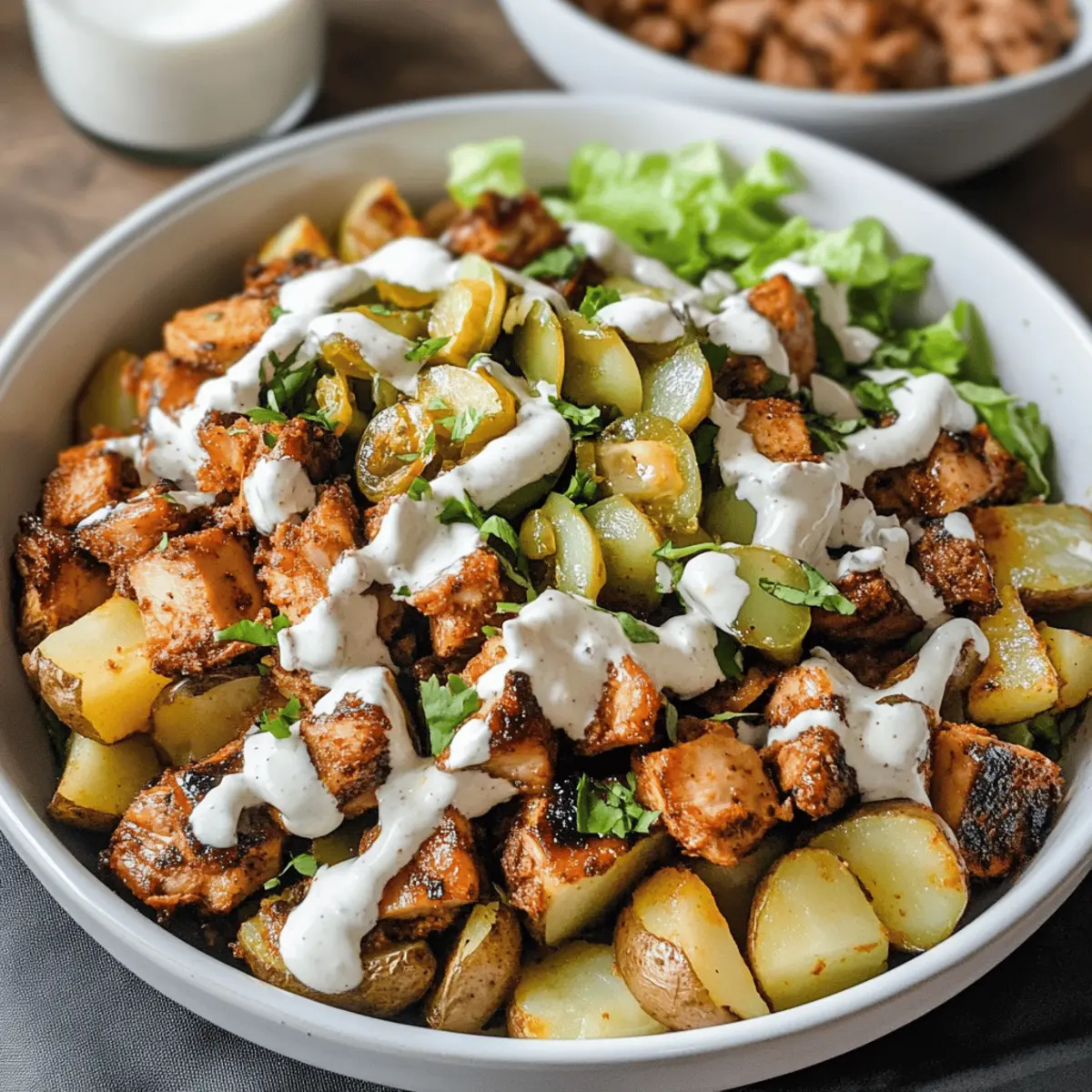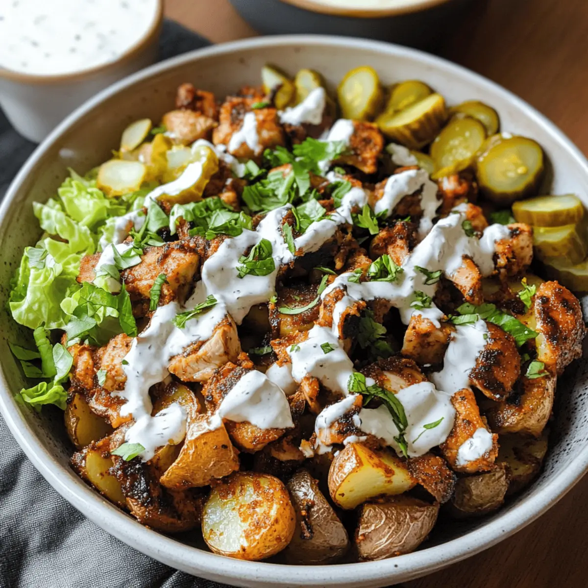 Nehmt eine Schüssel und gebt eine großzügige Portion der knusprigen, gerösteten Kartoffeln als Basis hinein. Schichtet darüber den frisch geriebenen Salat, gefolgt von den gewürfelten Hähnchenstücken und den gehackten Gewürzgurken. Zum Schluss könnt ihr die Knoblauchsauce gleichmäßig über die Schalen träufeln und einen Spritzer Granatapfelmelasse hinzufügen, um das Gericht zu verfeinern.
