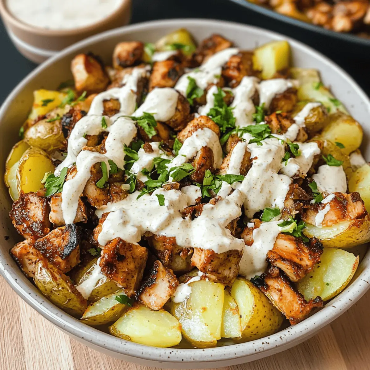 Jede Zutat trägt zu einem harmonischen und geschmackvollen Erlebnis der Hähnchen-Shawarma-Kartoffel-Schalen bei!