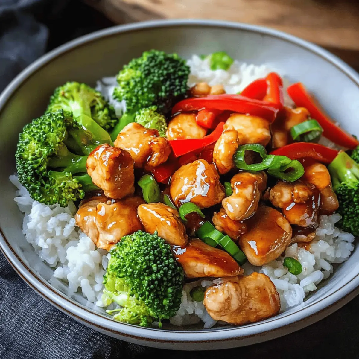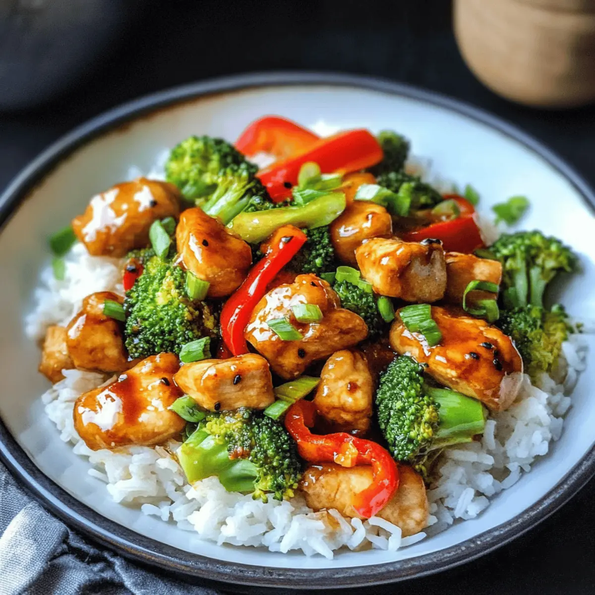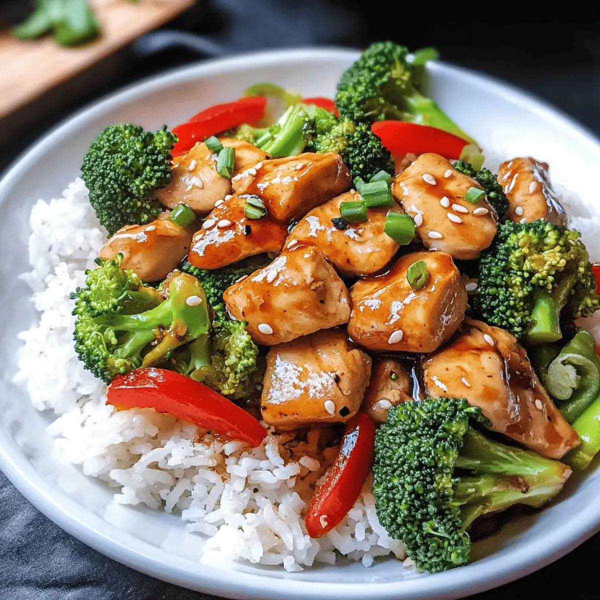 In der Hektik eines typischen Wochentags kann es eine kleine Herausforderung sein, gesunde und schmackhafte Mahlzeiten auf den Tisch zu bringen. Hier kommt mein Rezept für Hühnchen Teriyaki mit Brokkoli und Reis ins Spiel – es ist nicht nur ein echter Schnellschuss in der Küche, sondern auch voller Nährstoffe und Proteine, die dich bis zur nächsten Mahlzeit satt halten. Innerhalb von weniger als 40 Minuten zauberst du dieses einfache und köstliche Gericht, das dich und deine Lieben begeistern wird. Perfekt als Meal Prep geeignet, kannst du die Portionen für die Woche vorbereiten und dich immer wieder an diesem asiatischen Klassiker erfreuen. Bist du bereit, in die Welt des Geschmackserlebnisses einzutauchen? Lass uns gleich loslegen! Warum wirst du dieses Rezept lieben? Einfachheit pur: Mit wenigen Zutaten und unkomplizierten Schritten ist dieses Hühnchen Teriyaki ein Gericht, das selbst Kochanfänger leicht zubereiten können. Herzhafter Geschmack: Die Kombination aus zartem Hühnchen und der aromatischen Teriyaki-Marinade sorgt für eine Geschmacksexplosion auf deinem Teller. Vielseitigkeit: Dieses Rezept erlaubt zahlreiche Variationen – ob du Brokkoli mit knackigen Erbsen oder Quinoa statt Reis kombinierst, bleibt ganz dir überlassen! Schneller Genuss: In weniger als 40 Minuten ist dein köstliches Dinner serviert, perfekt für den hektischen Alltag. Gesund und nahrhaft: Reich an Proteinen und Nährstoffen sorgt dieser asiatische Klassiker für eine ausgewogene Ernährung und hält dich satt. Perfekt für Meal Prep: Bereite mehrere Portionen vor, um der Fast-Food-Verlockung zu entkommen. Dein zukünftiges Ich wird es dir danken! Hühnchen Teriyaki Zutaten Für die Marinade Öl (z.B. Sesamöl) – Fügt Geschmack und Feuchtigkeit hinzu; alternativ kannst du auch Raps- oder Olivenöl verwenden. Knoblauch (2-3 Zehen, gepresst) – Verstärkt den Geschmack; frisch ist am besten für maximales Aroma. Ingwerpulver (2 TL) – Sorgt für würzige Wärme; kann durch frischen Ingwer für einen intensiveren Geschmack ersetzt werden. Sojasauce (6 EL) – Basis der Marinade, sorgt für Umami-Geschmack; verwende eine natriumarme Variante, um den Salzgehalt zu reduzieren. Wasser (2 EL) – Verdünnt die Marinade; kann durch mehr Sojasauce für zusätzlichen Geschmack ersetzt werden. Essig (3 TL, z.B. Reisessig) – Fügt Säure hinzu; kann durch Apfelessig für einen ähnlichen Geschmack ersetzt werden. Zucker (3 TL) – Balanciert die Salzigkeit der Sojasauce aus; kann weggelassen oder durch Honig bzw. Agavendicksaft ersetzt werden. Für das Gericht Hühnchenfilets (350g) – Die Hauptproteinquelle, saftig und zart, wenn mariniert; achte auf hochwertige, freilaufende Hühner für den besten Geschmack. Reis (120g, ungekocht) – Liefert Kohlenhydrate; kann durch Quinoa oder Blumenkohlreis für eine Low-Carb-Option ersetzt werden. Brokkoli (500g) – Fügt Ballaststoffe und Nährstoffe hinzu; kann durch andere Gemüse wie Zuckerschoten oder Karotten ersetzt werden. Öl zum Braten (10g) – Sorgt für gleichmäßiges Garen; nutze ein Antihaftspray für weniger Fett. Rote Paprika (2) – Fügt Crunch und Süße hinzu; die Vielseitigkeit erlaubt den Austausch durch andere bunte Paprika oder Gemüsemischungen. Frühlingszwiebeln (1-2) – Bietet aromatische Frische und Garnitur; kann durch Schnittlauch für einen milderen Geschmack ersetzt werden. Brühe (80ml) – Verstärkt den Umami-Geschmack; mische mit Sojasauce für einen intensiveren Geschmack. Mondstärke (1 TL) – Dient zur Verdickung der Sauce; kann durch Pfeilwurzelmehl ersetzt oder weggelassen werden. Sesamkörner (15g) – Garnierung, die einen nussigen Geschmack hinzufügt; kann durch Sonnenblumenkerne für nussfreie Diäten ersetzt werden. Schritt-für-Schritt-Anleitung für Hühnchen Teriyaki Step 1: Marinade zubereiten Mische in einer Schüssel das Öl, den gepressten Knoblauch, Ingwerpulver, Sojasauce, Wasser, Essig und Zucker gut zusammen. Rühre kräftig um, bis der Zucker vollständig aufgelöst ist. Diese aromatische Marinade ist die Grundlage für dein Hühnchen Teriyaki und sorgt für einen unverwechselbaren Geschmack. Step 2: Hühnchen marinieren Schneide die Hühnchenfilets in mundgerechte Stücke und gib sie in die vorbereitete Marinade. Stelle sicher, dass jedes Stück gut mit der Marinade bedeckt ist. Lass das Hühnchen mindestens 30 Minuten lang im Kühlschrank marinieren, damit es die Aromen aufnehmen kann. Dies verleiht dem Gericht eine köstliche Tiefe. Step 3: Reis kochen Während das Hühnchen marinierte, koche den Reis gemäß den Verpackungsanweisungen in einem Topf mit leicht gesalzenem Wasser. Bring das Wasser zum Kochen, reduziere die Hitze und lasse den Reis bei niedriger Hitze garen, bis er weich und das Wasser vollständig absorbiert ist. Dies dauert normalerweise etwa 10-15 Minuten. Step 4: Brokkoli vorbereiten Schneide den Brokkoli in gleichmäßige Röschen und dämpfe sie in einem Dampfgarer oder einem Topf mit einem Dämpfeinsatz für etwa 10 Minuten. Der Brokkoli sollte zart, aber noch knackig sein, damit er Farbe und Nährstoffe behält. Dies ist eine perfekte Ergänzung zu deinem Hühnchen Teriyaki. Step 5: Gemüse schneiden Nimm die roten Paprika und schneide sie in Ringe. Bei den Frühlingszwiebeln entferne die Wurzelenden und schneide sie in feine Ringe. Dieses frische Gemüse wird deinem Gericht nicht nur Farbe, sondern auch zusätzlichen Geschmack verleihen und ist eine willkommene Komponente in deinem Hühnchen Teriyaki. Step 6: Hühnchen anbraten Erhitze etwas Öl in einer großen Pfanne bei mittlerer Hitze. Füge das marinierte Hühnchen hinzu und koche es für etwa 5-7 Minuten, bis es schön gebräunt und durchgegart ist. Rühre häufig um, um eine gleichmäßige Garung zu gewährleisten. Das zarte Hühnchen wird jetzt perfekt für das Hühnchen Teriyaki. Step 7: Gemüse hinzufügen Gib die geschnittenen roten Paprika in die Pfanne und brate sie 2 Minuten lang mit dem Hühnchen an.