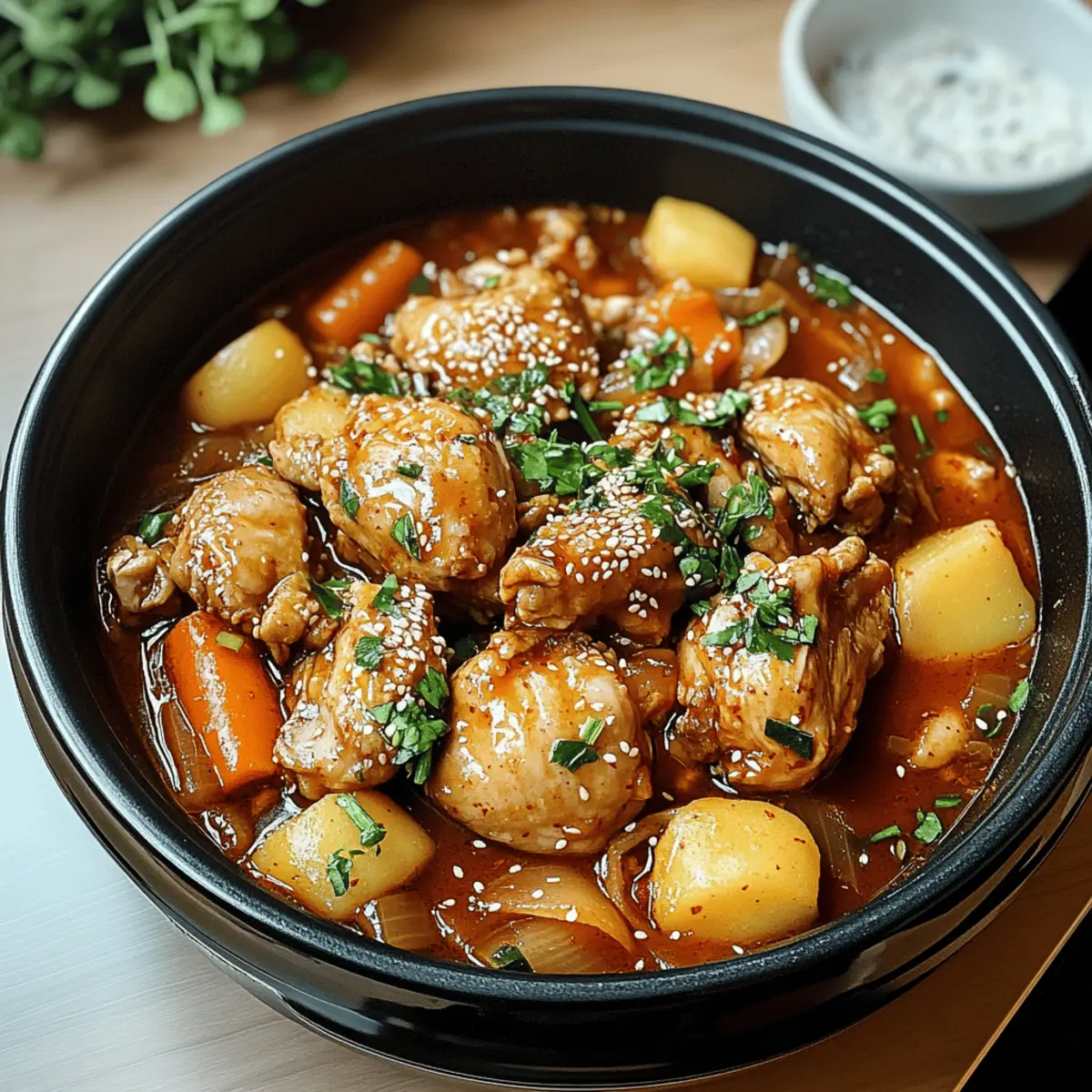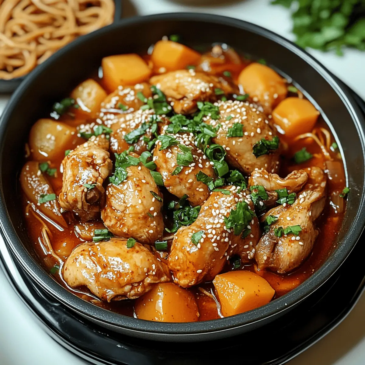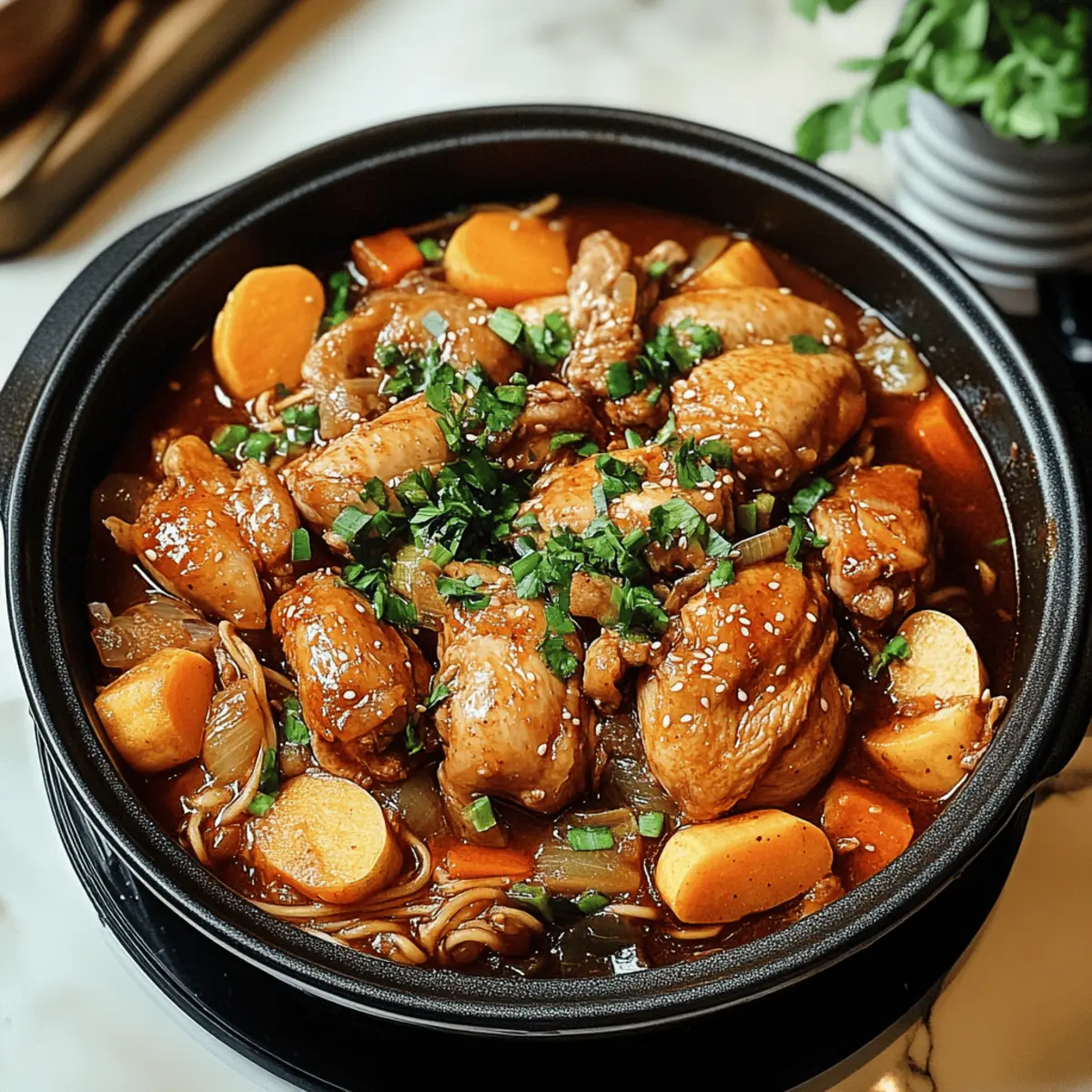 In der kühlen Herbstluft, wenn die Blätter ihre Farben wechseln, kann ich das verlockende Aroma von Jjimdak, einem koreanischen Schmortopf mit Huhn, förmlich riechen. Diese köstliche Mischung aus zartem Hühnerfleisch, frischem Gemüse und den einzigartigen Süßkartoffelnudeln vereint sich in einer herzhaften Soße, die das Herz erwärmt. Diese Jjimdak koreanische geschmorte Hühnergerichte eignet sich perfekt für gemütliche Abende und ist ein echter Crowd-Pleaser, der in nur 80 Minuten zubereitet werden kann. Besonders erfreulich ist, dass die Zubereitung in einem einzigen Topf erfolgt – weniger Abwasch, mehr Genuss! Seid ihr bereit, eure Küche in ein Stück Korea zu verwandeln und eure Liebsten mit einem herzlichen Gericht zu verwöhnen? Warum ist Jjimdak ein Muss? Einfache Zubereitung: Mit nur einem Topf könnt ihr dieses köstliche Gericht schnell und bequem zubereiten. Herzhafter Geschmack: Die Kombination aus Huhn, Gemüse und würziger Soße schafft ein unverwechselbares Geschmackserlebnis. Vielseitige Zutaten: Ihr könnt die Zutaten nach Belieben anpassen, um eure eigenen Variationen zu kreieren, sei es mit Tofu oder verschiedenen Gemüsesorten. Perfekt für gesellige Abende: Serviert in einer großen Schüssel, wird es zum Highlight eurer gemeinsamen Mahlzeiten. Zeitersparnis: In nur 80 Minuten könnt ihr ein herzhaftes Essen auf den Tisch bringen. Also, macht euch bereit, eure Familie oder Freunde mit diesem wunderbaren Jjimdak zu verwöhnen! Jjimdak Zutaten • Entdecke, wie du mit diesen einfachen Zutaten ein köstliches Jjimdak zubereitest! Für das Huhn Hühnchenstücke (2 lbs) – Die Hauptproteinquelle; gerne eine Kombination aus Schenkeln, Ober- und Unterkeulen verwenden. Vegetarisches Öl – Zum Anbraten des Huhns und für eine schöne goldene Farbe. Für die Soße Sojasauce (½ Tasse) – Sie sorgt für Umami und salzige Noten in der Soße. Mirin (¼ Tasse) – Verleiht eine sanfte Süße; kann durch eine Mischung aus Weißwein und Zucker ersetzt werden. Brauner Zucker (¼ Tasse) – Süßt das Gericht und balanciert die Salzigkeit. Gehackter Knoblauch (1 EL) – Bringt aromatische Tiefe. Gehackter Ingwer (1 EL) – Fügt Wärme und Geschmack hinzu. Schwarzer Pfeffer (1 TL) – Gibt eine leichte Schärfe. Wasser (2 Tassen) – Bildet die Braise. Für das Gemüse Zwiebel (1 große, in Scheiben) – Sorgt für Süße und Textur. Kartoffeln (2 große, geschält und gewürfelt) – Bieten herzhaften Biss und absorbieren die Aromen. Karotte (1, geschält und in Scheiben) – Bringt Süße und Farbe. Champignons (1 Tasse, in Scheiben) – Trägt zur Erdigkeit und Geschmacksintensität bei. Grüne Zwiebeln (2, gehackt) – Für Frische und Farbe. Rote Chili (1, in Scheiben, optional) – Fügt Schärfe hinzu. Für die Nudeln Süßkartoffelstärke-Nudeln (5 oz) – Bieten eine zähe Textur; können bei Bedarf durch andere Nudeln ersetzt werden. Zum Garnieren Sesamöl (1 EL) – Verstärkt den Geschmack mit Nussigkeit. Sesamsamen (1 EL) – Für den perfekten Crunch und eine ansprechende Optik. Salz – Nach Geschmack, um das Aroma zu harmonisieren. Step-by-Step Instructions für Jjimdak Koreanische geschmorte Hühnergerichte Step 1: Huhn anbraten Erhitze in einem großen Topf bei mittlerer Hitze etwas Pflanzenöl. Brate die Hühnchenstücke für etwa 4-5 Minuten auf jeder Seite an, bis sie eine goldene Farbe zeigen. Dies sorgt für eine leckere Kruste und Geschmack. Achte darauf, dass das Öl heiß genug ist, um das Huhn knusprig zu braten. Step 2: Soße zubereiten In einer separaten Schüssel vermische die Sojasauce, Mirin, braunen Zucker, Knoblauch, Ingwer und schwarzen Pfeffer. Rühre gut um, bis der Zucker vollständig aufgelöst ist. Diese Kombination wird die geschmackvolle Basis für das Jjimdak sein und trägt zu einer reichhaltigen Soße bei. Step 3: Huhn mit Soße übergießen Gieße die vorbereitete Soße über die angebratenen Hühnchenstücke im Topf. Füge außerdem 2 Tassen Wasser hinzu und bringe alles zum Kochen. Sobald es kocht, reduziere die Hitze auf mittel-niedrig und lasse das Jjimdak für etwa 15 Minuten köcheln, bis das Huhn durchgegart ist. Step 4: Gemüse hinzufügen Für zusätzlichen Geschmack und Nährstoffe füge die geschnittene Zwiebel, die gewürfelten Kartoffeln und die Karottenscheiben hinzu. Decke den Topf ab und lasse alles zusammen für weitere 10 Minuten garen. Die Aromen verbinden sich in dieser Zeit perfekt und das Gemüse wird zart. Step 5: Pilze unterrühren Gib die geschnittenen Champignons in den Topf und rühre alles vorsichtig um. Lasse das Jjimdak für 5 Minuten weiterkochen, bis die Pilze weich sind und ihren Geschmack an die Soße abgegeben haben. Achte darauf, dass das Gemüse gleichmäßig durchgart, um eine gute Konsistenz zu erzielen. Step 6: Nudeln hinzufügen Lass die Süßkartoffelstärke-Nudeln in Wasser einweichen und drücke überflüssiges Wasser aus. Füge die Nudeln anschließend in den Topf und koche sie unter gelegentlichem Rühren für etwa 5-7 Minuten oder bis sie schön zart sind. Die Nudeln nehmen die köstlichen Aromen der Soße auf. Step 7: Finales Würzen Mische die gehackten grünen Zwiebeln und die optionalen Chilis ein. Gieße das Sesamöl über das Jjimdak und streue die Sesamsamen darüber. Korrigiere den Geschmack mit etwas Salz, um die Aromen schön auszubalancieren. Diese Schritte geben dem Gericht den letzten Schliff. Step 8: Servieren und genießen Nehme den Topf vom Herd und lasse das Jjimdak für einige Minuten ruhen, damit die Aromen sich setzen können. Serviere das Gericht heiß in einer großen Schüssel, garniert mit zusätzlichen Sesamsamen und grünen Zwiebeln. Genieße diese köstliche koreanische Spezialität mit Familie oder Freunden! Jjimdak Variationen und Alternativen Fühle dich frei, mit diesen Ideen zu experimentieren und dein Jjimdak ganz nach deinem Geschmack zuzubereiten! Vegetarisch: Tausche das Huhn gegen Tofu oder Seitan aus, um eine köstliche Version für Veg