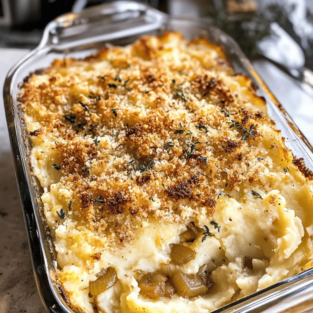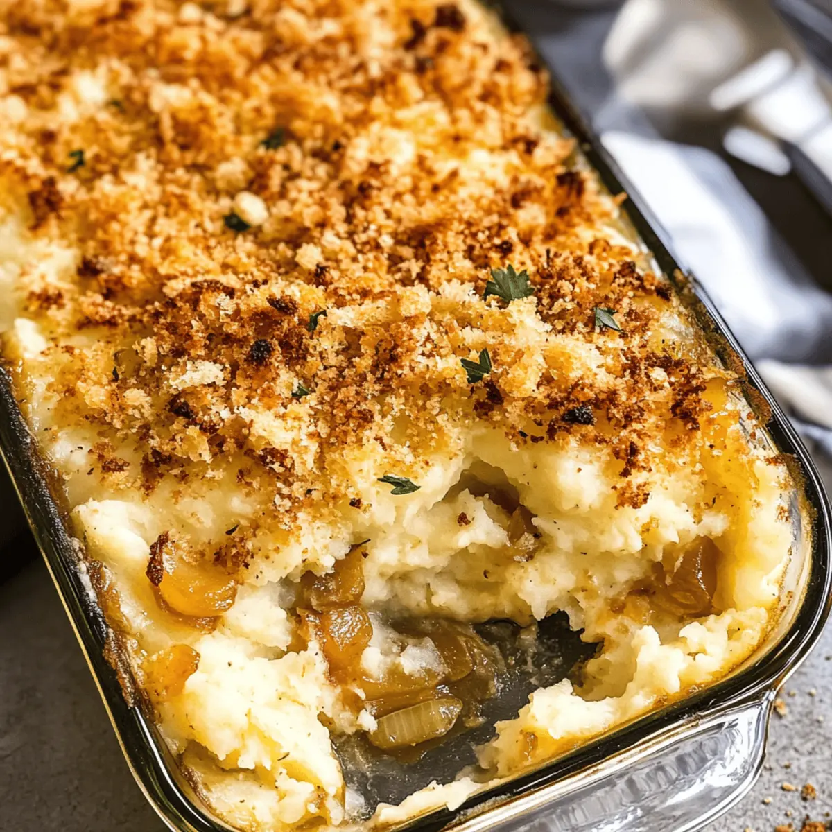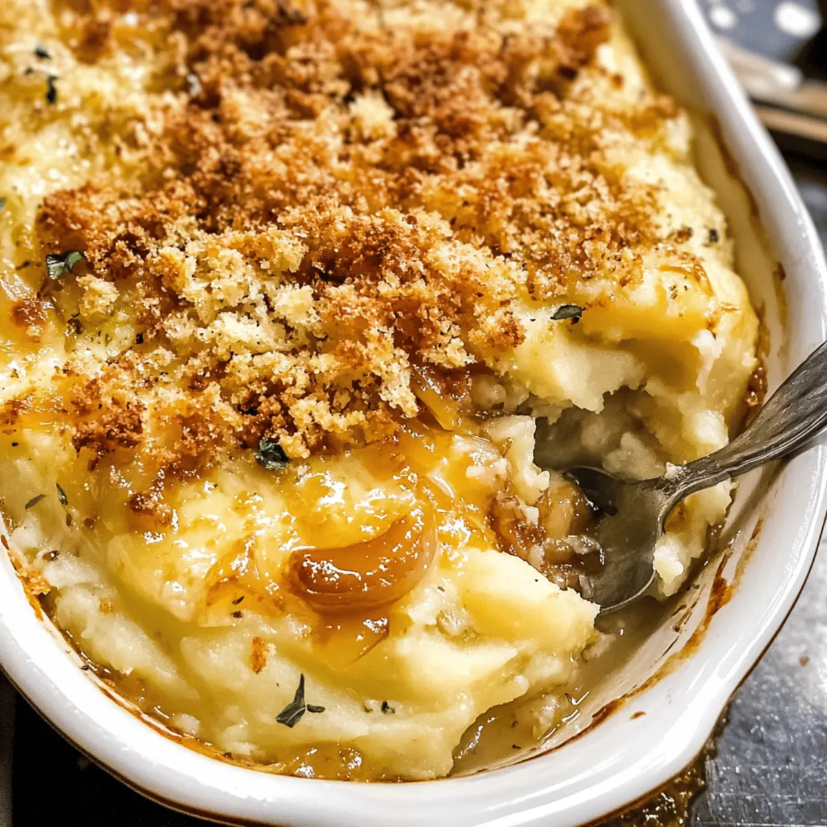 Wusstest du, dass einfache Zutaten in den Händen eines leidenschaftlichen Kochs zu einem Festmahl werden können? Es ist kaum zu glauben, wie köstlich und befriedigend unser Käse karamellisierte Zwiebel Kartoffelauflauf ist! Diese cremige und herzhafte Beilage kombiniert zarte, aufeinander abgestimmte Kartoffeln mit süßen, karamellisierten Zwiebeln und einer Melange aus schmelzenden Käsesorten. Ein weiterer Vorteil: Du kannst dieses Gericht bereits im Voraus zubereiten, was dir an festlichen Tagen wertvolle Zeit spart. Perfekt, um deine Gäste zu beeindrucken und gleichzeitig den Stress zu minimieren! Bist du bereit, deine nächste Familienfeier mit diesem Komfortessen zu bereichern? Warum ist dieser Kartoffelauflauf ein Muss? Einfachheit pur: Mit nur wenigen Zutaten kannst du ganz leicht einen luxuriösen Käse karamellisierte Zwiebel Kartoffelauflauf zaubern. Reichhaltiger Geschmack: Die Kombination aus süßen, karamellisierten Zwiebeln und cremigem Käse sorgt für ein unvergleichliches Geschmackserlebnis, das die Herzen deiner Gäste höher schlagen lässt. Vielseitig: Dieser Auflauf passt perfekt zu jedem Festessen, egal ob Weihnachten oder ein Grillabend. Zeitersparnis: Bereite ihn im Voraus vor und genieße die Feier ohne Stress! Klassisches Komfortessen: Jeder Bissen ist ein Stück Heimatküche, das euch alle um den Tisch versammeln wird. Käse karamellisierte Zwiebel Kartoffelauflauf Zutaten Die perfekten Zutaten für dein Festmahl: Um diesen köstlichen Käse karamellisierte Zwiebel Kartoffelauflauf zu kreieren, benötigst du einige meist alltägliche, aber essenzielle Zutaten. Für die Kartoffeln: • Yukon Gold oder Russet Kartoffeln – Sie bieten eine cremige Textur und einen buttery Geschmack; Yukon Gold ist extra empfehlenswert. • Salz – Essenziell für die Geschmacksverstärkung; verwende für eine feine Note Meersalz. • Salzbutter – Sie verstärkt den Reichtum und Geschmack; unsalzen kann auch verwendet werden, passe dann das Salz entsprechend an. • Schlagsahne – Sie sorgt für die cremige Konsistenz; halb und halb ist eine leichtere Option. Für die Zwiebelmischung: • Gelbe Zwiebeln – Sie verleihen durch Karamellisierung Süße und Tiefe; süße Zwiebeln sind ebenfalls eine gute Wahl. • Französischer Zwiebeldip – Introduziert Umami und Cremigkeit; kann durch saure Sahne oder einen hausgemachten Zwiebel-Dip ersetzt werden. Für den Käse: • Gruyere Käse – Er bietet einen nussigen Geschmack; Emmentaler oder Fontina sind großartige Alternativen. • Schweizer Käse – Fügt eine milde Cremigkeit hinzu; kann durch Havarti oder Monterey Jack ersetzt werden. • Parmesan Käse – Er gibt einen scharfen Geschmack und sorgt für eine goldene Kruste; geriebener Pecorino ist eine gute Substitute. Für die Kruste: • Krustenbrot – Verwendung für das Breadcrumb-Topping, das Knusprigkeit hinzufügt; altes Brot sorgt für den besten Crunch, glutenfreies Brot ist auch möglich. • Olivenöl – Verbindet die Breadcrumbs und fügt Feuchtigkeit hinzu; Avocadoöl kann eine gute Alternative sein. • Salz – Verbessert alle anderen Geschmäcker; achte auf eine Prise nach deinem persönlichen Geschmack. Damit steht dem Genuss deines Käse karamellisierten Zwiebel Kartoffelauflaufs nichts mehr im Wege! Bereite dich darauf vor, deine Familie und Freunde mit diesem köstlichen Komfortessen zu begeistern. Schritt-für-Schritt-Anleitung für Käse karamellisierte Zwiebel Kartoffelauflauf Step 1: Zwiebeln karamellisieren Schmelze 4 Esslöffel Butter in einer Pfanne bei mittlerer Hitze. Füge die dünn geschnittenen Zwiebeln hinzu und koche sie etwa 10 Minuten, bis sie weich sind. Reduziere die Hitze auf mittel-niedrig und koche die Zwiebeln weitere 40-50 Minuten, bis sie sehr weich und goldbraun sind. Rühre regelmäßig um, damit nichts anbrennt. Step 2: Kartoffeln vorbereiten Schäle und viertel die Kartoffeln und gib sie in einen großen Topf. Füge 1 Esslöffel Salz hinzu und bedecke die Kartoffeln mit Wasser. Koche die Kartoffeln für 20-30 Minuten, bis sie mit einer Gabel zart sind. Gieße das Wasser ab und lasse die Kartoffeln kurz ausdampfen. Step 3: Zutaten kombinieren Heize den Ofen auf 190°C vor. Gib die restliche Butter, die Schlagsahne und 1 Teelöffel Salz in den Topf zu den Kartoffeln. Füge die abgetropften Kartoffeln, die karamellisierten Zwiebeln, den französischen Zwiebeldip und die Hälfte des Käses hinzu. Zerdrücke alles zu einer glatten Masse und überführe die Mischung in eine Auflaufform. Step 4: Semmelbrösel vorbereiten Zerkleinere das Krustenbrot in einer Küchenmaschine, bis es krümelig ist. Mische die Semmelbrösel mit Parmesan, Olivenöl und einer Prise Salz in einer Schüssel. Verteile die Mischung gleichmäßig auf ein mit Backpapier ausgelegtes Blech und backe sie für etwa 10 Minuten, bis sie goldbraun sind. Step 5: Auflauf zusammenstellen und backen Streue den restlichen Käse über die Kartoffelmasse in der Auflaufform. Bedecke die Mischung mit den vorbereiteten Semmelbröseln. Decke die Form mit Folie ab und backe den Käse karamellisierten Zwiebel Kartoffelauflauf für 30 Minuten. Entferne die Folie in den letzten 10-15 Minuten, bis die Kruste goldbraun und der Käse geschmolzen ist. Tipps für den besten Käse karamellisierte Zwiebel Kartoffelauflauf Perfekte Zwiebeln: Stelle sicher, dass du die Zwiebeln bei niedriger Hitze karamellisierst, um ein süßes, tiefes Aroma zu erhalten. Schnelles Kochen führt oft zu bitterem Geschmack. Raumtemperatur Kartoffeln: Lasse die vorgekochten Kartoffeln vor dem Backen kurz bei Raumtemperatur stehen. So garen sie gleichmäßiger und die Textur bleibt cremig. Käsevariation: Experimentiere mit verschiedenen Käsesorten, um den Geschmack zu personalisieren. Gruyere und Emmental sind ausgezeichnete Optionen! Semmelbrösel vorbereiten: Nutze eine Küchenmaschine, um Semmelbrösel schnell und gleichmäßig zu zerkleinern. Achte darauf, dass sie nicht zu fein werden – das sor