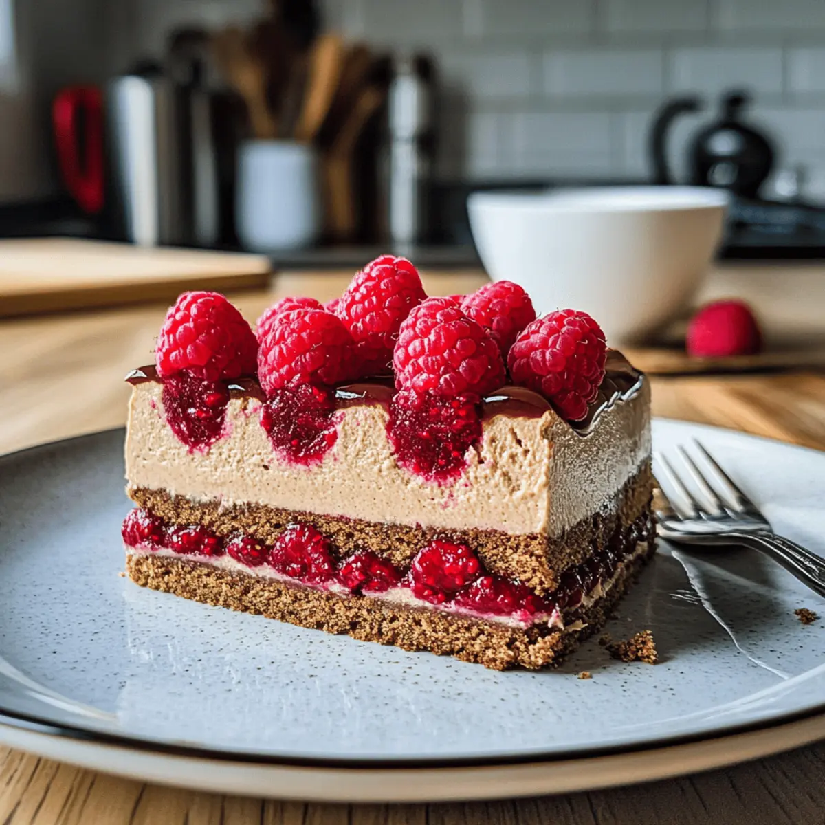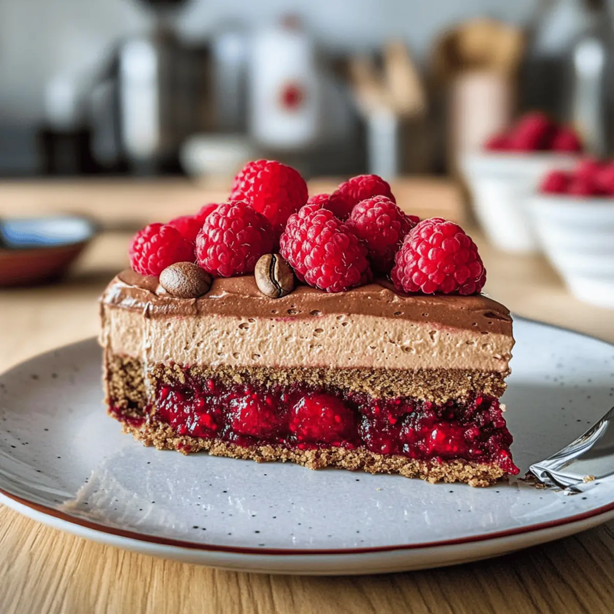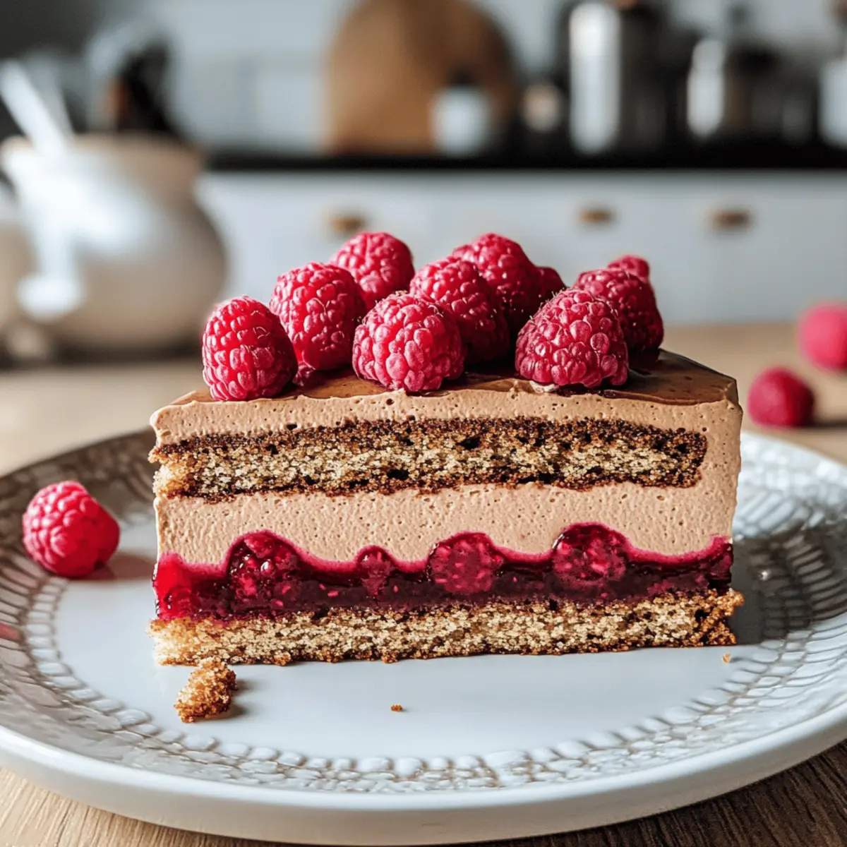 Es spricht sich schnell herum: Wenn der Kaffeeduft durch die Küche zieht und die Himbeeren in der Schüssel leuchten, ist es Zeit für eine süße Verführung – die köstliche Kaffeemousse-Torte mit Himbeeren. Dieses Rezept verbindet die anregende Note von aromatischem Kaffee mit der fruchtigen Frische der Himbeeren und lädt dazu ein, sich in jeder Schicht dieses traumhaften Desserts zu verlieren. Nicht nur ist die Torte schnell zubereitet, sie beeindruckt auch mit ihrer luftigen Konsistenz und dem knackigen Boden, was sie zum perfekten highlight für jeden Anlass macht. Warum sich mit gewöhnlichen Desserts zufriedengeben, wenn du die Möglichkeit hast, diese himmlische Kombination selbst zu kreieren? Bist du bereit, deine Gäste zu begeistern? Warum wirst du diese Torte lieben? Verführung für die Sinne: Die Kombination aus aromatischem Kaffee und fruchtigen Himbeeren wird dich und deine Gäste sofort begeistern. Unwiderstehlich einfach: Das Rezept ist unkompliziert und benötigt lediglich grundlegende Backfähigkeiten – perfekt auch für Backanfänger! Luftige Texturen: Die köstliche Kaffeemousse, kombiniert mit einem knackigen Haselnussboden, sorgt für ein einzigartiges Geschmackserlebnis, das auf der Zunge zergeht. Vielseitig einsetzbar: Egal ob für eine Feier oder als süßer Abschluss eines Familienessens, diese Torte ist der absolute Hingucker! Zeitersparnis: In kürzester Zeit zubereitet, bleibt dir mehr Zeit, um Momente mit deinen Liebsten zu genießen. Auch die Aufbewahrung funktioniert hervorragend; einfach im Kühlschrank aufbewahren! Lass dich inspirieren und entdecke auch andere köstliche Rezepte wie Rhabarberkuchen Mit Mascarpone oder Gefüllte Paprika Mit! Kaffeemousse-Torte mit Himbeeren Zutaten • Für diese köstliche Kaffeemousse-Torte benötigst du die folgenden Zutaten: Für den Boden • Haselnüsse (200 g) – Verleiht dem Boden einen knackigen Biss und Geschmack; alternative Nüsse können auch verwendet werden. • Butterkekse (100 g) – Sie bilden die Grundlage; glutenfreie Kekse sind eine tolle Option. • Crepes Dentelle (60 g) – Sorgt für einen zusätzlichen Crunch; ersetze sie durch zerbröselte Kekse, wenn nötig. • Butter (50 g + 100 g) – Macht den Boden saftig und reichhaltig; achte darauf, weiche oder geschmolzene Butter zu verwenden. Für die Mousse • Kaffeegranulat (1 TL + 2 EL) – Bringt den intensiven Kaffeegeschmack; nutze entkoffeinierte Granulate für eine mildere Variante. • Milch (140 ml) – Fügt Cremigkeit hinzu; pflanzliche Milch kann ebenfalls verwendet werden. • Eigelb (2) – Bindet die Mousse und sorgt für eine reichhaltige Textur; ersetze sie durch Leinsamen-Eier für eine ei-freie Version. • Weißschokolade (100 g) – Gibt eine süße, cremige Note; Kokoscreme eignet sich als milchfreie Alternative. • Mascarpone (200 g) – Macht die Mousse reichhaltig und cremig; eine vegane Alternative kann genutzt werden. • Gelatine (3 Blätter) – Stabilisiert die Mousse; Agar-Agar ist eine tolle vegetarische Option. • Schlagsahne (200 g) – Sorgt für Volumen und Cremigkeit; auch pflanzliche Schlagsahne kann verwendet werden. Für die Himbeerschicht • Himbeeren (200 g frisch + 200 g TK) – Versorgen die Torte mit fruchtigem Geschmack; Blaubeeren oder Erdbeeren sind auch lecker. • Speisestärke (1 gestrichener TL) – Dicker die Himbeer-Compote; Maisstärke ist ein geeigneter Ersatz. Für das Finish • Zucker (130 g + 30 g + 2 EL) – Gibt der Torte Süße; passe die Menge nach deinem Geschmack an. • Kakaopulver – Für das Stauben der Torte; eine optionale Dekoration für die Präsentation. Tauche ein in die Welt der köstlichen Aromen mit dieser himmlischen Kaffeemousse-Torte mit Himbeeren! Step-by-Step Instructions for Kaffeemousse-Torte mit Himbeeren Step 1: Ofen vorheizen Heize deinen Ofen auf 175°C (Ober-/Unterhitze) vor. Während der Ofen auf Temperatur kommt, kannst du den Boden für die Kaffeemousse-Torte vorbereiten. Achte darauf, dass du alle Zutaten bereitstellst, um einen reibungslosen Ablauf zu gewährleisten. Step 2: Haselnüsse vorbereiten Toast die Haselnüsse in einer Pfanne bei mittlerer Hitze, bis sie goldbraun und aromatisch sind (ca. 5-7 Minuten). Lass sie leicht abkühlen und mahle sie anschließend grob. Mische die gemahlenen Nüsse mit Zucker und etwas Wasser in einem Topf, um ein Haselnuss-Praliné zu kreieren. Lass es leicht karamellisieren, bis es eine Paste bildet. Step 3: Boden mixen Vermenge die zerbröselten Butterkekse mit der geschmolzenen Butter und den zerbrochenen Crepes Dentelle in einer Schüssel. Gut umrühren, bis die Mischung feucht, aber körnig ist. Drücke die Mischung gleichmäßig in den Boden einer Springform, um den crunchy Boden der Kaffeemousse-Torte zu bilden. Step 4: Kaffeesponge zubereiten Schlage in einer Schüssel die weiche Butter mit Zucker und Kaffeegranulat schaumig. Füge nacheinander die Eier hinzu und mische alles gut, bis die Masse homogen ist. Siebe das Mehl und das Backpulver in die Mischung, und hebe die Zutaten vorsichtig unter, um eine luftige Konsistenz zu bewahren. Step 5: Backen Gieße den Teig in die vorbereitete Springform auf den Boden und backe ihn für etwa 35 Minuten. Der Kuchen sollte leicht goldbraun und elastisch sein. Lass ihn nach dem Backen vollständig abkühlen, bevor du mit dem nächsten Schritt fortfährst. Step 6: Kaffeesirup vorbereiten Während der Kuchen abkühlt, kannst du einen Sirup aus heißem Kaffee zubereiten. Koche 15 ml Wasser mit 2 EL Zucker, bis sich der Zucker aufgelöst hat. Füge 15 ml heißen Kaffee hinzu und lasse die Mischung abkühlen. Dieser Sirup wird später verwendet, um den Kuchen zu tränken. Step 7: Himbeeren verarbeiten Nimm die gefrorenen Himbeeren und koche sie in einem Topf mit 30 g Zucker und einer Prise Salz. Lass die Mischung für ca. 10 Minuten köcheln, bis die Himbeeren sanft zerfallen. Mische die Speisestärke in etwas kaltem Wasser und füge sie hinzu, um die Compote zu ve
