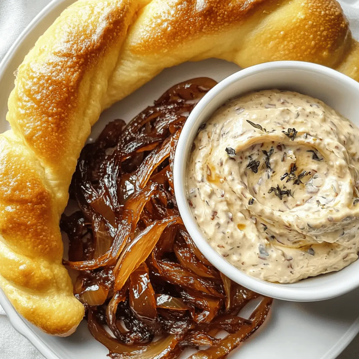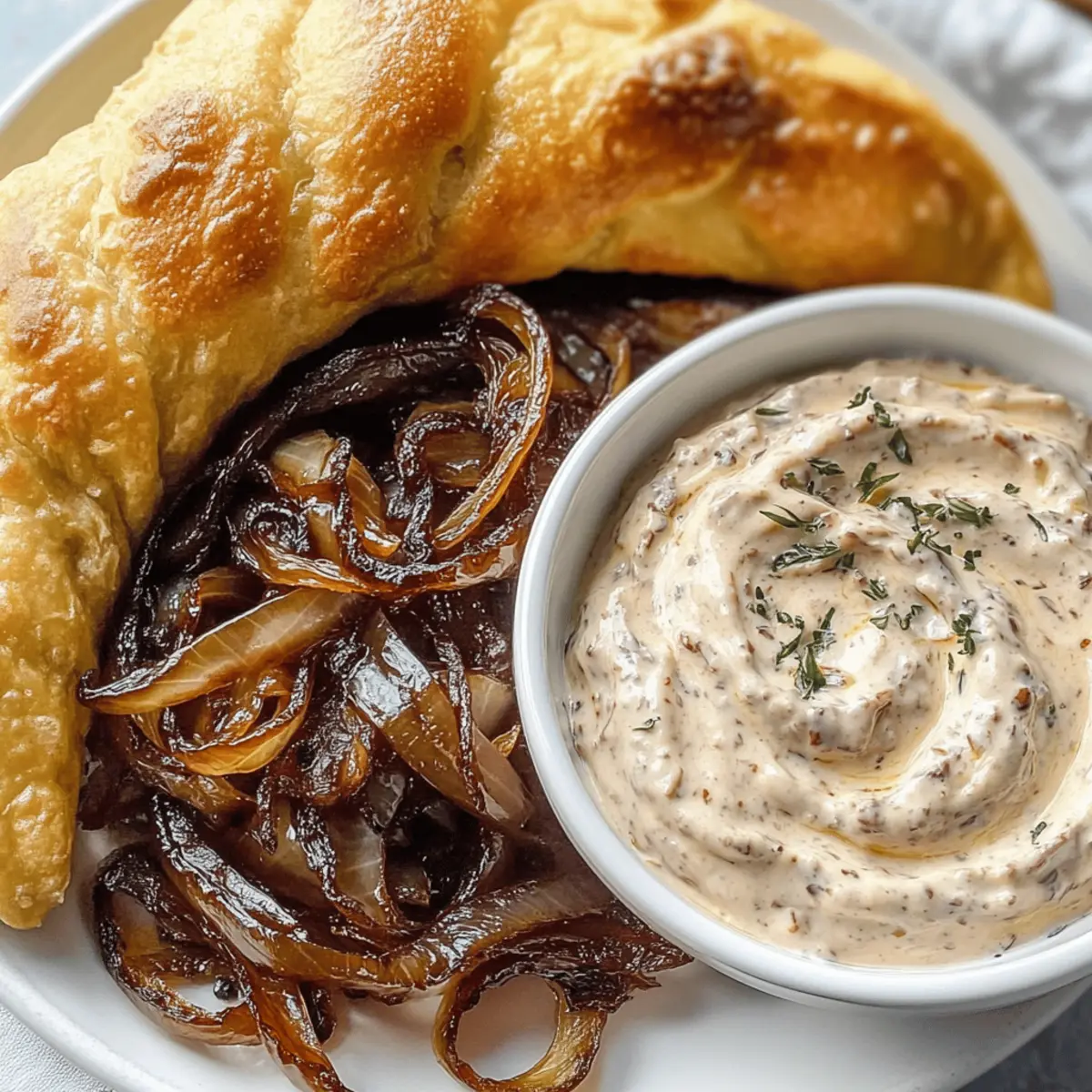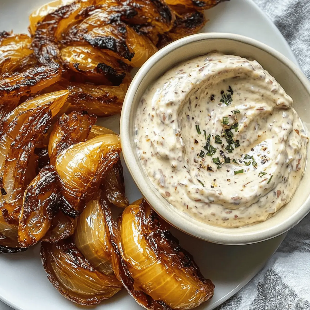 In einer lebhaften Küche, in der der Duft von gebratenen Zwiebeln die Luft erfüllt, erinnere ich mich an die zahlreichen Gelegenheiten, bei denen karamellisierte Zwiebeln der Star auf meinem Tisch waren. Diese einfachen, aber schmackhaften Leckerbissen sind nicht nur ein Genuss für die Gaumenfreuden, sondern auch die perfekte Ergänzung für jede Party oder ein gemütliches Abendessen. Mein Rezept für karamellisierte Zwiebeln mit cremigem Dip verspricht zudem eine schnelle Zubereitung, sodass Sie mehr Zeit mit Ihren Gästen verbringen können. Ob als veganisierte Variante oder mit klassischem Frischkäse – der Dip rundet die süßlich-herzhafte Note der Zwiebeln perfekt ab. Neugierig, wie Sie diese köstlichen Häppchen ganz einfach auf den Tisch bringen können? Warum sind karamellisierte Zwiebeln so beliebt? Einfachheit beim Kochen: Sie benötigen nur wenige Zutaten und keine besonderen Kochkünste, um diese köstlichen Zwiebeln zuzubereiten. Vielseitig: Ob als Snack, Beilage oder Hauptbestandteil Ihrer Partyplatte, dieses Rezept passt zu jeder Gelegenheit. Wunderbare Akzente: Die süßlich-karamellisierte Zwiebel harmoniert hervorragend mit dem cremigen Dip – ein wahrer Gaumenschmaus! Veganfreundlich: Nutzen Sie pflanzliche Alternativen und genießen Sie eine köstliche, vegane Variante, die allen schmeckt. Zeitsparend: Mit nur 20-30 Minuten Zubereitungszeit haben Sie mehr Zeit, um Ihre Gäste zu bewirten. Entdecken Sie auch die Optionen für vegane Alternativen und wie Sie diese schnell im TM7 oder Airfryer zubereiten können! Karamellisierte Zwiebeln Zutaten • Karamellisierte Zwiebeln eignen sich hervorragend für jede Party! Für die Zwiebeln 250 g rote Zwiebeln – In feine Ringe schneiden, um die Süße optimal zur Geltung zu bringen. 40 g Öl – Unterstützt das gleichmäßige Karamellisieren der Zwiebeln. 15 g brauner Zucker – Fördert die Karamellisierung und verleiht den Zwiebeln ihre köstliche Süße. Für den Dip 180 g Frischkäse oder veganen Ersatz – Sorgt für die cremige Konsistenz des Dips. 150 g Schmand oder Creme Vega – Ergänzt den Geschmack und die Textur wunderbar. 1 TL Balsamicocreme – Für eine exquisite, leichte Säure im Dip, die gut mit karamellisierten Zwiebeln harmoniert. 1 TL Honig – Sorgt für zusätzliche Süße, optional für vegane Variante weglassen. Etwas Salz – Balanciert die Aromen im Dip. Viel Spaß beim Ausprobieren dieser köstlichen Kombination von karamellisierten Zwiebeln und cremigem Dip! Schritt-für-Schritt-Anleitung für Karamellisierte Zwiebeln mit cremigem Dip Step 1: Zwiebeln vorbereiten Schneiden Sie die roten Zwiebeln in feine Ringe, um ihre Süße und den Geschmack optimal zur Geltung zu bringen. Legen Sie die Zwiebelringe in eine Schüssel und stellen Sie sicher, dass Sie alle Ringe gleichmäßig schneiden, um ein gleichmäßiges Karamellisieren zu gewährleisten. Step 2: Karamellisieren Erhitzen Sie das Öl in Ihrem TM7 oder einer Pfanne bei mittlerer Hitze. Fügen Sie die Zwiebelringe und den braunen Zucker hinzu; in der Pfanne für 20–30 Minuten unter ständigem Rühren karamellisieren, bis sie goldbraun und glänzend sind. Alternativ im Airfryer bei 160 °C für 20 Minuten garen, dabei gelegentlich schütteln, um sicherzustellen, dass sie gleichmäßig bräunen. Step 3: Abkühlen lassen Sobald die Zwiebeln eine tiefgoldene Farbe erreicht haben und weich sind, nehmen Sie sie von der Hitze und lassen sie in der Pfanne abkühlen. Achten Sie darauf, dass sie nicht anbrennen. Diese Karamellisierung gibt den Zwiebeln ihren unverwechselbaren süßlich-herzhaften Geschmack, ideal für die Verwendung in Ihrem Dip. Step 4: Dip zubereiten Für den Dip kombinieren Sie den Frischkäse, den Schmand, die abgekühlten karamellisierten Zwiebeln, die Balsamicocreme, den Honig und etwas Salz in einer Rührschüssel. Mixen Sie alles gründlich mit einem Handmixer oder einer Küchenmaschine für etwa 10 Sekunden auf mittlerer Stufe, bis der Dip eine cremige Konsistenz erreicht hat. Step 5: Durchziehen lassen Gießen Sie den Dip in eine Schüssel und lassen Sie ihn für einige Stunden im Kühlschrank ziehen, damit sich die Aromen wunderbar entfalten können. Vor dem Servieren kosten Sie den Dip und passen die Gewürze nach Belieben an. Diese kurze Ruhezeit verbessert den Geschmack und verbindet die süßlichen Aromen der karamellisierten Zwiebeln perfekt mit der Cremigkeit des Dips. Aufbewahrungshinweise für karamellisierte Zwiebeln Kühlschrank: Bewahren Sie die karamellisierten Zwiebeln in einem luftdichten Behälter auf; sie bleiben bis zu 5 Tage frisch. Dip: Der cremige Dip sollte ebenfalls gut verschlossen im Kühlschrank aufbewahrt werden und bleibt dort bis zu 4 Tage genießbar. Gefrierschrank: Sie können die karamellisierten Zwiebeln portionsweise einfrieren. Achten Sie darauf, sie in einem hermetisch verschlossenen Behälter einzufrieren, um die Aromen zu bewahren. Wiederaufwärmen: Erwärmen Sie die Zwiebeln langsam in einer Pfanne bei mittlerer Hitze oder in der Mikrowelle, bis sie durchgehend warm sind. Karamellisierte Zwiebeln für stressfreies Kochen vorbereiten Karamellisierte Zwiebeln sind die perfekte Lösung für alle, die eine stressfreie Party oder ein schnelles Abendessen planen! Sie können die Zwiebeln bis zu 3 Tage im Voraus karamellisieren und im Kühlschrank aufbewahren, um die Aromen zu bewahren. Achten Sie darauf, die Zwiebeln vollständig abkühlen zu lassen, bevor Sie sie in einem luftdichten Behälter lagern, um ihre Textur und ihren Geschmack zu erhalten. Der cremige Dip kann ebenfalls bis zu 24 Stunden im Voraus zubereitet werden; lassen Sie ihn einfach vor dem Servieren einige Stunden im Kühlschrank durchziehen. Wenn Sie bereit sind, zu genießen, kombinieren Sie die Zwiebeln mit dem Dip und präsentieren Sie einen köstlichen Snack, der immer frisch und lecker ist! Expert Tips für Karamellisierte Zwiebeln Gleichmäßiges Schneiden: Achten Sie darauf, die Zwiebeln in gleichmäßige Ring