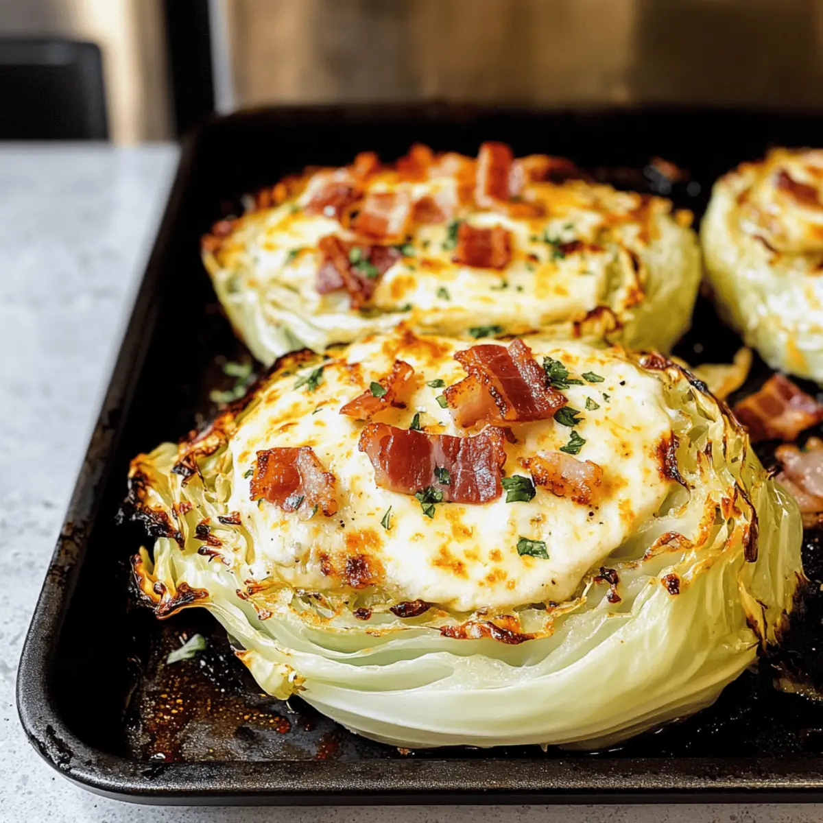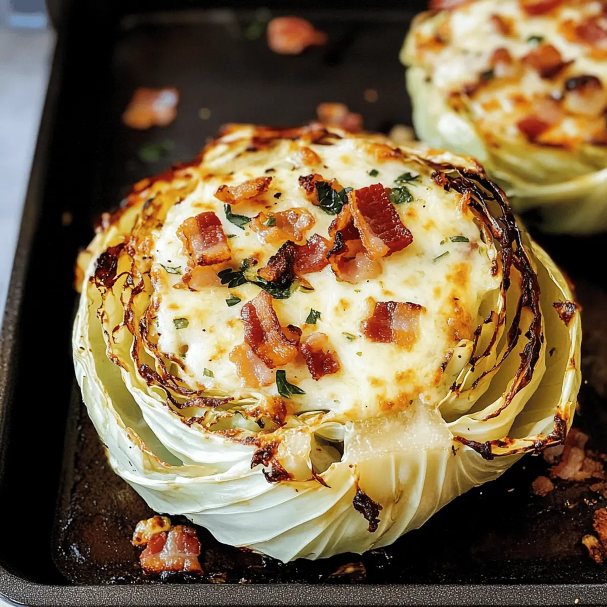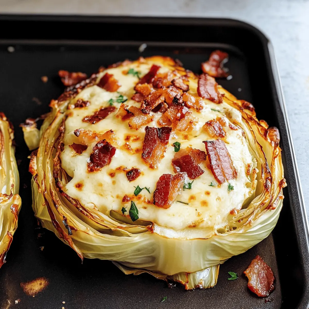 In der Wärme meiner Küche, wo der Duft von köstlich geröstetem Gemüse die Luft erfüllt, bereitete ich neulich ein Gericht zu, das mich gleichzeitig überrascht und begeistert hat – Kohlschnitzel in Form von knusprigen Röstkohle-Schnitzeln mit Käse und Speck. Diese Rezeptur ist nicht nur in nur 30 Minuten zubereitet, sondern bietet auch eine köstliche Halblebensmittel-Lösung für all jene, die sich nach einer leichten, aber zufriedenstellenden Mahlzeit sehnen. Die nussige, leicht süßliche Note des Kohls harmoniert perfekt mit dem gesalzenen Crunch von knusprigem Speck und geschmolzenem Käse. Egal, ob als Hauptgericht oder vielseitige Beilage – diese Röstkohle-Schnitzel passen sich problemlos verschiedenen Geschmäckern und Vorlieben an. Neugierig, wie einfach es ist, dieses innovative Rezept in eurem eigenen Zuhause nachzukochen? Warum wirst du Kohlschnitzel lieben? Einfachheit, die begeistert: Mit nur wenigen Zutaten zubereitet, wird dieses Rezept schnell zum Liebling in deiner Küche. Vielseitigkeit, die inspiriert: Ob mit Speck, vegetarisch oder scharf – jeder kann seine persönliche Note hinzufügen. Schnelle Zubereitung in nur 30 Minuten macht es perfect für das Abendessen unter der Woche. Harmonie der Aromen: Die Kombination aus nussigen, herzhaften und cremigen Elementen sorgt für ein Geschmackserlebnis, das nicht nur dich, sondern auch deine Gäste begeistern wird. Wenn du nach weiteren kreativen Ideen suchst, schau dir unsere Karamellisierten Rosenkohlsteaks Mit und Variationen an! Kohlschnitzel Zutaten • Verwandle deine Küche in ein Genussparadies mit diesen köstlichen Kohlschnitzel-Zutaten! Für die Röstkohle-Schnitzel Kohl – der Hauptdarsteller, verwende einen kleinen Kopf Weißkohl oder probiere Rotkohl für mehr Farbe. Natives Olivenöl Extra – sorgt für gleichmäßiges Rösten und verstärkt den köstlichen Geschmack. Achte darauf, die richtige Menge zu verwenden, um ein Durchweichen zu vermeiden. Knoblauch – bringt eine tiefere, herzhafte Note ins Spiel. Frisch gehackter Knoblauch ist am besten! Meersalz – hebt die Aromen an. Kann durch Himalaya-Salz ersetzt werden oder für eine kaliumreduzierte Option weggelassen werden. Schwarzer Pfeffer – fügt Würze hinzu; nach Geschmack anpassen. Für den Belag Speck – verleiht Knusprigkeit und Tiefe; ersetzbar durch vegetarischen Speck wie Tempeh-Bacon für eine pflanzliche Variante. Geriebener Käse – schmilzt köstlich über den Schnitzeln; tausche ihn gegen Parmesan, Cheddar oder eine vegane Käsealternative aus. Frische Petersilie – für die Garnitur und einen frischen Kick. Entdecke die Freude am Kochen mit diesen Zutaten für dein Kohlschnitzel! Schritt-für-Schritt-Anleitung für Kohlschnitzel mit Käse und Speck Schritt 1: Ofen vorheizen Heize deinen Ofen auf 200°C vor, um ein optimales Röstergebnis für die Kohlschnitzel zu erzielen. Während der Ofen warm wird, schäle und schneide den Kohl in dicke Scheiben von etwa 2 bis 2,5 cm, damit sie schön gleichmäßig rösten. Lege die geschnittenen Kohlsteaks auf ein Backblech und bereite dich auf das Würzen vor. Schritt 2: Kohl vorbereiten Bestrich beide Seiten der Kohlsteaks großzügig mit nativen Olivenöl, um ein Ankleben und gleichmäßiges Rösten sicherzustellen. Streue dann frisch gehackten Knoblauch gleichmäßig über die Kohlsteaks und würze diese mit Meersalz und schwarzem Pfeffer. Dadurch wird das Aroma intensiviert und die Röstung erhält eine saftige Note. Schritt 3: Rösten im Ofen Schiebe das Backblech mit den Kohlschnitzeln in den vorgeheizten Ofen und lasse sie für etwa 20 Minuten rösten. Achte darauf, dass die Ränder goldbraun sind und der Kohl weich ist, was dir anzeigt, dass sie perfekt gegart sind. Diese Röstzeit sorgt dafür, dass die Schnitzel eine wunderbare Textur entwickeln. Schritt 4: Speck knusprig braten Während die Kohlschnitzel im Ofen rösten, erhitze eine Pfanne bei mittlerer Hitze und brate den Speck, bis er schön knusprig ist. Dies dauert ungefähr 5 bis 7 Minuten. Rühre gelegentlich um, um ein gleichmäßiges Braten zu gewährleisten. Nach dem Braten den Speck auf ein Küchentuch legen, um das überschüssige Fett aufzusaugen. Schritt 5: Käse hinzufügen Nehme die Röstkohle aus dem Ofen und bestreue sie großzügig mit dem geriebenen Käse. Setze das Backblech nochmals für etwa 5 Minuten zurück in den Ofen, damit der Käse schmelzen kann und eine verführerische Kruste bildet. Beobachte den Schmelzprozess, denn der Käse sollte goldbraun und schön schmelzend sein. Schritt 6: Anrichten und servieren Entnehme die Kohlschnitzel aus dem Ofen und bestreue sie sofort mit dem knusprigen Speck und frisch gehackter Petersilie für einen schönen Farbkontrast. Serviere die Kohlschnitzel warm als Hauptgericht oder köstliche Beilage. Der Kontrast aus knusprigen und cremigen Texturen macht jeden Bissen zu einem Erlebnis! Vorbereiten der Kohlschnitzel für stressfreies Kochen Die Kohlschnitzel sind ideal für alle, die Zeit sparen wollen! Du kannst die Kohlscheiben bis zu 24 Stunden im Voraus schneiden und in einem luftdichten Behälter im Kühlschrank aufbewahren. Achte darauf, dass die Kohlsteaks leicht mit Olivenöl bestrichen sind, um ein Austrocknen zu verhindern. Ebenso kannst du den Speck braten und im Kühlschrank lagern, bis du bereit bist, das Gericht zuzubereiten (hält sich dort bis zu 3 Tagen). Wenn du bereit bist, die Kohlschnitzel zu servieren, heize den Ofen auf 200°C vor, röste die vorbereiteteten Kohlsteaks für 20 Minuten und füge dann den Käse hinzu, bevor du sie für weitere 5 Minuten in den Ofen gibst. Diese einfachen Vorbereitungen sorgen dafür, dass deine Kohlschnitzel genau so köstlich wie frisch zubereitet schmecken und dir viel Zeit in der Küche sparen! Aufbewahrungstipps für Kohlschnitzel Kühlschrank: Bewahre die restlichen Kohlschnitzel in einem luftdichten Behälter auf, damit sie bis zu 4 Tage frisch bleiben. So bleiben der Geschmack und die Textur erha