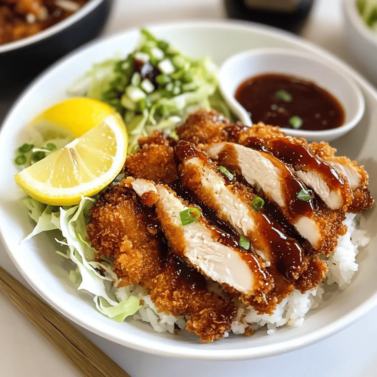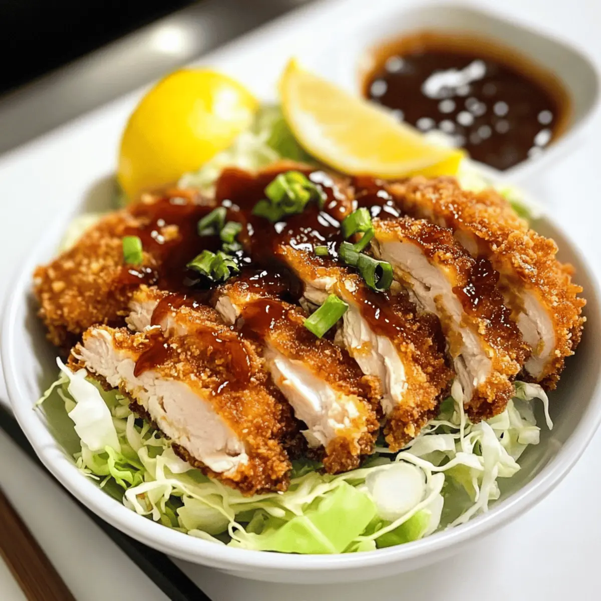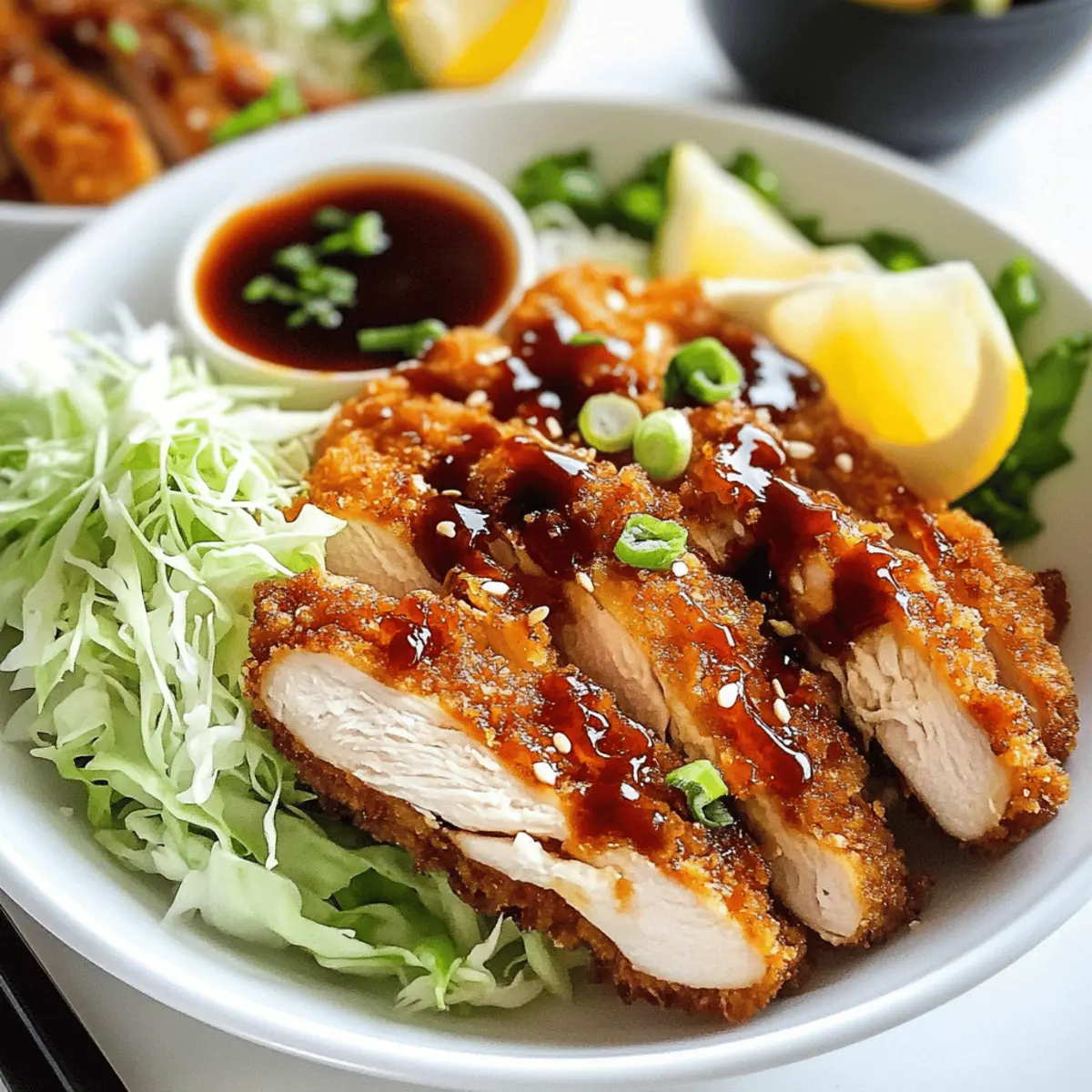 Beim ersten Bissen von meinem knusprigen Hähnchen Katsu ist es, als würde ein kleiner Feuerwerk an Aromen in meinem Mund explodieren. Die goldenen Panko-Brösel sind nicht nur ein Blickfang, sondern sorgen auch für eine perfekte Textur, die das Gericht unvergesslich macht. Dieses Rezept für krosse Hähnchen Katsu ist in weniger als 30 Minuten zubereitet – ideal, wenn die Familie nach einer schnellen und dennoch köstlichen Mahlzeit verlangt. Ob in einem Sandwich oder klassisch über Reis mit Gemüse und BBQ-Sauce serviert, dieses Gericht ist eine beruhigende Umarmung für die Seele und kommt mit einfach erhältlichen Zutaten aus. Ich kann es kaum erwarten, euch zu zeigen, wie ihr dieses leckere Gericht zubereitet. Habt ihr euch schon mal gefragt, wie schön der Duft von frisch frittiertem Hähnchen ist? Wie entsteht die perfekte Knusprigkeit? Krosse Textur: Mit Panko-Bröseln kreiert ihr eine unvergleichliche Knusprigkeit, die kleine Stückchen Freude in jeden Bissen bringt. Schnelle Zubereitung: In nur 30 Minuten steht dieses herrliche Gericht auf dem Tisch – ideal für geschäftige Abende. Vielseitig Einsetzbar: Ob als Sandwich-Hero oder klassisch über Reis, das Katsu passt immer! Familienfreundlich: Diese Portion Liebe erfreut Groß und Klein gleichermaßen. Und für weitere köstliche Ideen, schaut euch auch unsere zart geschmortes Rezept oder die Mediterrane Hähnchen Genuss an! Krosse Hähnchen Katsu Zutaten Für das Hähnchen Hähnchenschenkel – Saftiges Fleisch, das gleichmäßig gart. Hähnchenbrust kann substituiert werden, jedoch bitte auf eine gleichmäßige Dicke achten. Weißmehl – Sorgt für eine trockene Beschichtung auf dem Hähnchen. Glutenfreies Mehl kann als Alternative verwendet werden. Salz und schwarzer Pfeffer – Unverzichtbare Gewürze für die richtige Würze. Mengen je nach persönlichem Geschmack anpassen. Knoblauchpulver – Fügt eine aromatische Tiefe hinzu. Optional kann frischer Knoblauch verwendet werden. Eier – Binden die Panade an das Hähnchen. Je ein Ei pro Hähnchenschenkel verwenden. Ei-Alternativen können die Textur verändern. Milch – Verleiht der Eiermischung Cremigkeit. Pflanzliche Milch ist ein guter Ersatz. Panko-Brösel – Der Schlüssel für die perfekte Knusprigkeit. Verwenden Sie ungewürzte Panko-Brösel für eine bessere Geschmackskontrolle. Öl (zum Frittieren) – Notwendig für das Garen des Hähnchens. Pflanzen- oder Rapsöl ist ideal; vermeiden Sie Olivenöl für hohe Temperaturen. Schritt-für-Schritt-Anleitung für Krosse Hähnchen Katsu Step 1: Hähnchen vorbereiten Trocknen Sie die Hähnchenschenkel gründlich mit einem Küchentuch ab, um überschüssige Feuchtigkeit zu entfernen. Diese Maßnahme sorgt dafür, dass die Panade am Hähnchen haftet und eine perfekte Knusprigkeit entsteht. Step 2: Trockene Panade erstellen Mischen Sie in einer separaten Schüssel das Weißmehl mit Salz, schwarzem Pfeffer und Knoblauchpulver. Diese Mischung sorgt für einen schmackhaften Untergrund für die Hähnchenstücke. Wenden Sie die Hähnchenschenkel in der Mehlmischung und klopfen Sie überschüssiges Mehl ab. Step 3: Eier und Milch vermixen In einer Schüssel die Eier mit der Milch verquirlen und mit Salz, schwarzem Pfeffer sowie Knoblauchpulver abschmecken. Diese Mischung bindet die Panade an das Hähnchen und sorgt für Geschmack. Step 4: Hähnchen in Ei-Mischung tauchen Tauchen Sie nun die bemehlten Hähnchenschenkel in die Eiermischung, sodass sie gleichmäßig überzogen werden. Lassen Sie die überschüssige Mischung abtropfen, um ein Überlaufen im nächsten Schritt zu vermeiden. Step 5: Panko-Brösel auftragen Wenden Sie die Hähnchenschenkel in den Panko-Bröseln, dabei leicht andrücken, damit die Brösel gut haften. Diese Schicht sorgt für die charakteristische Knusprigkeit, die Krosse Hähnchen Katsu auszeichnet. Step 6: Panierter Hähnchen ruhen lassen Lassen Sie das panierte Hähnchen etwa 10 Minuten ruhen. Diese Ruhezeit ermöglicht es der Panade, fest zu werden, und sorgt für eine gleichmäßige Bräunung beim Frittieren. Step 7: Öl erhitzen Erhitzen Sie das Öl in einer Pfanne auf etwa 180 °C (350 °F). Nutzen Sie ein Thermometer, um die Temperatur sicherzustellen, da die richtige Hitze entscheidend für die optimale Frittierung ist. Step 8: Hähnchen frittieren Frittieren Sie die Hähnchenschenkel portionsweise, um ein Überfüllen der Pfanne zu vermeiden. Braten Sie sie, bis sie auf beiden Seiten goldbraun sind und das Fleisch durchgegart ist, was etwa 5-7 Minuten dauert. Step 9: Hähnchen abtropfen lassen Übertragen Sie das frittierte Hähnchen auf ein Kuchengitter, damit das überschüssige Öl abtropfen kann. Diese Maßnahme hilft, das Hähnchen knusprig zu halten. Lassen Sie es einige Minuten abkühlen, bevor Sie es servieren. Expertentipps für Krosse Hähnchen Katsu Temperatur überprüfen: Achte darauf, dass das Öl die richtige Temperatur von 180 °C erreicht, um perfekten Krossheit beim Frittieren zu gewährleisten. Ein Thermometer ist hier sehr hilfreich. Panade richtig anwenden: Lass die panierten Stücke nach dem Beschichten mit Panko-Bröseln ruhen, damit die Brösel besser haften und die Krosse Hähnchen Katsu den gewünschten Crunch haben. Frittierverfahren beachten: Frittiere die Hähnchenschenkel in kleinen Portionen, um Überfüllung zu vermeiden und eine gleichmäßige Bräunung zu erreichen. So bleibt das Hähnchen schön knusprig. Abtropfen lassen: Verwende ein Kuchengitter, um das frittierte Hähnchen abtropfen zu lassen. Dadurch bleibt die Außenhaut knusprig, da überschüssiges Öl entfernt wird. Garen im Auge behalten: Vermeide es, das Hähnchen zu lange zu frittieren, da es sonst trocken werden kann. Achte darauf, es goldbraun und nur bis zur richtigen Kerntemperatur zu garen. Vorbereitung für krosse Hähnchen Katsu Krosse Hähnchen Katsu eignet sich hervorragend für die Vorbereitung im Voraus, was Zeit spart und Stress an geschäftigen Abenden verringert. Ihr könnt d
