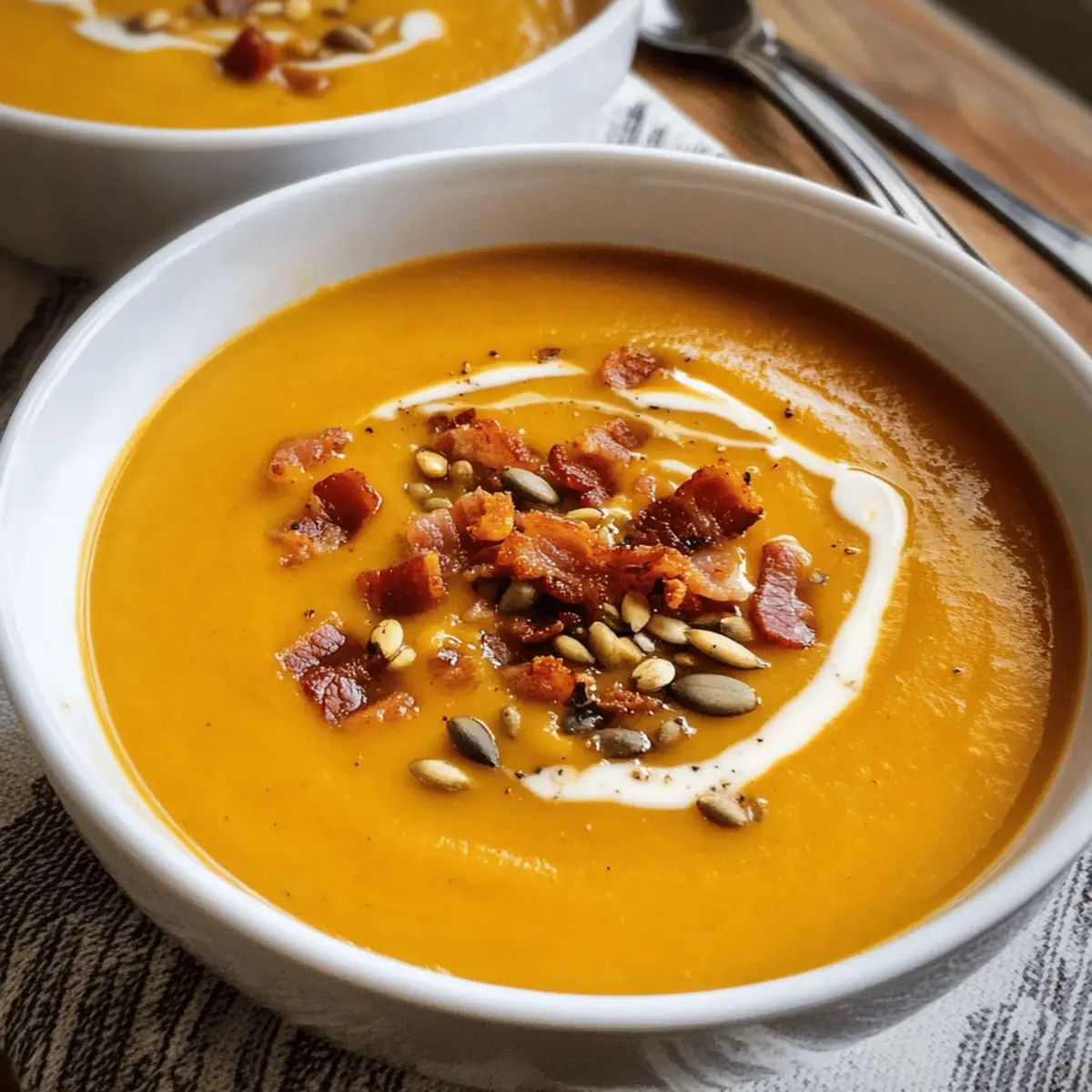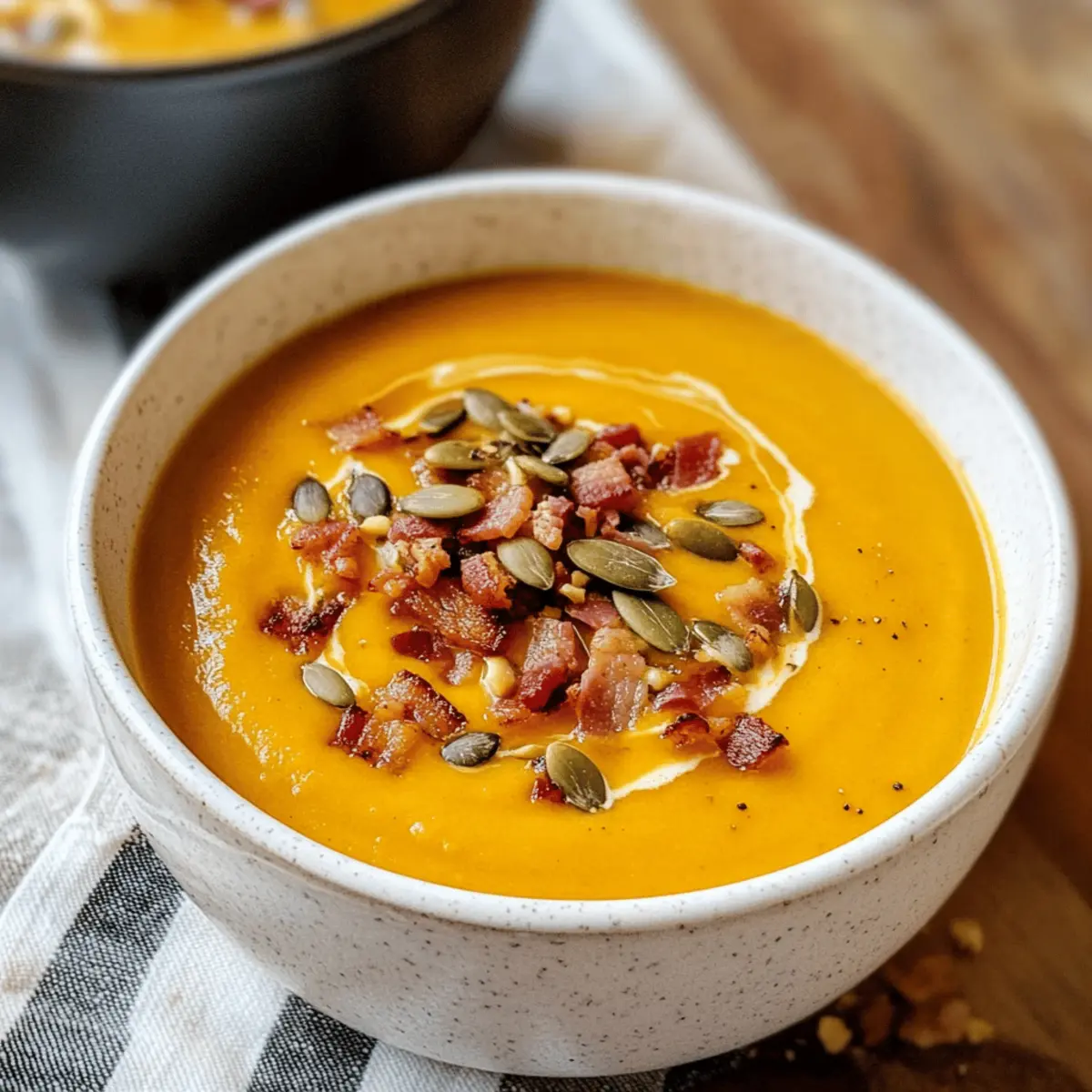 Ein belebender Duft zieht durch die Küche, während die frischen Kürbisse im Ofen brutzeln und sich langsam in goldene Köstlichkeit verwandeln. Mit dieser Kürbissuppe wird der Zauber des Herbstes lebendig, wo das Zusammenspiel von herzhaftem Bacon und einer cremigen Textur jeden Löffel zu einem Fest für die Sinne macht. Diese Rezeptur für die cremige Kürbissuppe ist nicht nur einfach zuzubereiten, sondern auch ein wahrer Seelenstreichler an kalten Tagen. Ob beim entspannenden Abendessen mit Freunden oder als herzhaftes Mittagessen, diese Suppe begeistert und heizt auf. Und das beste daran? Sie ist glutenfrei und lässt sich hervorragend einfrieren – für den Fall, dass du einmal einen Schluck Herbst-Wunder in deinem Gefrierfach haben möchtest. Bist du bereit, in die Welt der köstlichen Herbstgerichte einzutauchen? Warum wirst du diese Kürbissuppe lieben? Einfachheit: Die Zubereitung dieses Rezepts ist kinderleicht und erfordert keine speziellen Kochkünste – perfekt für Hobbyköche und Profis gleichermaßen. Herzhafter Genuss: Mit der Kombination aus knusprigem Speck und aromatischen Gewürzen wird jeder Löffel zu einem wahren Geschmackserlebnis. Vielseitigkeit: Diese Kürbissuppe lässt sich nach Belieben anpassen – probiere zum Beispiel eine vegetarische Variante mit geräuchertem Paprika! Wohlfühl-Faktor: Sie ist der ideale Seelenwärmer an kalten Tagen und sorgt für Gemütlichkeit am Esstisch. Lagerfreundlich: Du kannst die Suppe problemlos einfrieren und für später aufbewahren. So hast du immer ein Stück Herbst in deinem Gefrierfach – ideal, wenn du einen schnellen, köstlichen Snack benötigst! Kürbissuppe Zutaten • Entdecke die köstlichen Zutaten für deine cremige Kürbissuppe! Für die Suppe: Kleiner Biskuit-Kürbis (2 lbs): Der Hauptbestandteil, der natürliche Süße und Textur liefert – verwende Zucker-Kürbisse für das beste Ergebnis. Olivenöl: Ideal zum Rösten der Kürbisse und zum Anbraten der Zutaten. Bacon (6 oz, gehackt): Verleiht der Suppe herzhaften Geschmack und Reichhaltigkeit; kann durch eine vegetarische Option ersetzt werden. Große gelbe Zwiebel (1, gehackt): Bringt Süße und Tiefe in den Geschmack. Knoblauchzehen (3, gehackt): Verstärkt den Geschmack der Suppe mit aromatischen Noten. Feines Meersalz (1 ½ TL, plus mehr nach Geschmack): Essenziell für die Würze. Frisch gemahlener schwarzer Pfeffer (½ TL, plus mehr nach Geschmack): Fügt Wärme und Komplexität hinzu. Gemahlener Zimt (½ TL): Trägt zum herbstlichen Gewürzprofil bei. Gemahlene Muskatnuss (½ TL): Bringt einen warmen, erdigen Geschmack. Gemahlener Piment (¼ TL): Vertieft den Geschmack mit einem Hauch von Süße. Gemüsebrühe oder Hühnerbrühe (4 Tassen): Flüssige Basis, die den Geschmack verstärkt – verwende natriumarme Optionen zur Kontrolle des Salzgehalts. Kokosmilch (½ Tasse, ungesüßt) oder Schlagsahne: Sorgt für eine cremige Textur; Kokosmilch bringt eine subtile Süße. Echter Ahornsirup (2-3 EL): Fügt Süße und reichen Geschmack hinzu; nach Geschmack anpassen. Pepitas (1/3 Tasse): Geröstete Kürbiskerne als Garnitur, die für Crunch und Nussigkeit sorgen. Schritt-für-Schritt-Anleitung für Kürbissuppe mit knusprigem Speck und Ahornsirup Step 1: Kürbisse vorbereiten Heize den Ofen auf 220 °C vor. Halbiere die kleinen Biskuit-Kürbisse, entferne die Kerne und lege sie mit der Schnittfläche nach unten auf ein Backblech. Röste die Kürbisstücke für 35-40 Minuten, bis sie weich sind und eine goldene Farbe annehmen. Diese Röstung intensiviert den natürlichen Geschmack der Kürbisse für deine köstliche Kürbissuppe. Step 2: Bacon anbraten In einem großen Schmortopf oder Dutch Oven bei mittlerer Hitze das Olivenöl erhitzen. Füge den gehackten Bacon hinzu und brate ihn an, bis er knusprig ist und das Fett ausgegeben wurde, etwa 5-7 Minuten. Lass etwas vom Baconfett im Topf, um der Kürbissuppe zusätzlichen Geschmack zu verleihen. Hebe den gebratenen Bacon als Garnitur beiseite. Step 3: Aromastoffe anbraten Nun die gehackte Zwiebel in den Schmortopf geben und sie 6-7 Minuten lang anbraten, bis sie weich und transparent ist. Rühre den gehackten Knoblauch, das Meersalz, den schwarzen Pfeffer sowie die Gewürze wie Zimt, Muskatnuss und Piment hinzu. Dünste dies für 30-60 Sekunden, bis die Aromen intensiv werden und einen köstlichen Duft verbreiten. Step 4: Kürbis und Brühe kombinieren Sobald die Kürbisse weich sind, kratze das Fruchtfleisch vorsichtig aus der Schale und gib es in den Topf. Füge die Gemüsebrühe oder Hühnerbrühe hinzu und bringe alles zum Kochen. Reduziere die Hitze und lasse die Mischung 15 Minuten lang köcheln. Dies ermöglicht den Aromen, sich perfekt miteinander zu verbinden, für eine köstliche Kürbissuppe. Step 5: Pürieren Verwende einen Stabmixer, um die Suppe direkt im Topf glatt zu pürieren. Alternativ kannst du die Mischung portionsweise in einen Standmixer geben. Mische, bis die Suppe eine cremige und samtige Konsistenz erreicht. Diese Schritt sorgt dafür, dass deine Kürbissuppe einladend und glatt wird – ideal für kalte Tage. Step 6: Suppe verfeinern Rühre nun die Kokosmilch oder die Schlagsahne sowie den echten Ahornsirup unter die pürierte Suppe. Schmecke die Kürbissuppe ab und passe nach Bedarf die Würze an. Erwärme die Suppe bei niedriger Hitze, bis sie durchgehend heiß ist. Zum Servieren dekorierst du die Kürbissuppe mit dem knusprigen Bacon und den gerösteten Pepitas für zusätzlichen Crunch. Kürbissuppe im Voraus zubereiten Du suchst nach einer Möglichkeit, die köstliche Kürbissuppe mit knusprigem Speck und Ahornsirup effizient vorzubereiten? Glücklicherweise kannst du die Kürbisse bis zu 24 Stunden im Voraus rösten! Einfach die Kürbisse zubereiten (Halbieren, Kerne entfernen und 35-40 Minuten bei 220 °C rösten) und das Fruchtfleisch im Kühlschrank aufbewahren. Auch der Bacon lässt sich hervorragend vorbereitet werden; koche ihn einfach und bewahre ihn in ei