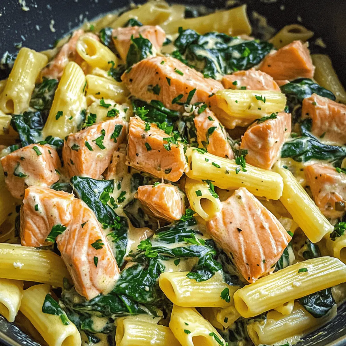 Dieses Rezept für Lachs Pasta mit Spinat vereint frischen Lachs mit Spinat und einer cremigen Sauce in nur 30 Minuten.