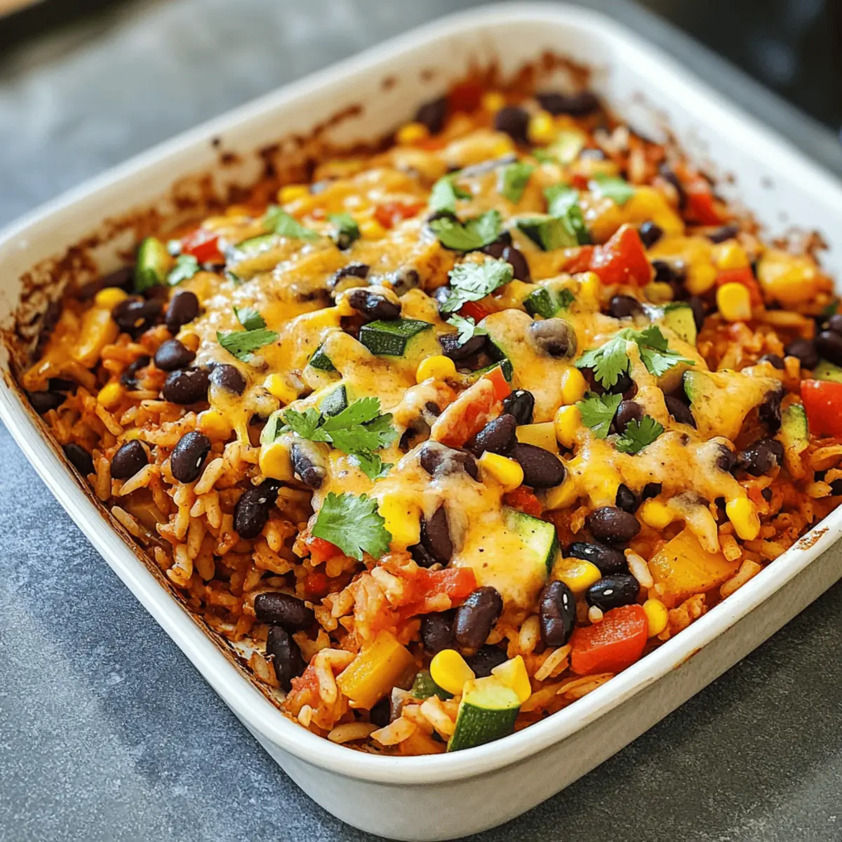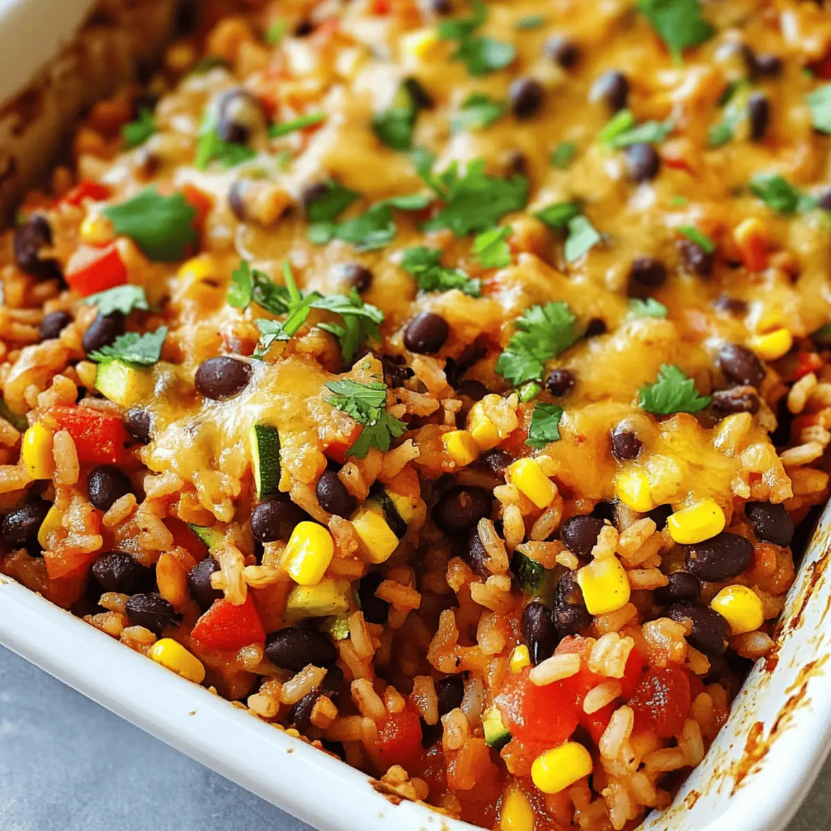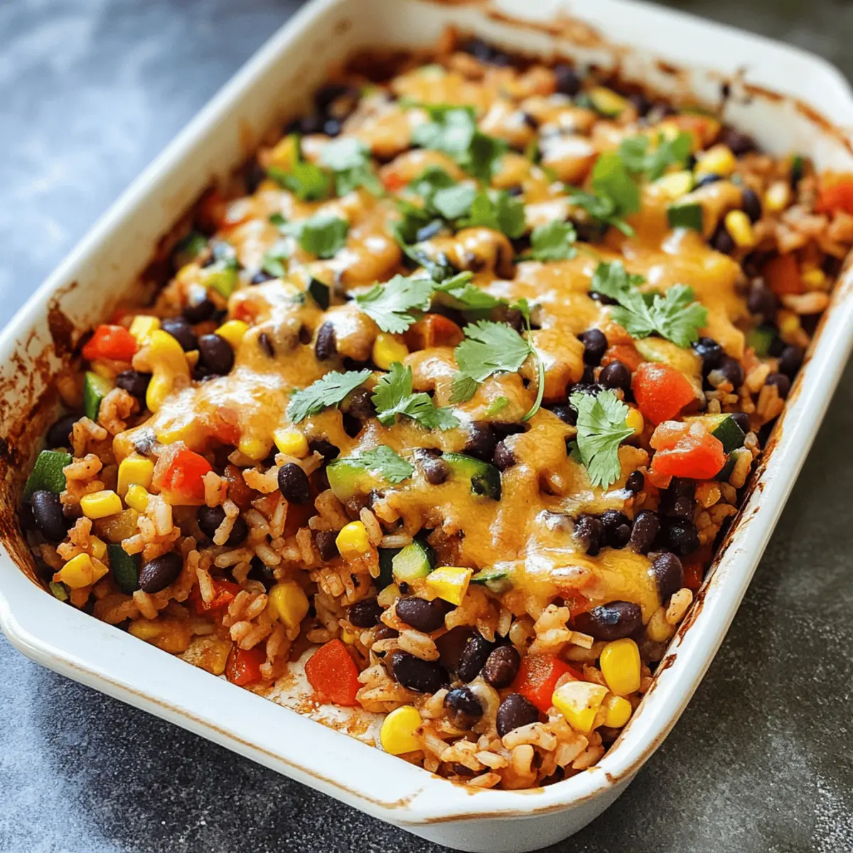 Die ersten Aromen, die mir in den Sinn kommen, sind die lebendigen Gewürze und die warme, einladende Atmosphäre einer mexikanischen Fiesta. In diesem Beitrag möchte ich mit euch mein Rezept für Mexikanischer Reis aus dem Ofen teilen – ein Gericht, das alle Sinne anspricht und den Charme der mexikanischen Küche in euer Zuhause bringt. Diese einfache, vegane und glutenfreie Variante ist nicht nur ein echter Hingucker auf dem Tisch, sondern auch eine großartige Option für Meal Prep: wenig Aufwand bei maximalem Geschmack! Ob als Hauptgericht oder köstliche Beilage, dieser Reis ist ein Familienhit, der die Herzen erwärmt. Seid ihr bereit, mit mir auf eine geschmackvolle Reise zu gehen? Warum wirst du dieses Rezept lieben? Einfachheit: Die Zubereitung ist kinderleicht und erfordert nur grundlegende Kochfähigkeiten! Vielseitigkeit: Ob als Hauptgericht oder Beilage, dieser Mexikanische Reis aus dem Ofen passt wunderbar zu jeder Mahlzeit und ist perfekt für Meal Prep geeignet. Würzige Aromen: Die Kombination aus Gewürzen, Gemüse und cremiger Kokosnussmilch sorgt für ein unvergessliches Geschmackserlebnis! Gesund: Vegan und glutenfrei ist dieses Gericht nicht nur lecker, sondern auch nährstoffreich. Familienfreundlich: Kinder und Erwachsene lieben diesen bunten Reis, der in nur einem einzigen Auflauf zubereitet wird. Wenn du nach weiteren kreativen Rezepten suchst, die unkompliziert sind und die ganze Familie begeistern, schau dir auch meinen Beitrag über schnelle vegane Abendessen an! Mexikanischer Reis aus dem Ofen Zutaten • Dieser einfache und doch köstliche mexikanische Reis aus dem Ofen sorgt für Geschmack und Freude in deiner Küche! Für den Auflauf Weißer Reis – Die perfekte Grundlage für unser Gericht; brauner Reis kann verwendet werden, jedoch verlängert sich die Kochzeit. Schwarze Bohnen – Fügen Protein und Ballaststoffe hinzu; verwende abgetropfte und gespülte Bohnen aus der Dose. Mais – Für eine süße Note und Textur; kann durch andere Hülsenfrüchte oder Gemüse ersetzt werden. Zwiebel – Aromatische Basis für den Geschmack; alternativ eignen sich Schalotten oder Lauch. Knoblauch – Verstärkt das Aroma; frisch gehackt oder vorgehackte Varianten sind ebenfalls geeignet. Rote Paprika – Bringt Farbe und Knusprigkeit ins Gericht; gelbe oder grüne Paprika können genutzt werden. Zucchini – Fügt Feuchtigkeit und Nährstoffe hinzu; auch mit gelber Zucchini oder anderen Gemüsesorten austauschbar. Schwarze Oliven – Für eine salzige, pikante Geschmacksnote; für eine salzarme Variante einfach weglassen. Kokosmilch – Verleiht Cremigkeit und verstärkt den Geschmack; Gemüsebrühe sorgt für eine leichtere Version. Passata – Zorgt für Tomatengeschmack und Feuchtigkeit; auch gewürfelte Tomaten aus der Dose sind eine gute Wahl. Wasser – Sichert gleichmäßiges Garen des Reises; je nach Reissorte anpassen. Salz – Unverzichtbares Gewürz; den Geschmack je nach anderen Zutaten anpassen. Gemahlener Kreuzkümmel – Bringt Wärme und Erdtöne; optional, aber empfehlenswert für mehr Tiefe. Räucherpaprika – Für ein rauchiges Aroma; alternativ kann auch normale Paprika verwendet werden. Schwarzer Pfeffer – Nach Geschmack; frisch gemahlen wird empfohlen für den besten Geschmack. Vegane Käsesauce – Optionale Topping für zusätzliche Cremigkeit; kann fertig gekauft oder selbstgemacht werden. Koriander oder Petersilie – Zur Garnierung, bringt Frische; kann weggelassen werden, wenn nicht gewünscht. Schritt-für-Schritt-Anleitung für Mexikanischer Reis aus dem Ofen Step 1: Ofen vorheizen Heize den Ofen auf 200°C (400°F) vor. Dies ist wichtig, um sicherzustellen, dass der Mexikanische Reis aus dem Ofen gleichmäßig gebacken wird und die Aromen optimal zur Geltung kommen. Während der Ofen aufheizt, hast du genügend Zeit, um die vorbereitenden Schritte in Angriff zu nehmen. Step 2: Zutaten vorbereiten Spüle die schwarzen Bohnen und den Mais gründlich ab und lass sie abtropfen. Währenddessen schneide die Zwiebel, die rote Paprika und die Zucchini in kleine Stücke. Denke daran, alles gleichmäßig zu schneiden, damit es gleichmäßig gart. Das schafft eine schöne Textur und sorgt dafür, dass die Aromen gut miteinander harmonieren. Step 3: Mischung anrichten Nimm eine große Auflaufform und gib den weißen Reis, die abgetropften Bohnen, den Mais sowie das geschnittene Gemüse hinein. Füge die Kokosmilch, die Passata, das Wasser und die Gewürze hinzu. Mische alles gut durch, bis der Reis gleichmäßig mit der Flüssigkeit und den Gewürzen umhüllt ist. Achte darauf, dass keine trockenen Reiskörner sichtbar sind. Step 4: Abdecken und backen Decke die Auflaufform mit Aluminiumfolie ab, damit der Dampf im Inneren bleibt. Stelle die Form in den vorgeheizten Ofen und backe das Ganze für 40 Minuten. Während dieser Zeit solltest du überlegen, was du als Beilage dazu servieren möchtest, denn der köstliche Duft wird deine Gäste anlocken. Step 5: Fertigstellen Nachdem die 40 Minuten vorbei sind, entferne die Folie vorsichtig. Überprüfe, ob der Reis weich und die Flüssigkeit vollständig absorbiert ist. Wenn alles gut aussieht, kannst du nach Belieben vegane Käsesauce über den fertigen Auflauf träufeln. Lass das Gericht für ein paar Minuten ruhen, bevor du es servierst. Step 6: Garnieren Vor dem Servieren kannst du frischen Koriander oder Petersilie über den Mexikanischen Reis aus dem Ofen streuen. Dies verleiht dem Gericht nicht nur Farbe, sondern auch einen zusätzlichen Frischekick. Serviere es warm und genieße die bunten, geschmackvollen Aromen! Lagerungstipps für Mexikanischer Reis aus dem Ofen Raumtemperatur: Keine Lagerung bei Raumtemperatur empfehlen, um das Wachstum von Bakterien zu vermeiden. Kühlschrank: Bewahre den Mexikanischer Reis aus dem Ofen in einem luftdichten Behälter auf; so bleibt er bis zu 4–5 Tage frisch. Gefrierschrank: Für längere Lagerung kannst du den Reis portionsweise einfrieren; er häl