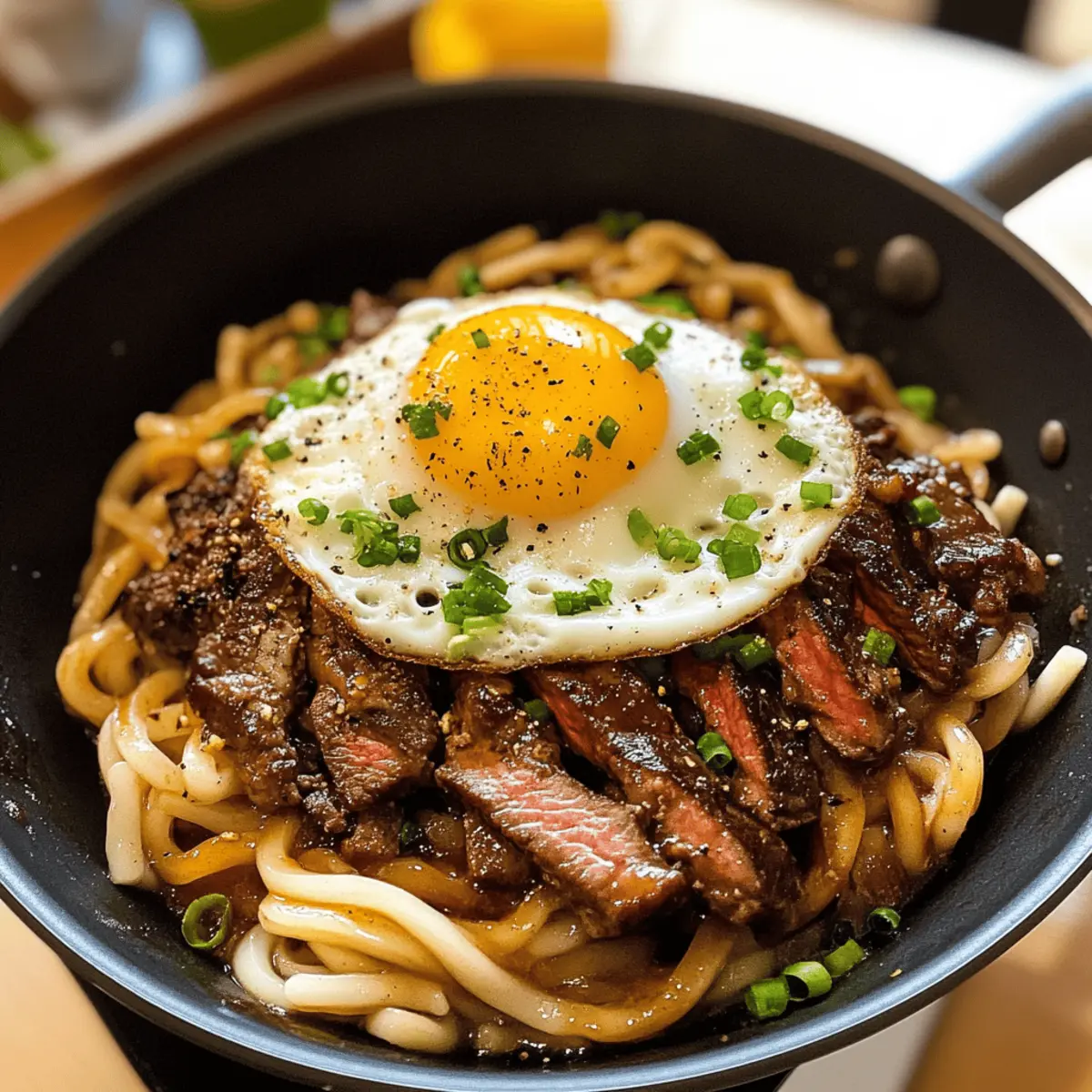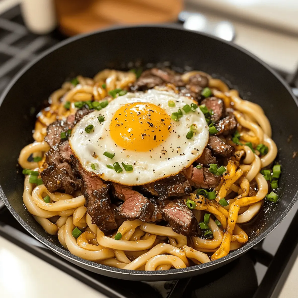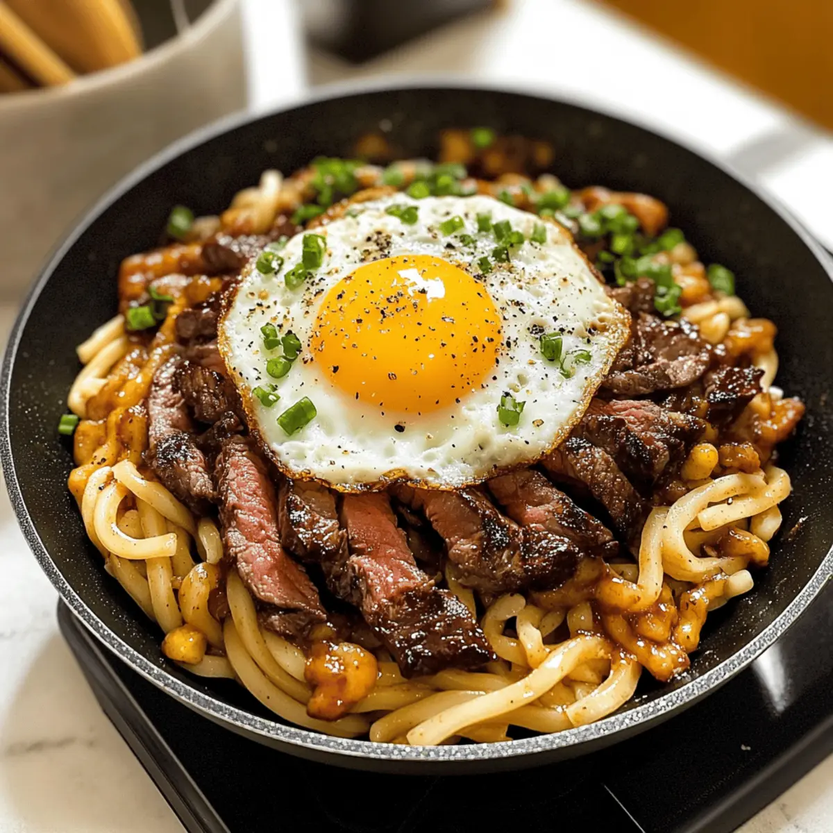 Als ich das köstliche Aroma von saftigem Steak und herzhaften Udon-Nudeln in der Luft wahrnahm, wusste ich sofort, dass es Zeit für ein neues Abenteuer in der Küche war. Diese One-Pan Udon-Nudeln mit einer würzigen Steak-Sauce sind nicht nur schnell zuzubereiten, sondern auch die perfekte Lösung für einen gemütlichen Abend zu Hause. Ein bisschen wie ein kulinarischer Kurzurlaub, bei dem sich alle Zutaten in einer Pfanne vereinen, um ein herzhaftes Gericht zu kreieren! Die Kombination aus zartem Fleisch und den dickeren Nudeln sorgt für eine befriedigende Textur, die sich wunderbar in der reichhaltigen Sauce entfaltet. Und das Beste daran? Ihr bekommt ein wahrhaft erfüllendes Comfort Food, das die ganze Familie lieben wird. Bereit, eure Geschmäcker auf eine neue Reise zu schicken? Warum solltest du Udon lieben? Einfache Zubereitung: Dieses Rezept erfordert nur eine Pfanne, was dir Zeit beim Abwasch spart! Herzhafter Geschmack: Die Kombination aus saftigem Steak und der würzigen Sauce verleiht jedem Bissen einen umami-geladenen Kick. Vielfältig: Variiere dieses Gericht mit Gemüse wie Brokkoli oder Zucchini oder ersetze das Steak durch Hühnchen oder Tofu. Crispy Genuss: Mit der knackigen Textur der Udon-Nudeln, die in der Pfanne schön goldbraun werden, wird jede Portion zum Erlebnis. Perfekt für jeden Anlass: Egal, ob für ein schnelles Abendessen unter der Woche oder ein entspanntes Dinner mit Freunden – dieses Gericht kommt immer gut an. Entdecke auch die köstlichen gefüllten Paprika mit Hackfleisch oder gönn dir einen Rhabarberkuchen mit Mascarpone als süßes Finale! Pepper Lunch mit Udon Zutaten Für die Udon-Nudeln • Udon-Nudeln – Sie bieten eine chewy Textur und nehmen die Sauce gut auf; vorgekochte Udon-Nudeln sparen Zeit. Für die Steak-Sauce • Steak (dünn geschnitten) – Die Hauptproteinquelle, die beim Braten karamellisiert und Geschmack aufnimmt; wähle Flanksteak oder Ribeye für die besten Ergebnisse. • Sojasauce – Sie verleiht der Sauce einen tiefen Umami-Geschmack. • Austernsoße – Verstärkt das herzhafte Aroma; kann durch zusätzliche Sojasauce ersetzt werden, wenn nicht verfügbar. • Knoblauch – Fügt der Sauce aromatische Tiefe hinzu. • Ingwer – Bringt eine wärmende und subtile Schärfe. • Brauner Zucker – Balanciert die Salzigkeit mit einer leichten Süße; Honig ist auch eine gute Alternative. • Sesamöl – Für einen nussigen Geschmack; kann durch anderes Öl (z. B. Rapsöl) ersetzt werden. • Reisessig – Führt eine spritzige Komponente ein; kann durch Apfelessig ersetzt werden. • Maisstärke und Wasser – Dickt die Sauce ein; vor dem Hinzufügen zur Pfanne gut vermischen. Für die Toppings • Ei (zum Garnieren) – Fügt Cremigkeit und Reichhaltigkeit hinzu; optional, aber sehr empfehlenswert. Verleiht eurem Abendessen mit diesen köstlichen Zutaten den Geschmack von Pepper Lunch mit Udon! Schritt-für-Schritt-Anleitung für Pepper Lunch mit Udon Step 1: Sauce vorbereiten In einer Schüssel die Sojasauce, Austernsoße, zerdrückten Knoblauch, geriebenen Ingwer, braunen Zucker, Sesamöl, Reisessig und das mit Wasser vermischte Maisstärke-Gemisch gut vermengen. Rühre die Mischung für etwa 1-2 Minuten, bis sich der Zucker aufgelöst hat und die Sauce eine gleichmäßige Konsistenz erreicht hat. Stelle die Schüssel zur Seite, während du die anderen Schritte vorbereitest. Step 2: Pfanne erhitzen Erhitze eine große, beschichtete Pfanne oder eine Gusseisenpfanne bei mittelhoher Hitze. Füge 1-2 Esslöffel Butter oder Öl hinzu, bis es schäumt und leicht durchsichtiger wird. Achte darauf, dass die Pfanne gut vorgeheizt ist, um das Steak optimal anzubraten und eine schöne Kruste zu erzeugen. Dies dauert etwa 2 Minuten. Step 3: Steak anbraten Lege die dünn geschnittenen Steakstücke vorsichtig um den Rand der heißen Pfanne und brate sie für etwa 2-3 Minuten an, bis sie eine goldbraune Kruste haben. Wende die Stücke gelegentlich, um eine gleichmäßige Karamellisierung zu erzielen. Das Steak sollte sich leicht vom Pfannenboden lösen lassen und aromatisch duften. Step 4: Udon hinzufügen Füge die vorgekochten Udon-Nudeln in die Mitte der Pfanne hinzu, sodass sie direkt auf die heiße Oberfläche treffen. Höre auf das Zischen, das beim Kontakt mit der Hitze entsteht. Lass die Nudeln für etwa 1-2 Minuten anbraten, damit sie ebenfalls eine goldbraune Farbe annehmen können. Step 5: Würzen und kochen Würze das Steak mit Salz, Pfeffer und einer Prise Chili-Pulver nach deinem Geschmack. Gieße dann die vorbereitete Sauce gleichmäßig über das Steak und die Nudeln. Rühre alles gut um, damit die Sauce die Nudeln und das Fleisch gleichmäßig umhüllt, und lasse es für etwa 3-4 Minuten kochen, bis alles gut durchgeheizt ist. Step 6: Knusprige Textur schaffen Halte die Nudeln während des Kochens einige Minuten ungerührt, um eine goldene, knusprige Schicht am Boden zu bilden. Nach 4-5 Minuten solltest du sehen, dass die Unterseite der Udon-Nudeln eine knackige Textur entwickelt hat. Achte darauf, die Temperatur nicht zu hoch zu wählen, damit nichts anbrennt. Step 7: Ei braten Falls du ein Ei als Topping verwenden möchtest, erhitze eine separate kleine Pfanne bei mittlerer Hitze. Füge etwas Öl hinzu und brate das Ei nach Wunsch (spiegelig oder durchgebraten) für etwa 2-3 Minuten. Achte darauf, das Eigelb nicht zu zerbrechen, wenn du es spiegelschräg brätst. Step 8: Servieren Gib die Pepper Lunch mit Udon auf Teller und toppe sie mit dem gebratenen Ei, süßen Mais und geschnittenen Frühlingszwiebeln. Du kannst auch Sriracha oder Kewpie-Mayo hinzufügen für extra Geschmack. Serviere das Gericht sofort, damit die knackigen Udon-Nudeln zur Geltung kommen und jeder Bissen frisch und köstlich bleibt. Lagerungstipps für Pepper Lunch mit Udon Zimmertemperatur: Bewahre Reste nicht länger als 2 Stunden bei Raumtemperatur auf, um die Sicherheit zu gewährleisten. Kühlschrank: Stelle sicher, dass die Rest