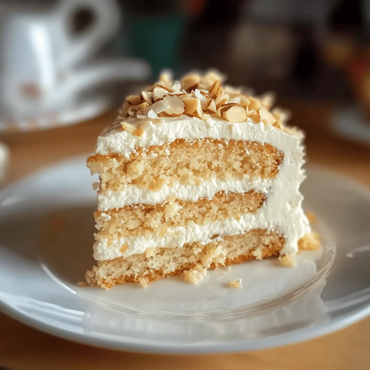 Dieser Raffaello-Kuchen mit Kokoscreme und Mandeln vereint zarte Süße und cremige Textur – ein perfektes Dessert für jede Feier.