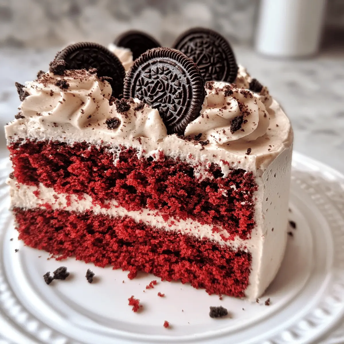 Entdecke den unwiderstehlichen Rotvelvet-Oreo-Kuchen, eine Kombination aus saftigem roten Teig und knusprigen Oreo-Stückchen.