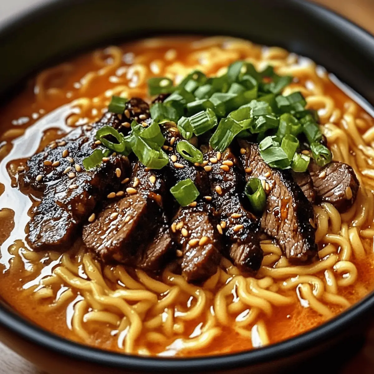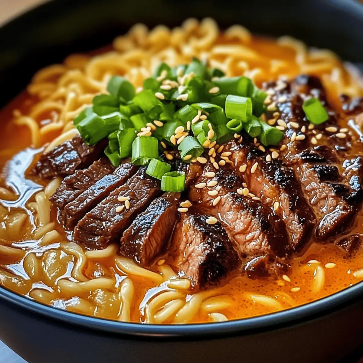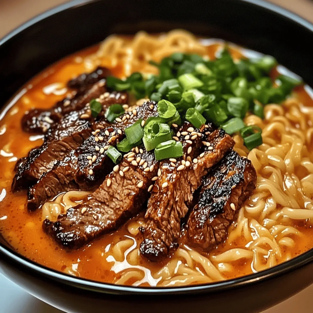 Scharfe koreanische Ramen mit gegrilltem Rindfleisch und cremiger Soße
