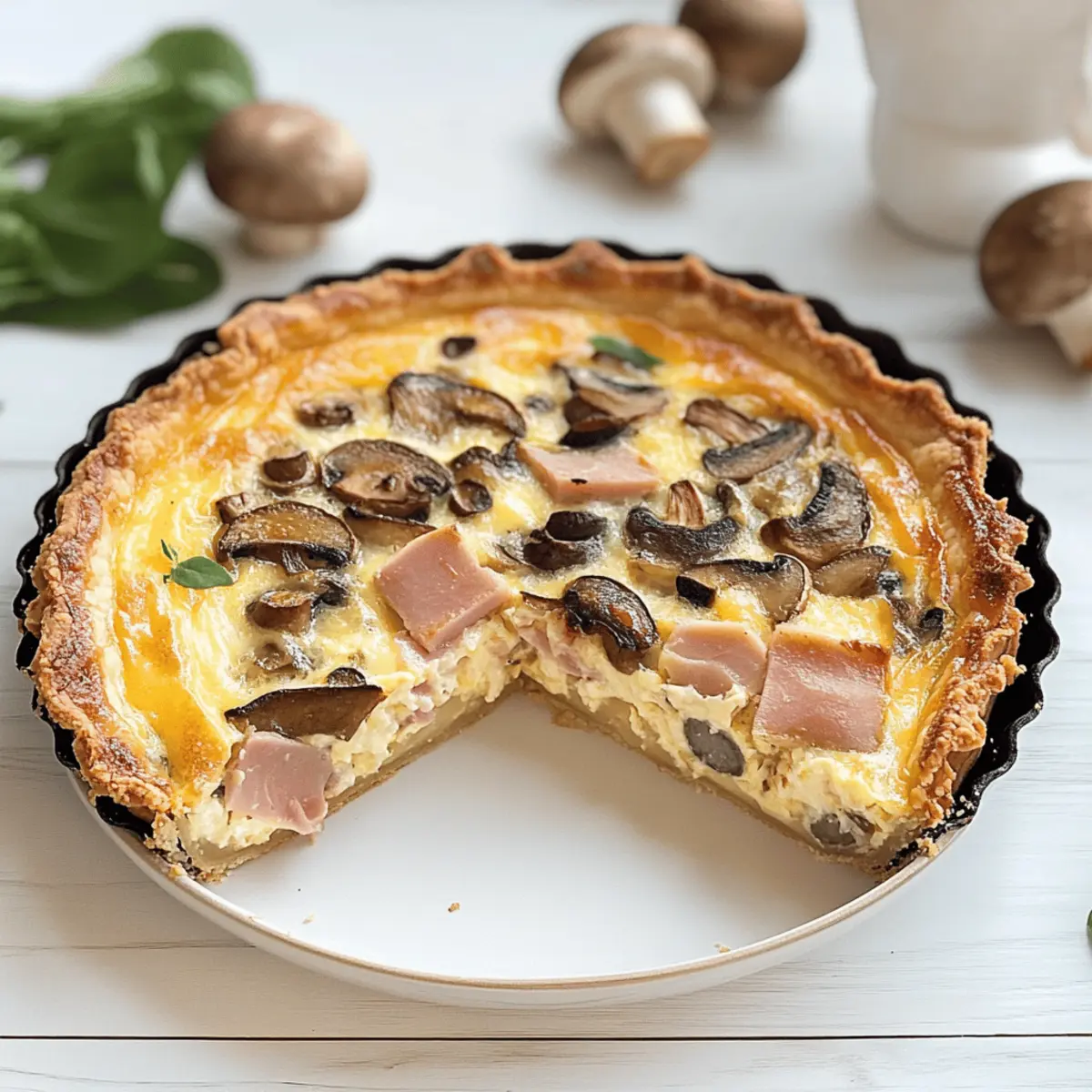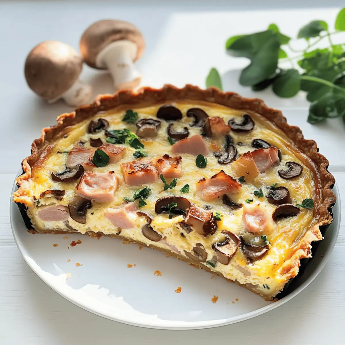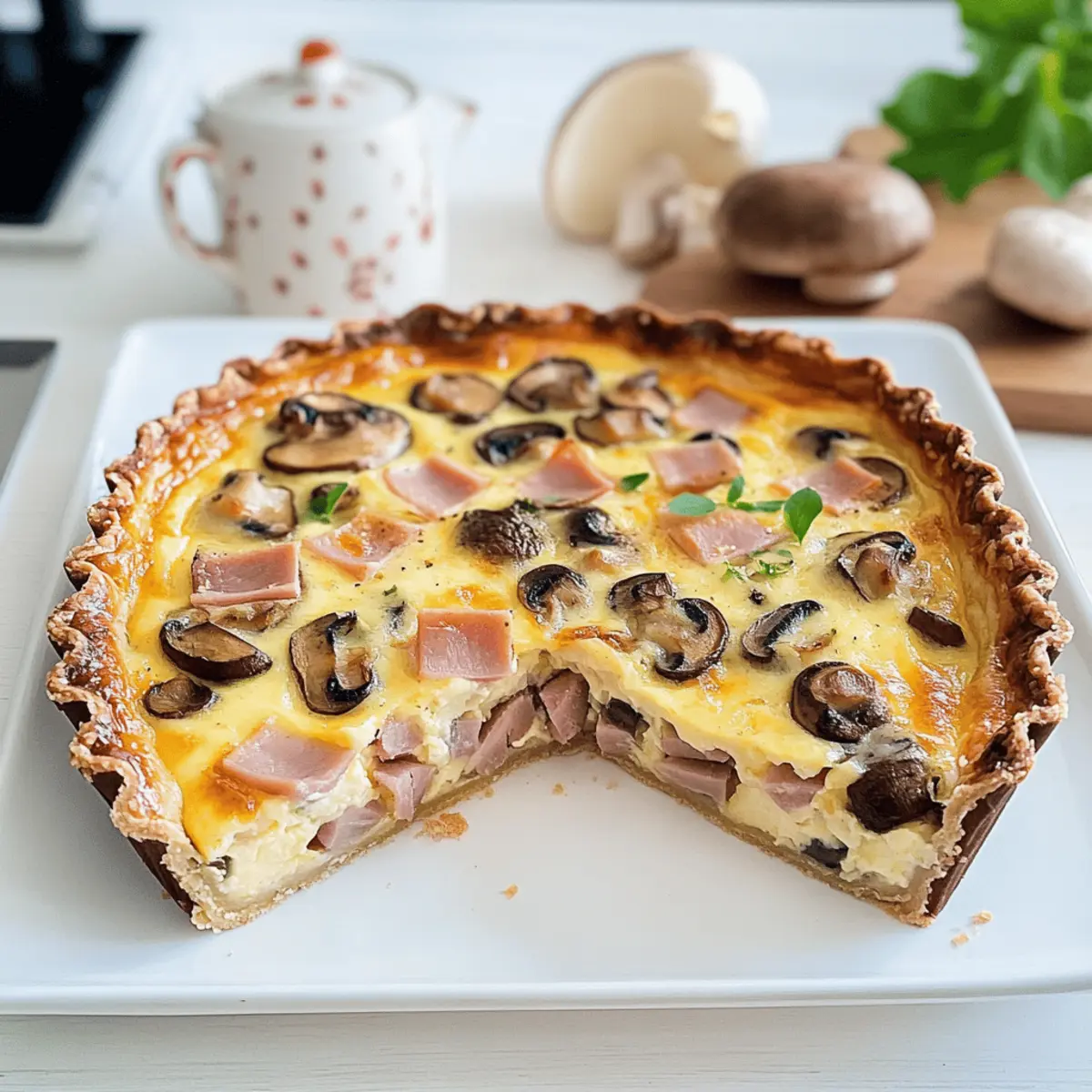 Als ich neulich in meiner Küche stand, kam mir der verführerische Duft von frisch gebackenem Gebäck in die Nase. Diese Schinken-Quiche mit Champignons und Mozzarella ist nicht nur ein Fest für die Sinne, sondern auch ein wahres Beispiel für köstliche Hausmannskost. Dieses Rezept glänzt durch seine Einfachheit und die Verwendung von Bio-Zutaten, die nicht nur gesund sind, sondern auch deinem Gaumen schmeicheln. Dank der schnellem Zubereitung ist sie perfekt für den Familienabend oder als herzhaftes Buffetgericht. Ob warm oder kalt serviert, diese Quiche wird garantiert zum gemeinsamen Höhepunkt deiner nächsten Mahlzeit. Bist du bereit, dich mit mir auf die Reise zu begeben und diese köstliche Köstlichkeit selbst zuzubereiten? Warum ist diese Quiche so besonders? Einfachheit: Die Zubereitung dieser Schinken-Quiche ist unkompliziert und erfordert nur grundlegende Kochkenntnisse. Vielseitigkeit: Ob beim Familienessen oder als Snack für unterwegs, diese Quiche passt immer. Sie kann warm oder kalt serviert werden! Gesunde Zutaten: Mit Bio-Zutaten sorgt dieses Rezept nicht nur für tollen Geschmack, sondern auch für ein gutes Gewissen. Sättigende Aromen: Die Kombination aus herzhaftem Schinken, erdigen Champignons und cremigem Mozzarella schafft ein Geschmackserlebnis, das begeistert. Zeitsparend: Die schnelle Zubereitung macht diese Quiche zum perfekten Gericht für hektische Tage. Zuschauerliebling: Bei jedem Anlass wird diese Quiche garantiert zum Hit auf dem Tisch und zieht alle in ihren Bann. Zögere nicht, dieses Rezept zum Star deiner nächsten Zusammenkunft zu machen! Schinken-Quiche mit Champignons und Mozzarella Zutaten Für den Teig Bio Weizenmehl – bildet die Grundlage für einen perfekten Quicheboden; kann durch Allzweckmehl ersetzt werden. Bio Speisequark – sorgt für Feuchtigkeit und Reichhaltigkeit im Teig; griechischer Joghurt ist eine gute Alternative. Bio Butter – garantiert einen flaky Teig; Margarine eignet sich für eine milchfreie Version. Bio Ei – bindet die Teigzutaten; ein Leinsamen-Ei ist eine vegane Option. Salz – hebt den Geschmack des Teiges hervor. Für die Füllung Bio Champignons – bringen erdigen Geschmack und Textur in die Füllung; jede frische Pilzart kann verwendet werden. Bio Kochschinken – sorgt für Eiweiß und herzhaften Geschmack; Nutze Puten-Schinken oder geräucherten Tofu für Variationen. Bio Schlagsahne – verleiht der Füllung eine cremige Textur; Kokoscreme ist eine herrliche milchfreie Alternative. Bio Mozzarella – hält die Quiche feucht und verleiht einen köstlichen Käsegeschmack; veganer Käse ist eine geeignete Option. Oregano – sorgt für ein aromatisches Profil; frischer Oregano bringt noch mehr Geschmack. Pfeffer – bietet wärmenden Kick zu den herzhaften Zutaten. Salz – verstärkt die Aromen der Füllung. Schritt-für-Schritt-Anleitung für Schinken-Quiche mit Champignons und Mozzarella Step 1: Teig zubereiten Beginne damit, das Bio Weizenmehl, den Bio Speisequark, die Bio Butter, ein Bio Ei und eine Prise Salz in eine Schüssel zu geben. Knete die Zutaten, bis ein glatter Teig entsteht. Wickele den Teig in Frischhaltefolie und stelle ihn für etwa 60 Minuten in den Kühlschrank, damit er fest wird und sich leichter ausrollen lässt. Step 2: Teig ausrollen Nach dem Kühlen nimm den Teig aus dem Kühlschrank und rolle ihn auf einer leicht bemehlten Fläche aus, bis er etwa 4 mm dick ist. Lege den ausgerollten Teig in eine gefettete Quicheform und drücke ihn gleichmäßig in die Ecken. Schneide den überschüssigen Teig ab und steche den Boden mehrmals mit einer Gabel ein. Step 3: Ofen vorheizen Heize deinen Backofen auf 180°C (350°F) vor, damit er gut aufgeheizt ist, wenn die Schinken-Quiche bereit ist, hineingeschoben zu werden. Das Vorheizen ist entscheidend für eine gleichmäßige Garung und ein perfektes Backergebnis. Step 4: Füllung vorbereiten Putze und schneide die Bio Champignons in Scheiben, während du den Bio Kochschinken klein würfelst. Gib beides in eine große Schüssel und vermische sie dann mit der Bio Schlagsahne, den restlichen Eiern, Oregano, Salz und Pfeffer, bis alles gut kombiniert ist und eine homogene Masse entsteht. Step 5: Quiche zusammensetzen Verteile die Schinken-Würfel und die Champignons gleichmäßig auf dem vorbereiteten Teigboden. Gieße die Eiermischung vorsichtig darüber, sodass sie die Füllung gut umschließt. Zum Schluss streue den zerrupften Bio Mozzarella gleichmäßig auf die Quiche, um für eine köstliche, geschmolzene Käsekruste zu sorgen. Step 6: Backen Schiebe die Quiche in den vorgeheizten Ofen und backe sie für 35 bis 40 Minuten, bis der obere Rand goldbraun und die Füllung fest ist. Halte während des Backens Ausschau nach einem leicht gebräunten Käsebelag, der zeigt, dass die Quiche fertig ist. Step 7: Abkühlen und Servieren Lass die Schinken-Quiche mit Champignons und Mozzarella nach dem Backen etwa 10 Minuten abkühlen, bevor du sie in Stücke schneidest. Sie kann warm serviert oder auch kalt genossen werden und eignet sich hervorragend für ein schönes Buffet oder eine herzliche Familienmahlzeit. Was passt zur Schinken-Quiche mit Champignons und Mozzarella? Die perfekte Begleitung zu dieser Quiche macht dein Essen zu einem unvergesslichen Erlebnis voller Geschmack und Vielfalt. Frischer Blattsalat: Ein einfacher, knackiger Salat mit leichtem Dressing bringt Frische auf den Tisch und kontrastiert die cremige Füllung der Quiche. Röstbrot: Knuspriges, frisch gebackenes Brot ergänzt die Quiche perfekt; schneide es in Scheiben und serviere es warm mit etwas Butter oder einem Dip. Gemüse-Salat: Ein bunter Gemüsesalat mit Saisonfrüchten sorgt für eine ausgewogene Kombination aus Aromen und Texturen. Verfeinere ihn mit einer leichten Vinaigrette für zusätzlichen Pepp. Rotwein: Ein fruchtiger Rotwein harmoniert hervorragend mit den herzhaften Aromen der Schinken-Quiche mit Champignons und Mozzarella und rundet das Geschmackserlebn