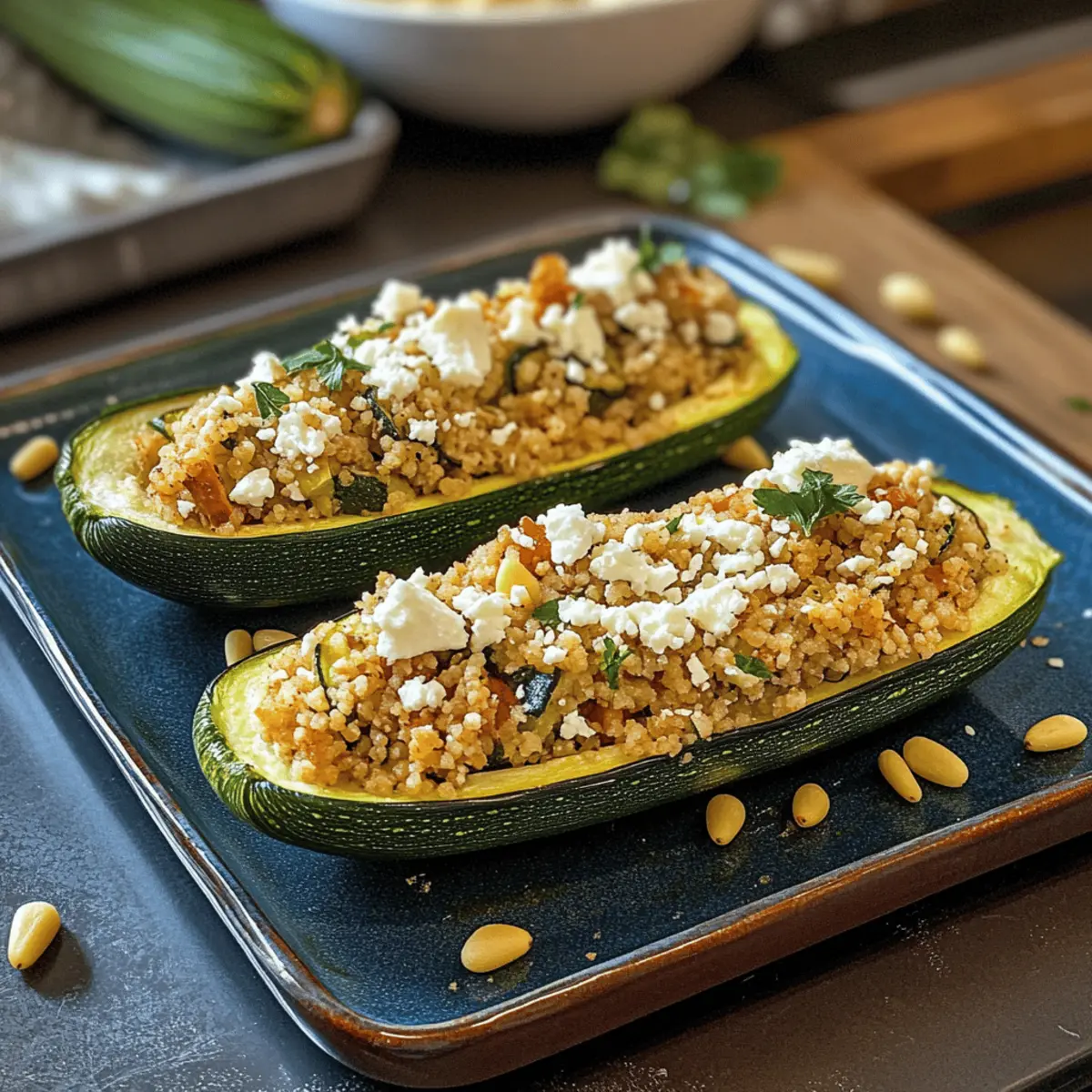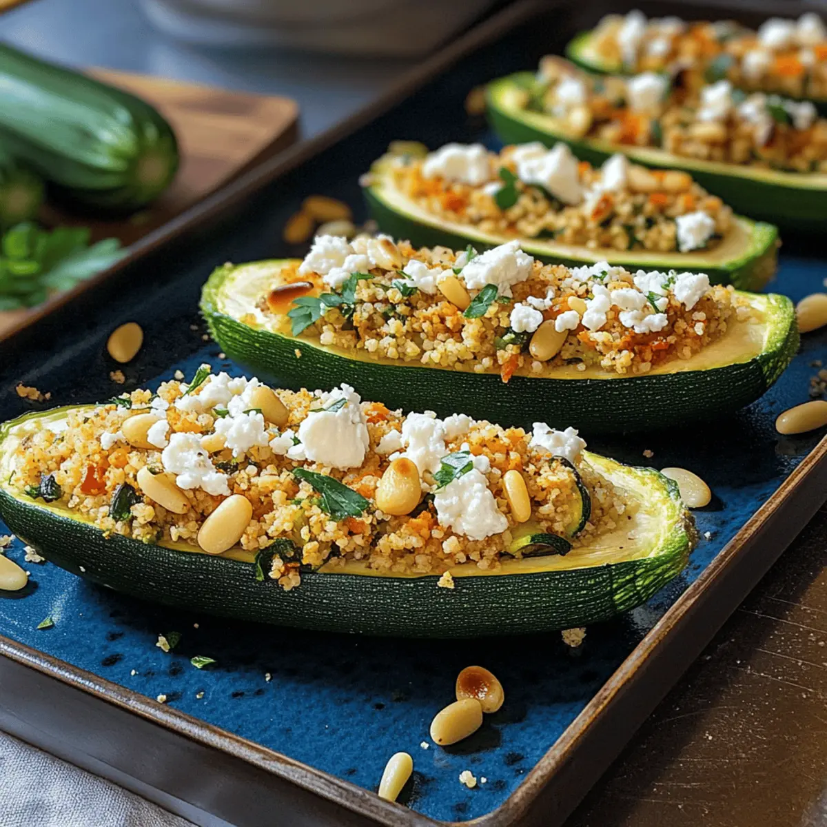 Die Sonne scheint, und der perfekte Sommerabend kündigt sich an – was könnte da besser passen als gefüllte Zucchini mit Couscous und Feta? Diese vegetarische Kreation bringt nicht nur Farbe auf deinen Tisch, sondern auch eine Extraportion Geschmack. Innerhalb von nur 30 Minuten zauberst du ein gesundes Gericht, das als Hauptspeise genauso überzeugt wie als verführerische Beilage. Die Kombination aus zartem Gemüse und herzhaftem Feta macht es zu einem unwiderstehlichen Sommerhighlight. Bist du bereit, mit dieser leckeren Füllung neue kulinarische Genüsse zu entdecken? Lass uns anfangen! Warum sind gefüllte Zucchini so beliebt? Einfache Zubereitung: Diese gefüllten Zucchini sind in nur 30 Minuten fertig, ideal für hektische Tage! Vielseitig: Du kannst die Füllung leicht anpassen; probiere verschiedene Gemüse oder sogar Quinoa statt Couscous aus! Gesund und nährstoffreich: Perfekt für eine ausgewogene Ernährung, vollgepackt mit frischem Gemüse und Geschmack. Familienfreundlich: Dieses köstliche Gericht kommt bei Groß und Klein gleichermaßen gut an. Perfekt fürs Freie: Sie sind die ideale Beilage für Grillabende oder sommerliche Picknicks. Entdecke auch diese Rezepte wie Honig Feta Hühnchen oder köstliche Pasta mit Kirschtomaten für eine rundum gelungene Mahlzeit! Gefüllte Zucchini Zutaten • Welche leckeren Zutaten benötigst du? Für die Füllung: Instant Couscous – dient als Hauptbestandteil; kann durch Quinoa für eine glutenfreie Option ersetzt werden. Gemüsebrühe – verleiht dem Couscous Geschmack; verwende natriumarme Brühe für eine gesündere Variante. Zucchini – die perfekte Gemüsehülle für die Füllung; achte darauf, dass sie fest und frisch sind. Rote Paprika – sorgt für Süße und Knusprigkeit; du kannst jeden Farbton von Paprika verwenden. Rote Zwiebel – bringt eine aromatische Tiefe; gelbe oder weiße Zwiebeln sind ebenfalls gut austauschbar. Knoblauchzehe – verstärkt das Aroma der Speise; frischer Knoblauch oder Knoblauchpulver sind gute Alternativen. Weißer Balsamico – fügt einen spritzigen Abschluss hinzu; ersetzt werden kann er durch Apfelessig. Pinienkerne – bringen einen nussigen Geschmack und Textur; alternativ eigenen sich Mandeln oder Walnüsse. Basilikum – frische Kräuter verleihen Frische; bei Bedarf können die frischen durch getrocknete ersetzt werden. Petersilie – garnierte das Gericht und sorgt für Frische; jede andere frische Kräuterart kann hier verwendet werden. Feta – sorgt für Cremigkeit und Reichhaltigkeit; du kannst ihn durch Ziegenkäse ersetzen, um einen anderen Geschmack zu erzielen. Zimt – gibt einen Hauch von Wärme für ein abgerundetes Geschmacksbild; lasse es weg, wenn du keinen Zimt magst. Salz & Pfeffer – unverzichtbare Gewürze; nach Geschmack verwenden. Olivenöl – wird zum Anbraten und Drizzeln verwendet; kann durch Avocadoöl ersetzt werden. Die vielfältigen Zutaten der gefüllten Zucchini mit Couscous und Feta kreieren nicht nur ein köstliches Gericht, sondern sorgen auch dafür, dass es bei jedem Bissen aufregend bleibt! Schritt-für-Schritt-Anleitung für gefüllte Zucchini mit Couscous und Feta Schritt 1: Couscous vorbereiten Gib den Instant-Couscous in eine Schüssel und übergieße ihn mit heißer Gemüsebrühe. Decke die Schüssel ab und lasse den Couscous etwa 10 Minuten quellen, bis er die Flüssigkeit vollständig aufgesogen hat. Verwende eine Gabel, um ihn anschließend aufzulockern und beiseitezustellen, während du die Zucchini vorbereitest. Schritt 2: Zucchini vorbereiten Halbiere die Zucchini der Länge nach und höhle sie vorsichtig aus, sodass ein Rand von etwa 1 cm bleibt. Bringe in einem Topf ausreichend gesalzenes Wasser zum Kochen und blanchiere die Zucchinihälften für 4-5 Minuten. Nimm sie danach aus dem Wasser und lasse sie auf einem Küchentuch abkühlen, sodass sie ihre Form behalten. Schritt 3: Ofen vorheizen Heize deinen Backofen auf 200°C vor. Dadurch wird sichergestellt, dass die gefüllten Zucchini mit Couscous und Feta gleichmäßig backen und eine schöne goldene Farbe erhalten, wenn du sie später hineingibst. Schritt 4: Pinienkerne rösten In einer trockenen Pfanne ohne Öl die Pinienkerne bei mittlerer Hitze rösten, bis sie leicht goldbraun sind, was etwa 3-5 Minuten dauert. Achte darauf, sie regelmäßig umzurühren, um ein Anbrennen zu verhindern. Nimm sie dann vom Herd und stelle sie beiseite. Schritt 5: Gemüse anbraten Erhitze in derselben Pfanne etwas Olivenöl und brate die gewürfelte rote Zwiebel und Paprika darin an, bis die Zwiebel glasig wird, etwa 5 Minuten. Füge dann den gehackten Knoblauch hinzu und lasse alles für eine weitere Minute braten, um das Aroma freizusetzen. Deglaziere die Pfanne anschließend mit dem weißen Balsamico. Schritt 6: Füllung mischen Vereine den aufgeflufften Couscous mit der angebratenen Zwiebel-Paprika-Mischung, den gerösteten Pinienkernen, frischem Basilikum, gehackter Petersilie und zerbröckeltem Feta in einer großen Schüssel. Würze die Mischung mit Salz, Pfeffer und einer Prise Zimt, um das Geschmackserlebnis der gefüllten Zucchini zu intensivieren. Schritt 7: Zucchini füllen Fülle die vorbereiteten Zucchinihälften großzügig mit der Couscous- und Fetafüllung. Platziere die gefüllten Zucchini auf ein mit Backpapier ausgelegtes Backblech. Träufle etwas Olivenöl über die Zucchini, um ihnen eine schöne Bräunung zu verleihen und zusätzliches Aroma hinzuzufügen. Schritt 8: Zucchini backen Backe die gefüllten Zucchini für etwa 8-10 Minuten im vorgeheizten Ofen, bis die Zucchini zart sind und die Füllung leicht goldbraun wird. Überwache sie gegen Ende der Backzeit, um sicherzustellen, dass sie nicht zu weich werden und ihre Form behalten. Meal Prep für gefüllte Zucchini mit Couscous und Feta Gefüllte Zucchini mit Couscous und Feta sind ideal für die Meal Prep! Du kannst die Zucchinihälften bis zu 24 Stunden im Voraus vorbereiten, indem du das Fruchtfleisch auslässt