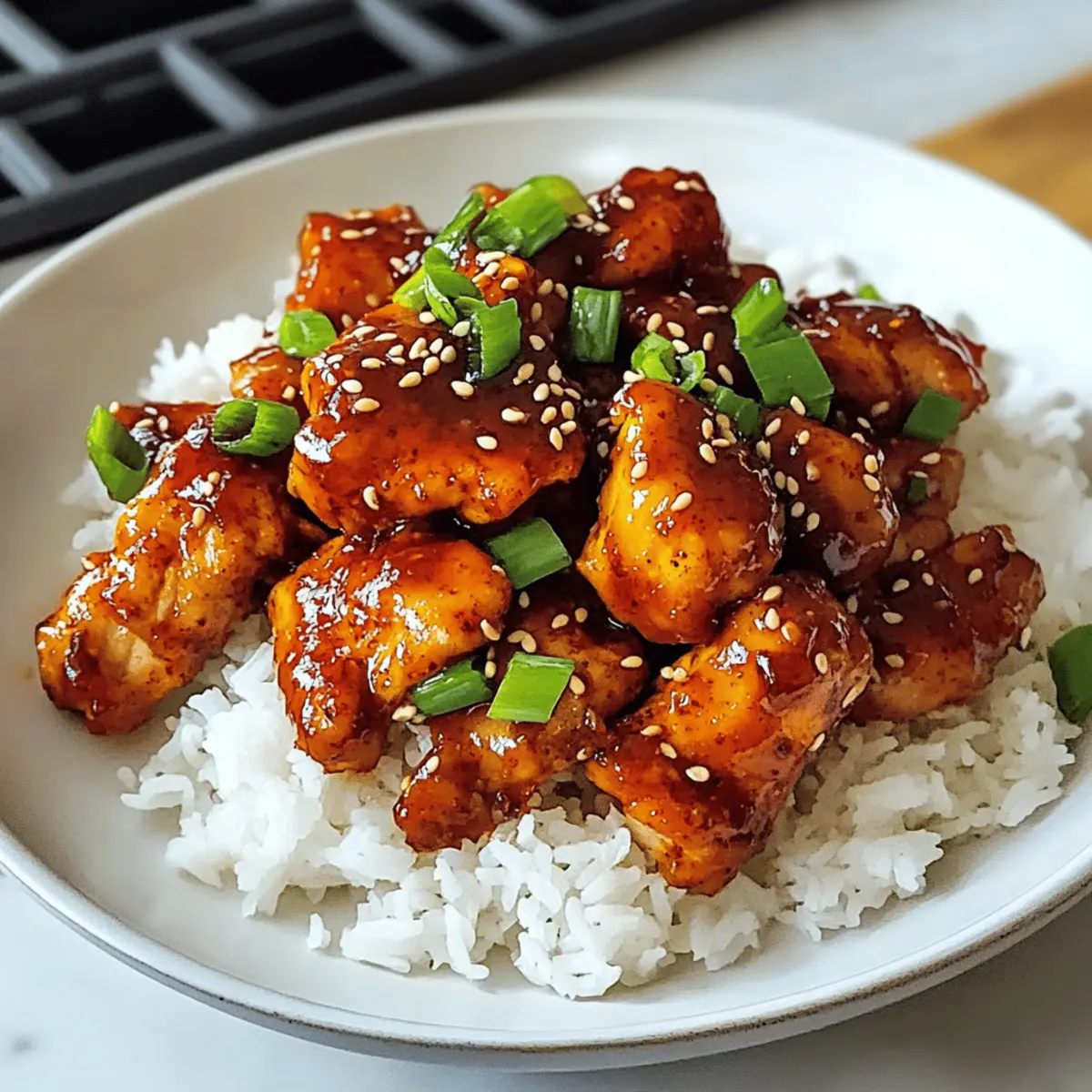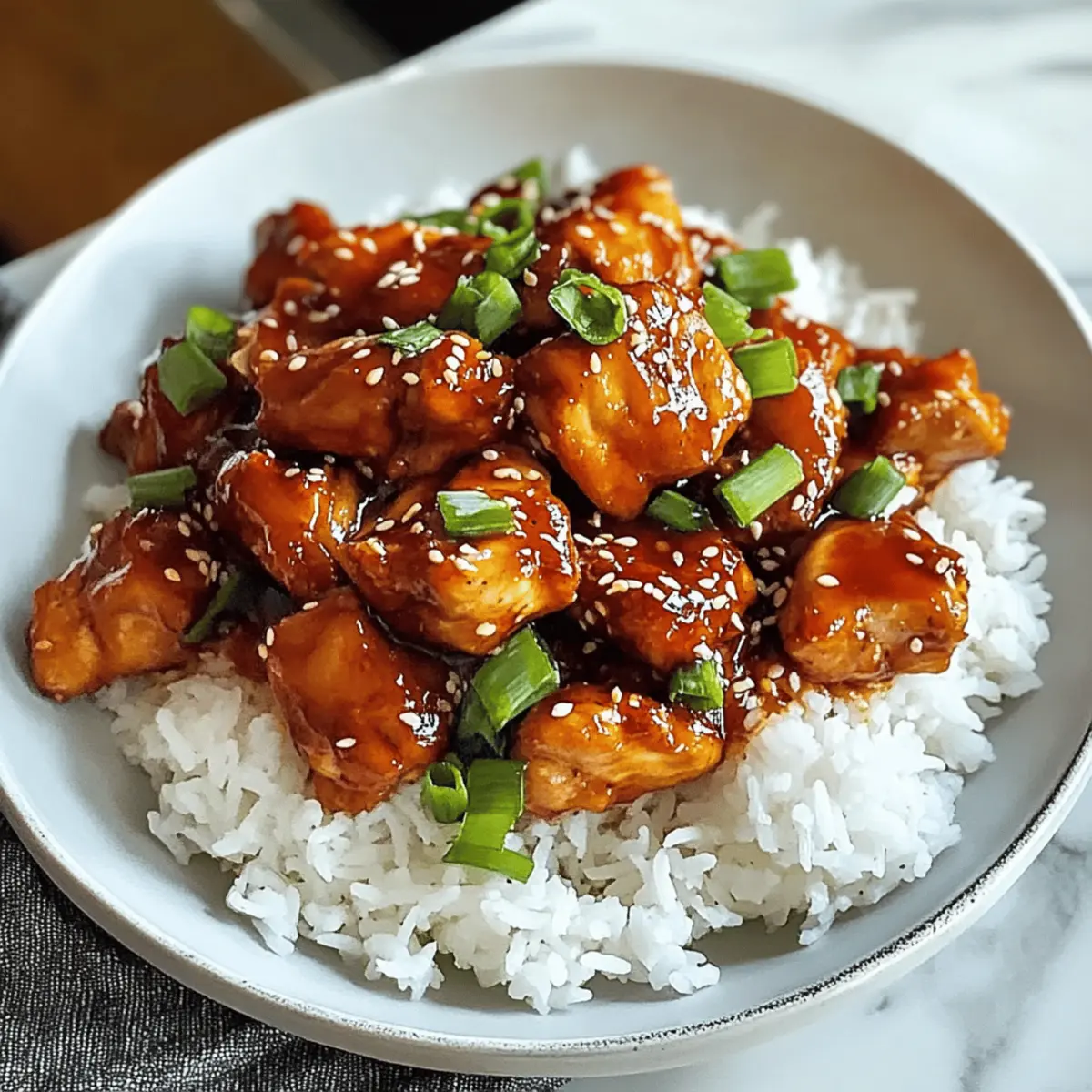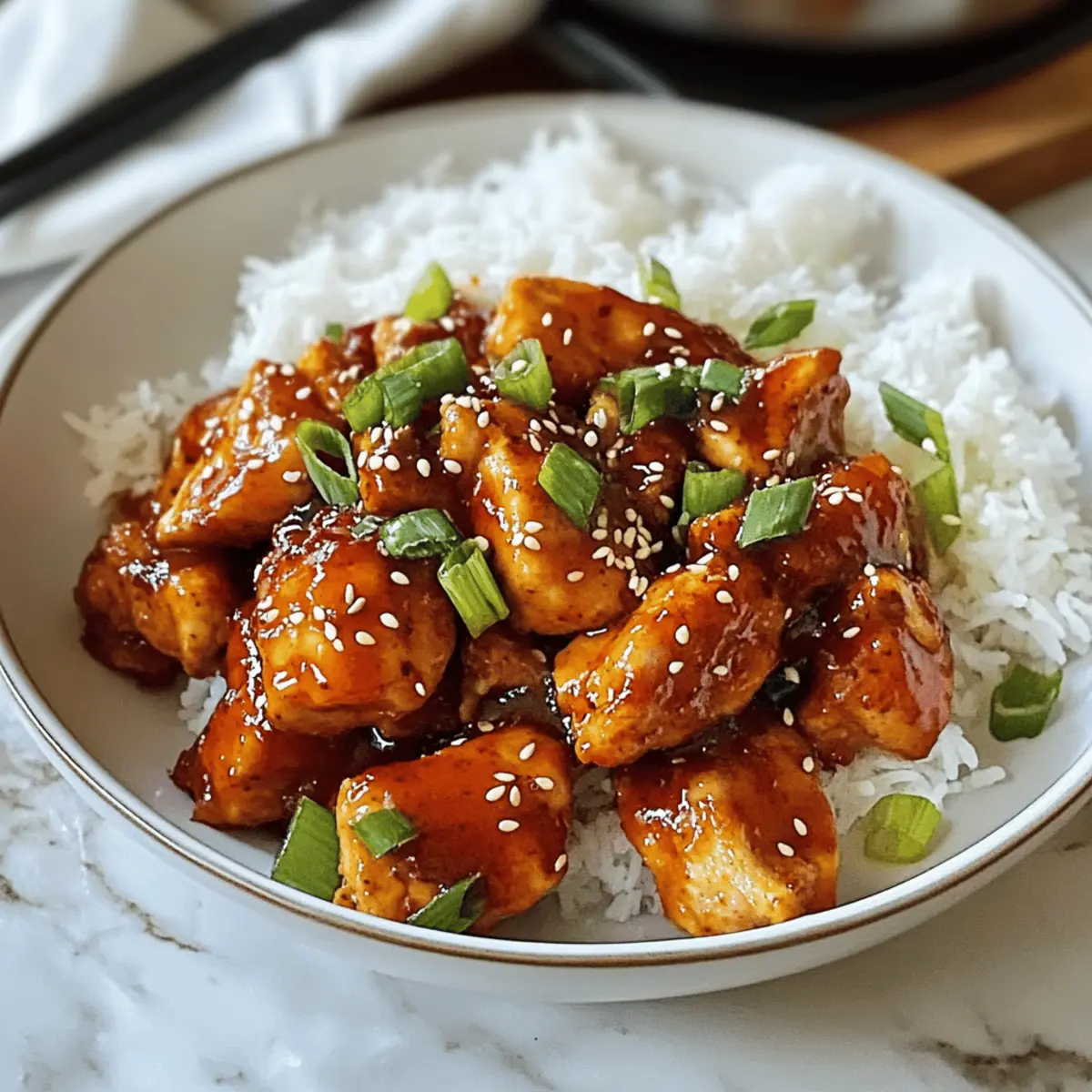 „Kann ich Ihnen etwas über den Geschmack von Süßem und Würzigem Gochujang-Hühnchen erzählen?“ Diese Frage hätte ich mir früher nicht gestellt. Doch seit ich das Gericht zum ersten Mal zubereitet habe, bin ich süchtig nach der perfekten Balance von süß, scharf und umami. Denn dieses Rezept ist nicht nur eine köstliche Einführung in die koreanische Küche, sondern auch eine wahre Zeitersparnis: In nur 25 Minuten kann ich ein fantastisches Abendessen auf den Tisch bringen. Ob nach einem langen Arbeitstag oder als besonderes Highlight für Freunde – dieses Gericht ist einfach zuzubereiten und lässt sich spielend an verschiedene Geschmäcker anpassen. Neugierig, wie diese Aromen Ihr nächstes Essen verwandeln können? Lassen Sie uns loslegen! Warum ist dieses Rezept so einzigartig? Einfache Zubereitung: Mit nur wenigen Zutaten und schrittweisen Anweisungen gelingt das Süßes und Würziges Gochujang-Hühnchen jedem! Vielseitige Aromen: Die Kombination aus süßem Gochujang und herzhaftem Sojasoßengeschmack bietet eine ausgewogene Geschmacksexplosion, die einfach begeistert. Anpassbar für alle: Ob für scharfe Liebhaber oder diejenigen, die es milder mögen, dieses Rezept lässt sich nach Belieben anpassen. Perfekt für jede Gelegenheit: Ideal für geschäftige Wochentage oder besondere Anlässe – ein echter Publikumsliebling! Koreanische Küche zum Selbermachen: Holen Sie sich den authentischen Geschmack Koreas direkt nach Hause, ohne auf Restaurantbesuche angewiesen zu sein. Schnelligkeit: In nur 25 Minuten können Sie ein köstliches Gericht zubereiten, das Ihre Familie und Freunde begeistern wird. Probieren Sie dazu auch unsere Tostadas Vom Blech oder die Haehnchen Suesskartoffel Einfach, wenn Sie mehr schnelle und leckere Rezepte suchen! Zutaten für Süßes und Würziges Gochujang-Hühnchen • Entdecken Sie die geschmackliche Vielfalt, die diese Zutaten bieten! Für die Marinade Gochujang – Ein unverzichtbares Element, das reichhaltigen Umami-Geschmack und eine süße Note verleiht. Sojasauce – Sie sorgt für eine salzige Tiefe; verwenden Sie Tamari für eine glutenfreie Variante. Mirin – Fügt Süße und Tiefe hinzu; alternativ können Sie eine Mischung aus Sake und Zucker nutzen. Honig – Bringt natürliche Süße ins Gericht; Agavendicksaft ist ein veganer Ersatz. Knoblauch – Verstärkt den Gesamtgeschmack; verwenden Sie frischen Knoblauch für ein intensiveres Aroma. Sesamöl – Fügt Nussigkeit und aromatische Noten hinzu, während Rapsöl zum Braten genutzt wird. Ingwer – Bringt Wärme und Würze; frische Ingwerknollen sind hier die beste Wahl. Für das Hühnchen Hühnchenbrust – Die Hauptzutat; kann durch Tofu für eine vegetarische Option ersetzt werden. Rapsöl – Zum Braten verwendet; auch andere neutrale Öle sind möglich. Zur Garnierung Geröstete Sesamsamen – Verleihen das besondere Etwas und rundet den Geschmack ab. In Scheiben geschnittene Frühlingszwiebeln – Für zusätzlichen Geschmack und ansprechende Präsentation. Mit diesen Zutaten können Sie das köstliche Süßes und Würziges Gochujang-Hühnchen zubereiten und ein authentisches Stück koreanischer Küche zu Ihnen nach Hause bringen! Schritt-für-Schritt-Anleitung für Süßes und Würziges Gochujang-Hühnchen Schritt 1: Marinade vorbereiten In einer kleinen Schüssel das Gochujang, die Sojasauce, den Mirin, den Honig, den geriebenen Knoblauch, das Sesamöl und den geriebenen Ingwer gut miteinander vermischen. Rühren Sie alles kräftig um, bis die Mischung eine homogene Konsistenz erreicht. Diese aromatische Marinade ist der Schlüssel zum Geschmack des Süßes und Würzigen Gochujang-Hühnchens! Schritt 2: Öl erhitzen Erhitzen Sie in einer großen Pfanne oder einem Wok bei mittelhoher Hitze etwa 2 Esslöffel Rapsöl. Warten Sie, bis das Öl heiß und leicht schimmernd ist, was in etwa 1-2 Minuten der Fall sein sollte. Achten Sie darauf, dass das Öl nicht zu rauchen beginnt, damit Sie das Hühnchen perfekt anbraten können. Schritt 3: Hühnchen anbraten Fügen Sie die erste Hälfte der Hühnchenstücke in die heiße Pfanne hinzu und braten Sie sie unter häufigem Rühren 5 Minuten lang an, bis sie goldbraun und durchgegart sind. Sie sollten sehen, dass das Hühnchen nicht mehr rosa ist. Nehmen Sie es dann aus der Pfanne und wiederholen Sie den Vorgang mit der verbleibenden Hühnchenportion. Schritt 4: Sauce hinzufügen Geben Sie alle gebratenen Hühnchenstücke zurück in die Pfanne. Gießen Sie die vorbereitete Marinade über das Hühnchen und rühren Sie alles gut um, sodass die Sauce gleichmäßig verteilt ist. Lassen Sie die Kombination auf mittlerer Hitze für etwa 1-2 Minuten köcheln, um die Aromen zu vereinen. Schritt 5: Sauce eindicken Lassen Sie das Süße und Würzige Gochujang-Hühnchen weiterhin kochen, bis die Sauce etwa 3 Minuten lang sprudelt und deutlich eindickt. Achten Sie darauf, dass die Sauce eine glänzende und klebrige Textur erreicht, die gut am Hühnchen haftet. Schritt 6: Anrichten und Garnieren Nehmen Sie das Gericht vom Herd und garnieren Sie es großzügig mit gerösteten Sesamsamen und in Scheiben geschnittenen Frühlingszwiebeln. Die Garnierung sorgt nicht nur für zusätzlichen Geschmack, sondern auch für eine ansprechende Präsentation. Servieren Sie das Hühnchen heiß über gekochtem weißen Reis oder Quinoa. Tipps für die Vorausplanung des Süßes und Würzigen Gochujang-Hühnchens Einfache Zubereitung ist der Schlüssel, insbesondere für das Süßes und Würziges Gochujang-Hühnchen! Sie können die Marinade mit Gochujang, Sojasauce, Mirin, Honig, Knoblauch, Sesamöl und Ingwer bis zu 24 Stunden im Voraus vorbereiten, um die Aromen optimal einziehen zu lassen. Das Hühnchen selbst kann bereits in Stücke geschnitten und bis zu 3 Tage im Voraus im Kühlschrank aufbewahrt werden. Achten Sie darauf, das Hühnchen in einem luftdichten Behälter zu lagern, um die Frische zu bewahren. Wenn Sie bereit sind zu kochen, erhitzen Sie da