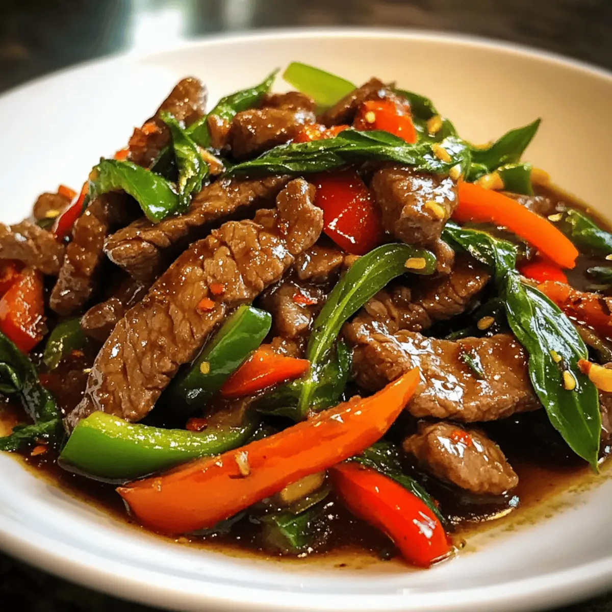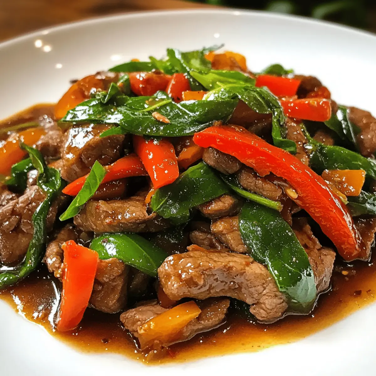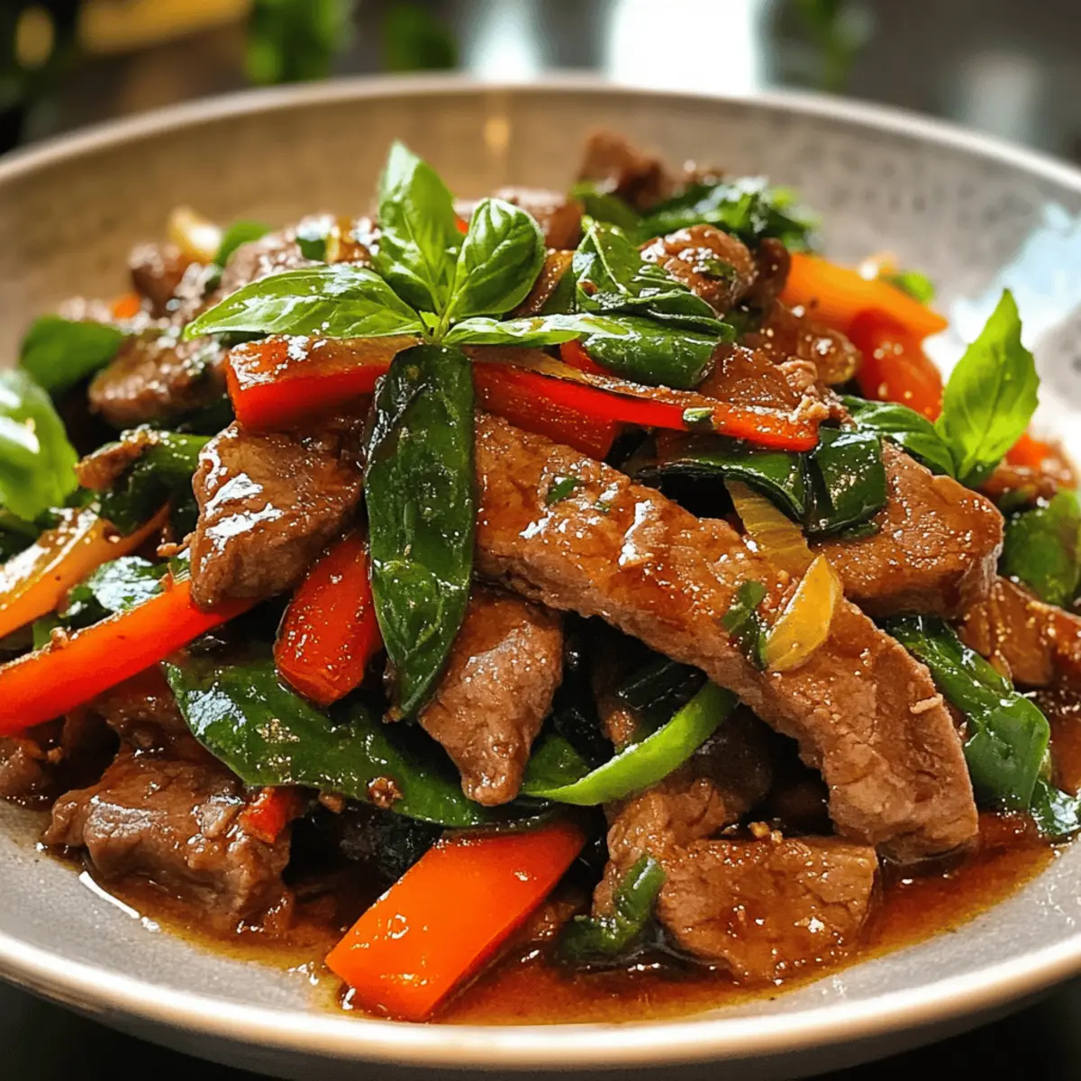 Während ich die lebhaften Farben der Zutaten in meiner Küche betrachte, fühle ich mich sofort in die geschäftigen Straßen Thailands versetzt. Die Thai-Basilikum-Rindfleisch-Pfanne ist nicht nur ein Gericht, sondern eine Geschmacksreise, die frisches Gemüse, zartes Rindfleisch und den unverwechselbaren Duft von Thai-Basilikum vereint. Diese pfiffige und schnelle Zubereitung ist perfekt für anspruchsvolle Abende, an denen Zeit Mangelware ist, und gleichzeitig zeigt sie sich als echter Publikumsliebling bei Freunden und Familie. Ob über duftendem Jasminreis oder zarten Nudeln serviert – mit nur wenigen Zutaten bist du bereit, ein köstliches Dinner zu zaubern. Bist du bereit, deine Geschmacksknospen auf ein unvergessliches Abenteuer zu schicken? Liebst du schnelle, köstliche Gerichte? Einfache Zubereitung: Diese Thai-Basilikum-Rindfleisch-Pfanne benötigt nur wenige Schritte, um ein fantastisches Ergebnis zu erzielen. Vielfältige Optionen: Du kannst sie ganz leicht mit Hühnchen oder Tofu abwandeln, um jedem Geschmack gerecht zu werden. Aromatische Frische: Der Duft von frischem Thai-Basilikum und knackigem Gemüse verbindet sich wunderbar mit zartem Rindfleisch. Schnell und nahrhaft: Perfekt für hektische Abende – in unter 30 Minuten ist das Essen servierbereit. Genuss für alle: Ob für Familie oder Freunde, dieses Gericht wird garantiert überall gut ankommen! Nutze zum Beispiel auch würzige Frühlingsrollen, um deine Mahlzeit zu bereichern! Thai-Basilikum-Rindfleisch-Pfanne Zutaten Für das Rindfleisch • Rindfleisch (500g) – Verwende mageres Fleisch wie Flank oder Hüftsteak für optimale Zartheit. • Sojasauce (2 Esslöffel) – Gibt dem Gericht eine salzige, umami-reiche Note; verwende Tamari für glutenfreie Optionen. • Austernsauce (1 Esslöffel) – Verstärkt die Geschmackstiefe; kann für eine vegetarische Variante weggelassen werden. • Zucker (1 Teelöffel) – Balanciert die Aromen; passe die Menge nach deinem Geschmack an. Für das Gemüse • Gemüseöl (2 Esslöffel) – Hoch erhitzbares Öl wie Erdnuss- oder Rapsöl eignet sich ideal zum Braten. • Knoblauch (1 Esslöffel, gehackt) – Frisch gehackter Knoblauch sorgt für ein intensives Aroma, das deinem Gericht Leben einhaucht. • Paprika (1 Tasse, in Scheiben) – Fügt Süße und Farbe hinzu; du kannst auch Brokkoli oder Karotten für Variation verwenden. • Chiliflocken (1 Teelöffel) – Für eine pikante Note; weniger verwenden, wenn du es milder magst. • Thai-Basilikum (1 Tasse, frisch) – Die aromatische Hauptzutat; regulärer Basilikum kann auch verwendet werden, hat jedoch einen anderen Geschmack. Für die finale Abstimmung • Salz & Pfeffer – Zum Würzen; füge Salz nach dem Kochen hinzu, um eine Überwürzung zu vermeiden. Diese Thai-Basilikum-Rindfleisch-Pfanne wird nicht nur deine Geschmacksnerven erfreuen, sondern auch deine Kochkünste auf das nächste Level heben! Schritt-für-Schritt-Anleitung für die Thai-Basilikum-Rindfleisch-Pfanne Step 1: Rindfleisch vorbereiten Schneide das Rindfleisch gegen die Faser in dünne Streifen, um die Zartheit zu gewährleisten. Mische die geschnittenen Stücke mit Sojasauce, Austernsauce, Salz und Pfeffer in einer Schüssel und lasse es für 15-20 Minuten marinieren. Diese Marinade verleiht der Thai-Basilikum-Rindfleisch-Pfanne eine tiefe, würzige Grundlage. Step 2: Knoblauch anbraten Erhitze in einer großen Pfanne oder einem Wok 2 Esslöffel Gemüseöl bei mittelhoher Hitze. Füge den gehackten Knoblauch hinzu und brate ihn etwa 30 Sekunden lang an, bis er duftet und leicht goldbraun ist. Achte darauf, dass er nicht verbrennt, da dies den Geschmack der gesamten Thai-Basilikum-Rindfleisch-Pfanne beeinträchtigen kann. Step 3: Rindfleisch braten Gib das marinierte Rindfleisch in die Pfanne und lasse es für 1-2 Minuten ohne Rühren anbraten, damit eine schöne Kruste entsteht. Rühre dann vorsichtig um und brate es weitere 2-3 Minuten, bis es durchgegart und goldbraun ist. Dieser Schritt sorgt für die perfekte Textur der Rindfleischstücke in deiner Thai-Basilikum-Rindfleisch-Pfanne. Step 4: Gemüse hinzufügen Nun ist es Zeit, das geschnittene Gemüse hinzuzufügen. Gib die Paprika in die Pfanne und brate sie 1-2 Minuten lang mit, bis sie leicht zart sind, aber noch einen knackigen Biss haben. Das Gemüse bringt frische Farben und Aromen in die Thai-Basilikum-Rindfleisch-Pfanne und ergänzt das Rindfleisch hervorragend. Step 5: Sauce kombinieren Füge die restliche Sojasauce, die Austernsauce, den Zucker und die Chiliflocken in die Pfanne hinzu. Rühre alles gut um, sodass das Gemüse und das Rindfleisch gleichmäßig mit der Sauce überzogen sind. Lass die Mischung für eine weitere Minute köcheln, damit sich die Aromen entfalten und für ein köstliches Gesamtbild sorgen. Step 6: Mit Basilikum verfeinern Nehme die Pfanne vom Herd und füge das frische Thai-Basilikum hinzu. Mische alles sorgfältig, bis das Basilikum leicht verwelkt ist und sein intensives Aroma freisetzt. Dieser letzte Schritt ist entscheidend, um der Thai-Basilikum-Rindfleisch-Pfanne ihren charakteristischen Duft und Geschmack zu verleihen. Step 7: Servieren Serviere die Thai-Basilikum-Rindfleisch-Pfanne sofort über duftendem Jasminreis oder Nudeln. Träufle die restliche Sauce über das Gericht, um dem Ganzen den letzten Schliff zu geben. Dieses köstliche Essen ist nicht nur schnell zubereitet, sondern beeindruckt auch Familie und Freunde! Thai-Basilikum-Rindfleisch-Pfanne Varianten Lass deiner Kreativität freien Lauf und passe diese köstliche Thai-Basilikum-Rindfleisch-Pfanne ganz nach deinem Geschmack an! Hühnchen: Tausche das Rindfleisch gegen zartes Hühnchen aus – so wird es ebenfalls saftig und lecker. Tofu: Für eine pflanzliche Version kannst du festen Tofu verwenden, der gut mariniert und gebraten wird. Glutenfrei: Verwende Tamari anstelle von Sojasauce, um die perfekte glutenfreie Option zu kreieren. Nudeln: Anstatt des Reis kannst du auch knackig