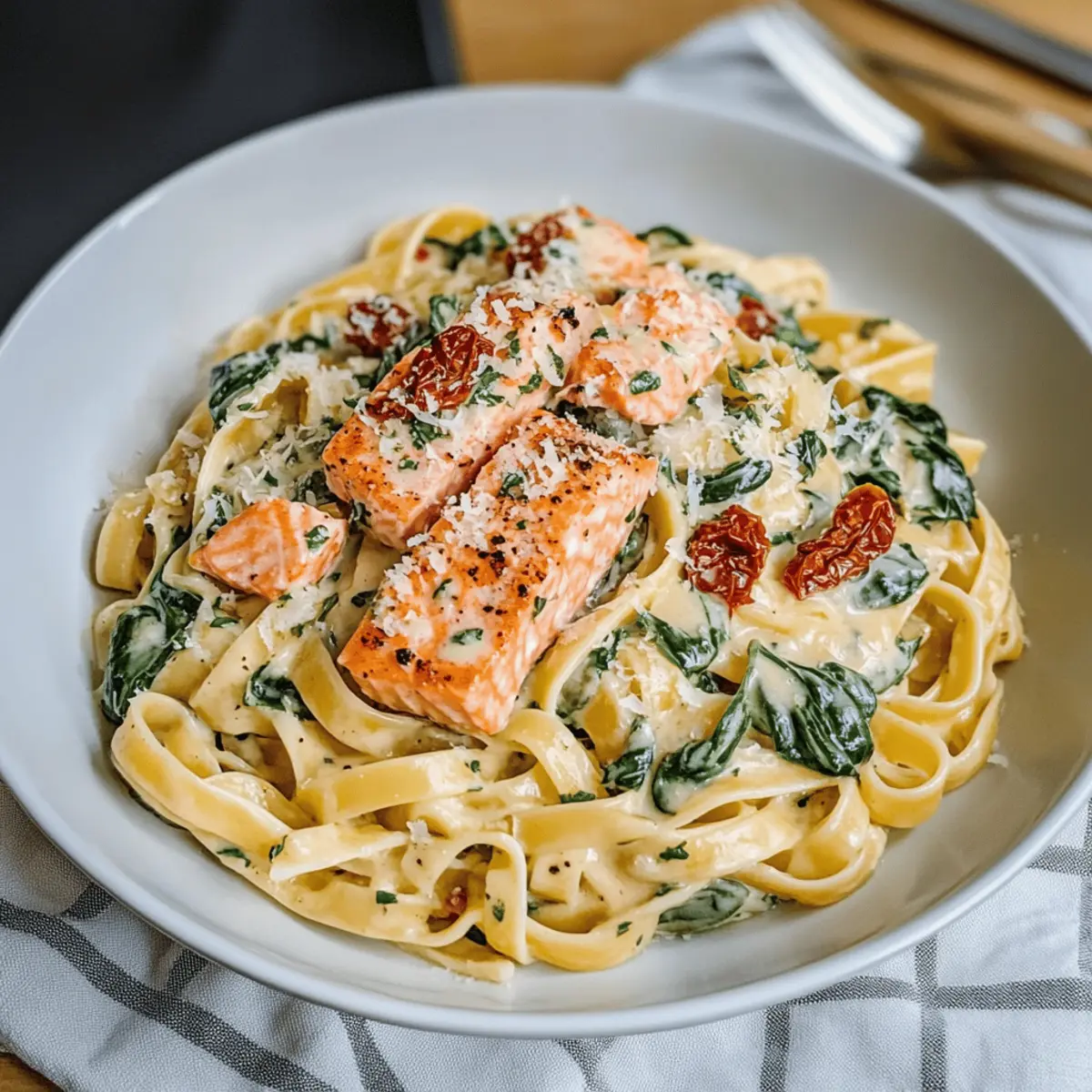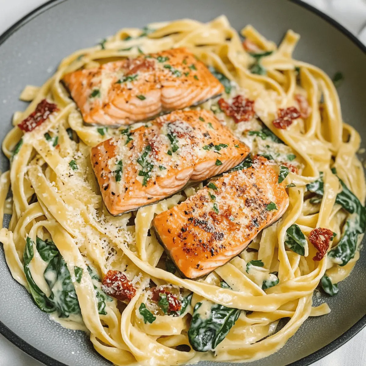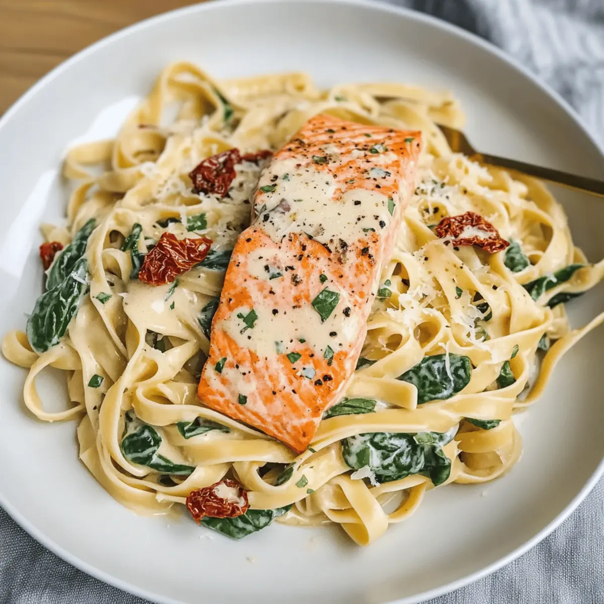 Eines Abends, als der Hunger mich überkam, wanderte mein Blick durch den Kühlschrank und blieb bei einem Stück frischen Lachses hängen. Der Gedanke an ein schnelles, aber dennoch raffiniertes Abendessen brachte mich auf die Idee, Toskanischer Lachs Fettuccine Alfredo zu kreieren. Diese wunderbare Kombination aus cremiger Sauce, aromatischem Knoblauch und sonnengereiften Tomaten hat nicht nur einen einzigartigen Geschmack, sondern ist auch in weniger als 30 Minuten zubereitet – perfekt für stressige Wochentage. Egal, ob du nach einem leckeren Familienessen suchst oder einfach nur etwas Besonderes für dich selbst zaubern möchtest, dieses Gericht vereint italienische Gastfreundschaft mit einem Hauch von Luxus. Hast du Lust, das Rezept auszuprobieren? Lass uns gemeinsam in die Welt der italienischen Küche eintauchen! Warum ist dieses Rezept ein Muss? Einfachheit: Das Rezept ist unkompliziert und eignet sich für alle Kochlevel—perfekt, um auch unter Zeitdruck eine köstliche Mahlzeit zuzubereiten. Vielseitigkeit: Du kannst Lachs durch Hühnchen oder Garnelen ersetzen oder für eine ketofreundliche Variante Zucchininudeln verwenden. Reiche Aromen: Die Kombination aus Knoblauch, sonnengereiften Tomaten und Parmesan verleiht dem Gericht eine unverwechselbare Geschmacksfülle. In weniger als 30 Minuten: Ideal für stressige Wochentage, gelingt dir ein Gourmet-Essen in kurzer Zeit. Crowd-Pleasing: Ob für die Familie oder Gäste – jeder wird diesen italienischen Klassiker lieben! Probiere dazu auch unsere frische grüne Salat, um das Menü abzurunden. Zutaten für Toskanischer Lachs Fettuccine Alfredo Für die Nudeln • Dried Fettuccine Noodles – Hauptkohlenhydratsquelle, die Struktur verleiht; kann durch kurze Pasta wie Penne oder Farfalle ersetzt werden. Für den Lachs • Salmon Fillets – Hauptprotein, das reiche Aromen liefert; frischer Lachs ist ideal, aber auch Hühnchen kann verwendet werden. Für die Sauce • Olive Oil – Kochfett zum Anbraten des Lachses; kann durch Raps- oder Avocadoöl ersetzt werden. • Butter – Fügt Geschmack und Reichhaltigkeit hinzu; veganer Butter kann für eine milchfreie Option verwendet werden. • Garlic – Aromatischer Geschmacksträger; kann bei Bedarf durch Knoblauchpulver ersetzt werden. • Shallot – Mildes Zwiebelaroma; kann durch die Hälfte einer roten oder gelben Zwiebel ersetzt werden. • Sun-Dried Tomatoes – Verleiht dem Gericht einen würzigen, herben Geschmack; kann auch mit Sonnengetrockneten Tomatenpesto oder eingeweichten, getrockneten Tomaten ersetzt werden. • Heavy Cream – Für eine reichhaltige, cremige Sauce; für eine milchfreie Variante durch Kokosmilch ersetzen. • Half and Half – Weicht die Geschmackstiefe auf, kann durch zusätzliche Sahne oder eine milchfreie Alternative ersetzt werden. • Spinach – Fügt Farbe und Nährstoffe hinzu; kann durch Rucola oder gedämpften Brokkoli ersetzt werden. • Grated Parmesan – Verstärkt den Umami-Geschmack des Gerichts; Pecorino Romano oder Asiago als Alternativen geeignet. • Fresh Parsley – Frische Kräuter für die Garnierung; Basilikum kann als geschmackliche Abwechslung verwendet werden. • Lemon – Sorgt für die nötige Säure zur Ausgewogenheit der Reichhaltigkeit; optional, aber empfehlenswert. Mit diesen köstlichen Zutaten wirst du ein tolles Gericht zaubern, das dich und deine Liebsten begeistern wird! Schritt-für-Schritt-Anleitung für Toskanischer Lachs Fettuccine Alfredo Step 1: Nudeln kochen Bringe einen großen Topf mit gesalzenem Wasser zum Kochen. Füge die getrockenen Fettuccine-Nudeln hinzu und koche sie gemäß den Anweisungen auf der Verpackung, bis sie al dente sind, etwa 8-10 Minuten. Vergiss nicht, etwa 1/3 Tasse des Kochwassers aufzuheben, bevor du die Nudeln abgießt. Step 2: Lachs anbraten Erhitze in einer großen Pfanne bei mittlerer Temperatur 2 Esslöffel Olivenöl. Würze die Lachsfilets leicht mit Salz und Pfeffer und lege sie vorsichtig in die Pfanne. Sear die Filets für etwa 5 Minuten auf jeder Seite, bis sie goldbraun und durchgegart sind. Nimm den Lachs aus der Pfanne und halte ihn warm. Step 3: Sauce zubereiten Lass in derselben Pfanne 2 Esslöffel Butter bei mittlerer Hitze schmelzen. Füge 2 gehackte Knoblauchzehen und eine gehackte Schalotte hinzu und brate sie an, bis sie duften, etwa 1-2 Minuten. Gib die sonnengereiften Tomaten hinzu und brate sie für weitere 1-2 Minuten, bis sie weich sind. Step 4: Sahne und Gewürze hinzufügen Reduziere die Hitze auf niedrig und gieße die 1 Tasse Sahne sowie die 1/2 Tasse Milch (oder Half and Half) in die Pfanne. Lass die Mischung sanft köcheln und rühre gelegentlich um, während sie leicht eindickt, ca. 3-5 Minuten. Würze die Sauce mit Salz und Pfeffer nach Geschmack. Step 5: Spinat hinzufügen Füge eine Handvoll frischen Spinat zur Sauce hinzu und lasse ihn unter Rühren welken, bis er zusammengefallen ist, etwa 2 Minuten. Rühre anschließend die reservierte Kochflüssigkeit und 1/2 Tasse geriebenen Parmesan ein, bis der Käse geschmolzen ist und die Sauce cremig wird. Step 6: Fettuccine kombinieren Vermische die abgetropften Fettuccine-Nudeln sorgfältig mit der cremigen Sauce in der Pfanne, bis alles gut bedeckt ist. Schmecke optional für zusätzlichen Geschmack ab und füge mehr Parmesan hinzu, falls gewünscht. Step 7: Anrichten und servieren Verteile die Toskanischer Lachs Fettuccine Alfredo portioniert auf Teller. Lege ein Stück des Lachsfilets obenauf und garniere das Gericht mit frisch gehackter Petersilie. Presse zum Schluss etwas Zitronensaft über das Gericht, um die Reichhaltigkeit zu balancieren und genieße es! Toskanischer Lachs Fettuccine Alfredo Variationen Du kannst dieses Rezept ganz nach deinem Geschmack abwandeln und anpassen, um neue Aromen zu entdecken! Hühnchen statt Lachs: Verwende gegrilltes oder gebratenes Hühnchen; koche es etwa 3-4 Minuten weniger als den Lachs. Garnelen als Alternative: Tausche den Lachs gegen Garnelen für e