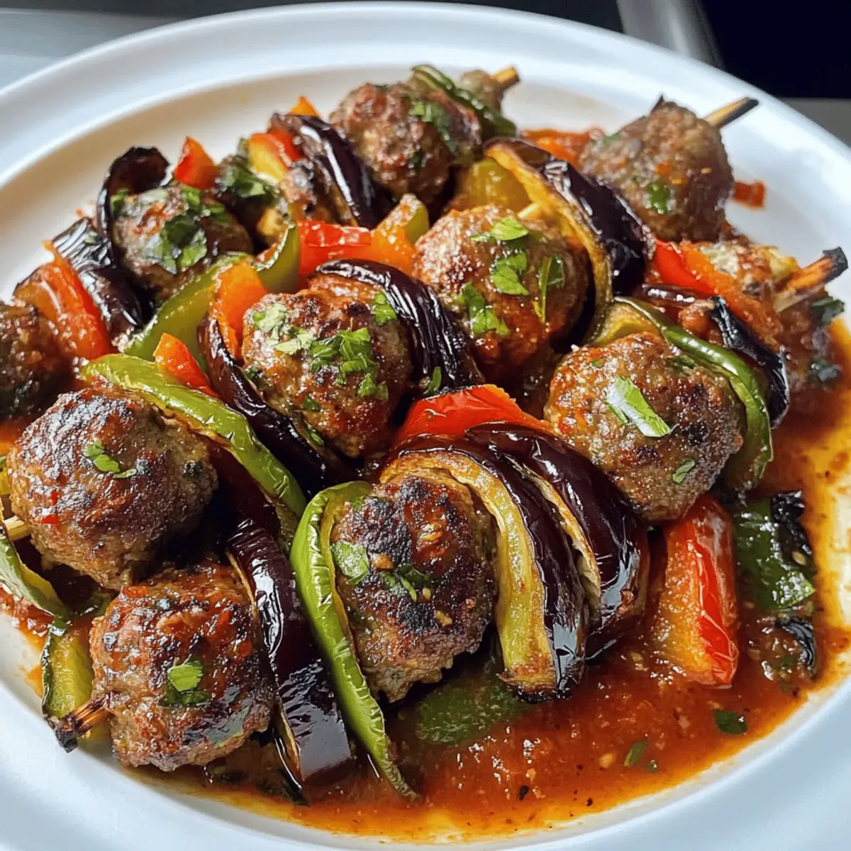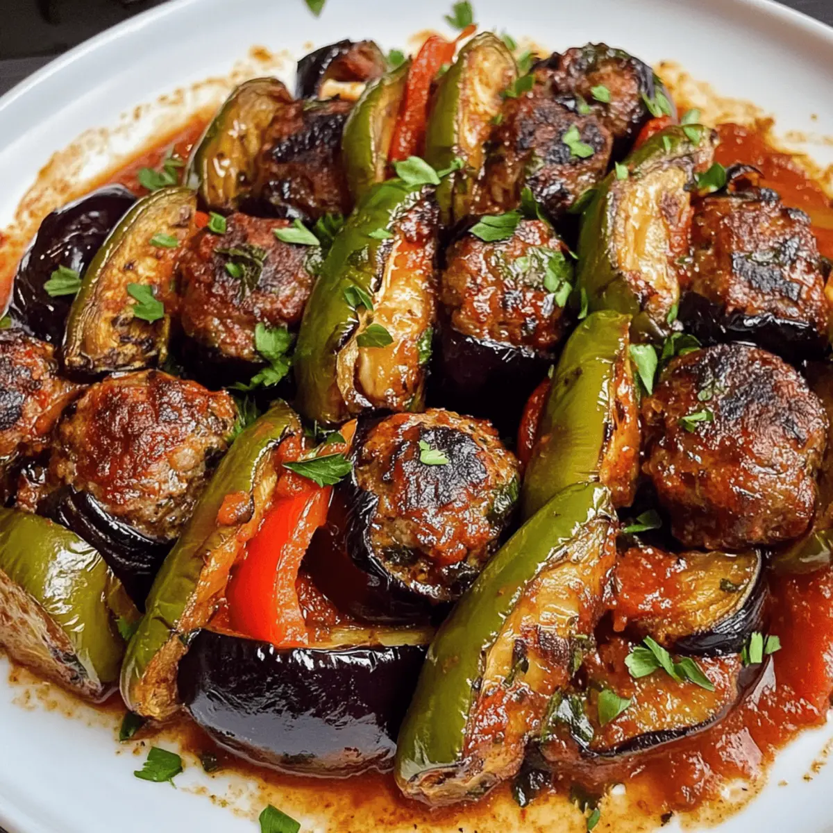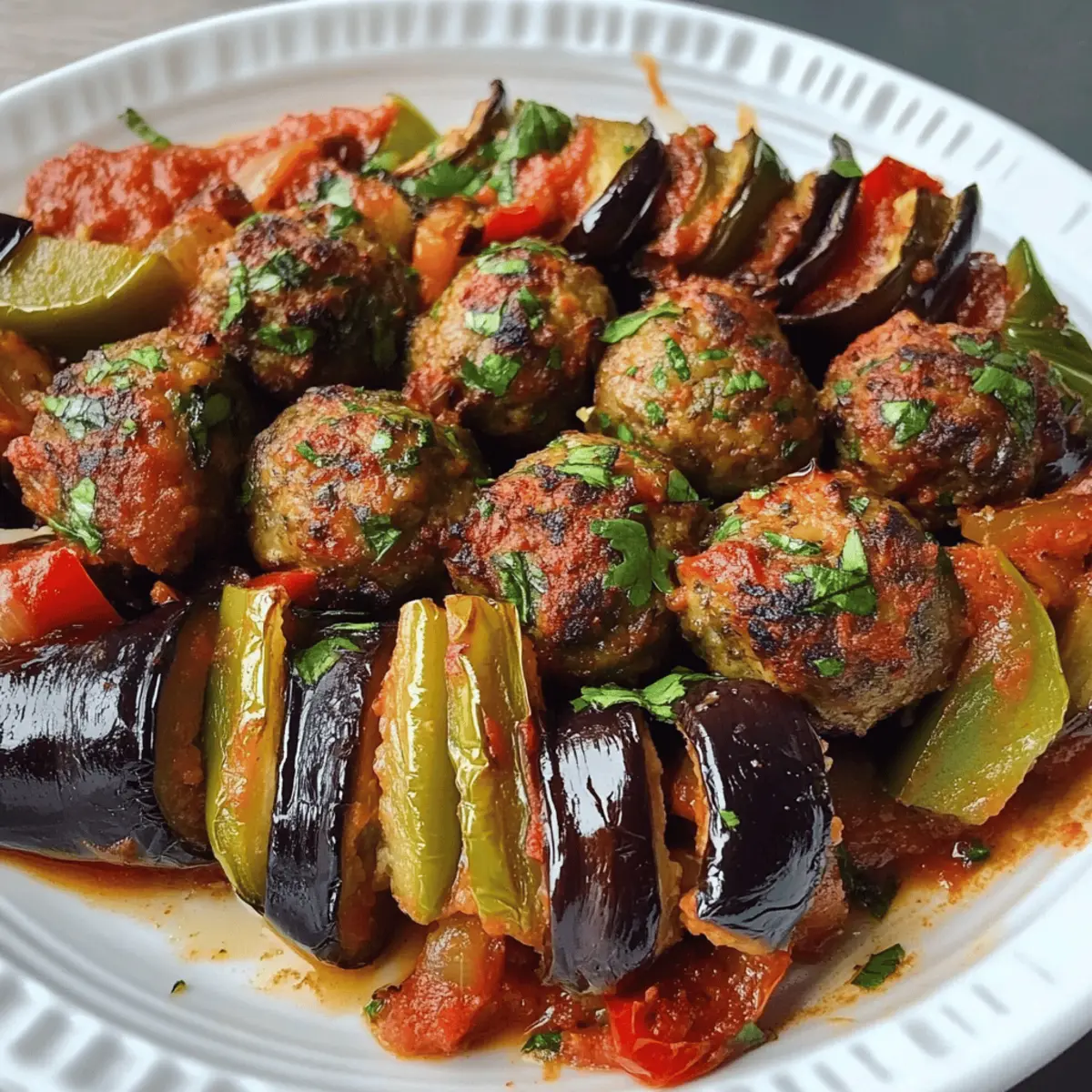 Die Aromen von warmen, sonnenverwöhnten Märkten in der Türkei kommen mir in den Sinn, wenn ich an mein neuestes Rezept denke: die Türkische Auberginenpfanne mit saftigen Fleischbällchen. Dieses Gericht, das in der Region Gaziantep entstanden ist, vereint zarte Auberginen und würzige Fleischbällchen zu einem wahren Fest der Sinne. Was ich besonders an dieser einfachen One-Pan-Mahlzeit liebe, ist, dass sie nicht nur schnell zuzubereiten ist, sondern auch als perfektes Meal Prep-Gericht dient—ideal für geschäftige Wochen! Und das Beste: Sie lässt sich problemlos im Gefrierschrank aufbewahren, sodass ich jederzeit einen Hauch des Mittelmeers genießen kann. Bereit, die Geschmacksknospen zu überraschen? Warum wirst du dieses Rezept lieben? Einfachheit: Die Zubereitung ist unkompliziert und erfordert nur grundlegende Kochkenntnisse. Vielfalt: Egal, ob du Fleischliebhaber oder Vegetarier bist, diese Auberginenpfanne bietet Optionen für jeden Geschmack—mit einer leckeren Halloumi-Variante. Herzhafter Genuss: Die Kombination aus zarten Auberginen und würzigen Fleischbällchen sorgt für ein intensives Geschmackserlebnis, das Erinnerungen an die Straßenmärkte der Türkei weckt. Einfrieren leicht gemacht: Dieses Gericht ist perfekt zum Vorbereiten und kann problemlos eingefroren werden, sodass du immer eine köstliche Mahlzeit zur Hand hast. Für weitere köstliche Ideen, schau dir auch die Auberginenpfanne Orientalische Gewaerze oder die Hackfleisch Bowl Mit an! Türkische Auberginenpfanne Zutaten Für die Fleischbällchen Hackfleisch (Lamm/Rind, 450g): – Die Hauptproteinquelle; kann durch mageres Fleisch oder eine pflanzliche Alternative ersetzt werden. Zwiebel (1 mittelgroß, gerieben): – Fügt den Fleischbällchen Feuchtigkeit und Süße hinzu. Altes Brot (60g): – Dient als Bindemittel; gut einweichen und auszudrücken ist wichtig. Ei (1): – Hilft, die Fleischballmischung zu binden. Petersilie (Bündel, glatte): – Bringt Frische in die Mischung. Gemahlener Kreuzkümmel (5ml): – Sorgt für ein aromatisches Gewürz, das den Fleischgeschmack verstärkt. Pul Biber/Rote Paprikaflocken (5ml): – Verleiht milde Schärfe; nach Geschmack anpassen. Salz (5ml): – Unerlässlich zum Würzen der Fleischmischung. Schwarzer Pfeffer: – Nach Geschmack; verbessert das Gesamtaroma. Für das Gemüse Auberginen (2 mittel, lang): – Die Hauptgemüsekomponente, bekannt für ihre fleischige Textur; lange, schlanke Sorten sind ideal. Grüne Paprika (1, entkernt und in Scheiben): – Fügt Farbe und Süße hinzu. Tomaten (2 mittel, in Scheiben): – Bringen Säure ins Spiel, um das Gericht auszugleichen. Für die Sauce Olivenöl (45ml): – Zum Beschichten der Auberginen; verbessert den Geschmack und fördert die Bräunung. Knoblauch (3 Zehen, zerdrückt und gehackt): – Verstärkt den Geschmack der Sauce. Tomatenmark (30ml): – Reicht die Sauce und sorgt für einen reichhaltigen Geschmack. Wasser (100ml): – Wird verwendet, um die Sauce zu verdünnen und über das Gericht zu gießen. Diese Türkische Auberginenpfanne ist ein wahrer Genuss, den du in deiner Küche zaubern kannst! Schritt-für-Schritt-Anleitung für die Türkische Auberginenpfanne mit herzhaften Fleischbällchen Step 1: Ofen vorheizen Heize den Ofen auf 200 °C vor, damit er die richtige Temperatur erreicht, während du die Zutaten vorbereitest. Dies sorgt dafür, dass die Türkische Auberginenpfanne gleichmäßig und perfekt gart. Bereite ein Backblech oder eine Auflaufform vor, um später die Gemüse- und Fleischbällchen zu schichten. Step 2: Fleischbällchenmasse zubereiten Weiche das alte Brot ein, drücke es gut aus und bröckele es in eine große Schüssel. Füge die geriebene Zwiebel, das geschlagene Ei, gehackte Petersilie, Kreuzkümmel, Pul Biber, Salz und Pfeffer hinzu. Knete die Mischung gut durch, bis sie homogen ist. Integriere dann das Hackfleisch und vermische alles, bis du eine glatte Masse erhältst. Step 3: Auberginen vorbereiten Schneide die Auberginen in 1,5 cm dicke Scheiben. Streue Salz über die Scheiben und lasse sie für etwa 10 Minuten ruhen, damit sie überschüssige Flüssigkeit abgeben. Tupfe die Auberginen anschließend mit Papiertüchern trocken, um eine matschige Konsistenz zu vermeiden und eine perfekte Textur in der Türkischen Auberginenpfanne zu erreichen. Step 4: Auberginen würzen und ölen Gib die getrockneten Auberginenscheiben in eine Schüssel und träufle das Olivenöl darüber. Schwenke die Scheiben, damit sie gleichmäßig bedeckt sind, und würze sie mit Salz und Pfeffer. Dies verleiht der Aubergine Geschmack und sorgt dafür, dass sie im Ofen schön bräunt und karamellisiert. Step 5: Fleischbällchen formen Nimm kleine Portionen der Fleischballmischung und forme daraus gleichmäßige Bällchen. Drücke die Bällchen leicht flach, damit sie beim Backen nicht zu dick werden. Achte darauf, dass sie nicht zu nah beieinander liegen, um eine gleichmäßige Garung zu gewährleisten. Step 6: Schichten der Zutaten In einer runden oder quadratischen Auflaufform lege die Auberginenscheiben und die Fleischbällchen eng aneinander. Füge die geschnittene grüne Paprika zwischen die Schichten hinzu. Verteilt die Tomatenscheiben auch zwischen den Auberginen und Fleischbällchen, um dem Gericht Frische und Farbe zu verleihen. Step 7: Sauce zubereiten Vermische den zerdrückten Knoblauch, das Tomatenmark, das restliche Olivenöl und das Wasser in einer Schüssel. Würze die Mischung mit Salz und Pfeffer nach Geschmack. Diese Sauce sorgt für eine schmackhafte Grundlage, die über die Zutaten in der Auflaufform gegossen wird, um alle Aromen zu vereinen. Step 8: Backen Decke die Auflaufform mit Aluminiumfolie ab und stelle sie in den vorgeheizten Ofen. Backe die Türkische Auberginenpfanne für etwa 40 bis 45 Minuten. Nimm dann die Folie ab und lasse das Gericht für weitere 20 bis 25 Minuten backen, bis die Auberginen und die Fleischbällchen gar sind und leicht angebräunt erscheinen.