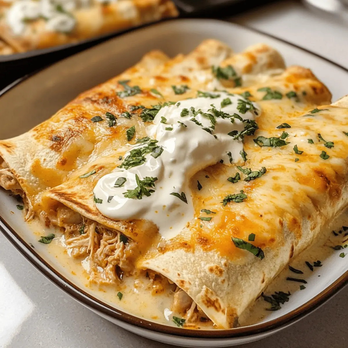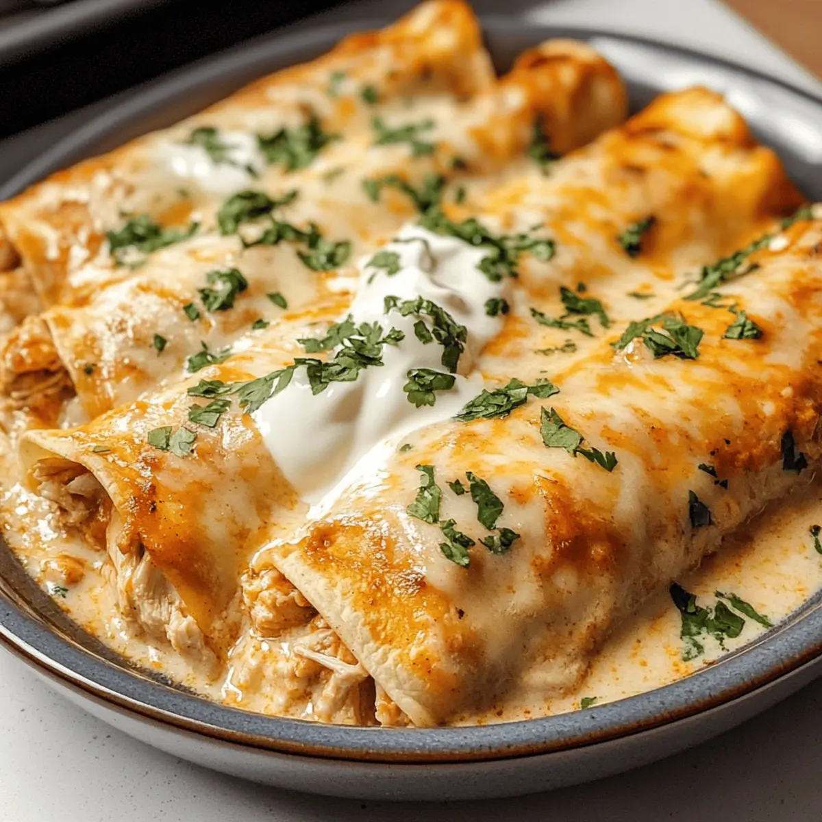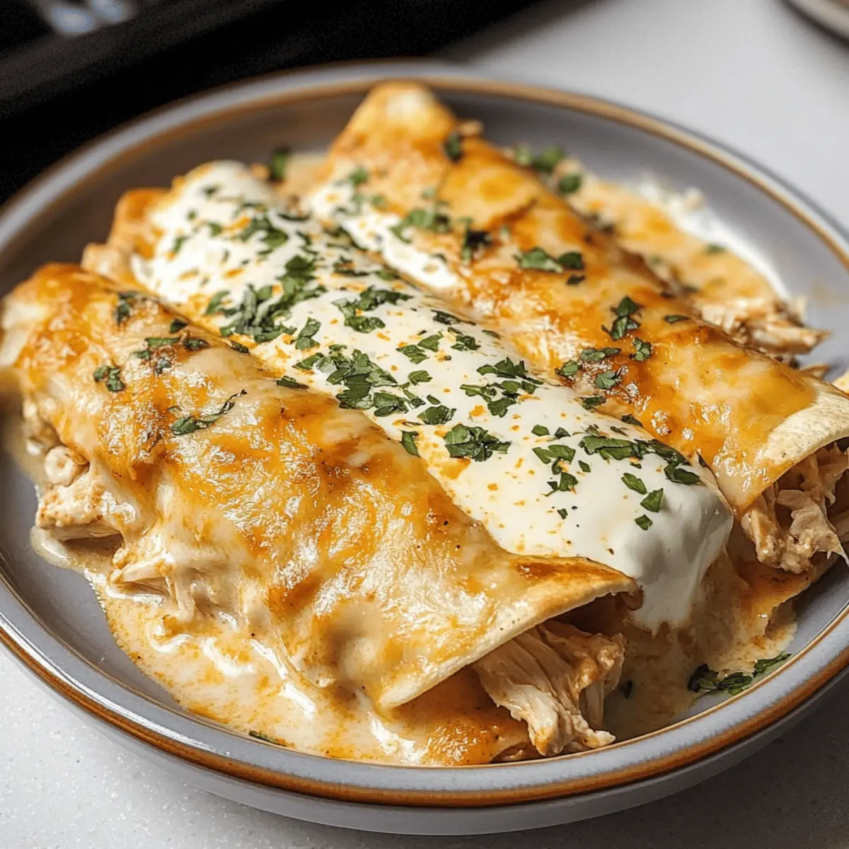 Jedes Mal, wenn ich an einen gemütlichen Abend mit meinem Partner denke, schwirrt mir der Gedanke an etwas Wärmendes und Befriedigendes im Kopf. Heute teile ich mein Geheimnis für begleitende Zerfetzte Hähnchen-Enchiladas mit cremiger Käsesauce, die den perfekten Hauch von Tex-Mex-Geschmack mitbringen. Diese kleine Portion ist nicht nur ideal für ein schnelles Abendessen unter der Woche, sondern auch eine großartige Möglichkeit, ein Date kulinarisch zu verwöhnen, ohne stundenlang in der Küche zu stehen. Mit ihrer cremigen Sauce und dem zarten gefüllten Hähnchen werden sie sicher Begeisterung hervorrufen. Bist du bereit, den Geschmack Mexikos in deine Küche zu bringen? Warum wirst du diese Enchiladas lieben? Einfachheit: Die Zubereitung ist schnell und unkompliziert, perfekt für alle, die ein schmackhaftes Gericht ohne Aufwand wünschen. Cremiger Genuss: Die Kombination aus Zartheit des Hähnchens und der samtigen Käsesauce sorgt für einen unvergleichlichen Geschmack, der jeden Bissen zu einem Erlebnis macht. Hervorragende Portionsgröße: Dieses kleine Rezept ist ideal für zwei und ermöglicht ein gemütliches Dinner mit deinem Lieblingsmenschen, ohne Reste übrig zu haben. Vielseitigkeit: Experimentiere mit Füllungen! Ob du das Hähnchen durch Gemüse oder Rind ersetzt – die Möglichkeiten sind endlos. Beliebtheit: Jeder wird begeistert sein! Diese Enchiladas sind perfekt für ein romantisches Date oder einfach einen gemütlichen Abend mit Freunden. Probiere auch unsere köstliche Beilage aus Guacamole dazu für ein rundum gelungenes Essen! Zutaten für Zerfetzte Hähnchen-Enchiladas • Hier sind alle Zutaten, die du für deine cremigen, Tex-Mex-inspirierten Enchiladas benötigst. Für die Füllung Ungesalzene Butter (2 EL) – Sorgt für Reichhaltigkeit und Feuchtigkeit in der Füllung und Sauce. Fein gehackte Zwiebel (1/2 Tasse) – Verleiht aromatische Süße und Tiefe; kann durch andere Zwiebelarten ersetzt werden, vermeide jedoch süße Zwiebeln wie Vidalia. Chilipulver (1 TL) – Fügt Wärme und Geschmack hinzu; unverzichtbar für das Tex-Mex-Aroma. Knoblauchpulver (1/2 TL) – Verstärkt den Geschmack; frischer Knoblauch kann für zusätzlichen Schwung verwendet werden. Kreuzkümmel (1/2 TL) – Trägt Erdigkeit und Tiefe bei, essenziell für das Tex-Mex-Geschmackserlebnis. Hühnerbrühe (2 EL + 3/4 Tasse) – Sorgt für Feuchtigkeit beim Kochen und in der Sauce; ideal ist eine natriumarme Variante. Salsa Verde (1/4 Tasse + 1 EL) – Bietet einen pikanten Geschmack mit subtiler Schärfe; beliebte Marken sind Trader Joe’s Hatch Green Chile Salsa und Herdez. Chipotle-Pfeffer in Adobo (1) – Verleiht Rauchigkeit und Schärfe; die Menge kann an die persönliche Vorliebe angepasst werden. Schlagsahne-Käse (2 EL) – Sorgt für Cremigkeit in der Füllung; regulärer Frischkäse kann für eine dickere Konsistenz verwendet werden. Zerfetztes Hähnchen (2 Tassen) – Hauptprotein; das Verwenden von Brathähnchen spart Zeit bei der Zubereitung. Für die Sauce Monterey- oder Pepper-Jack-Käse (1 Tasse) – Schmilzt wunderbar und sorgt für Cremigkeit und Geschmack; für mildere Variante Monterey Jack verwenden. Sauerrahm (1/3 Tasse) – Fügt der Sauce einen zusätzlichen cremigen und leicht säuerlichen Geschmack hinzu; leichte Varianten sollten vermieden werden. Für die Enchiladas Mehltortillas (4, 15 cm Durchmesser) – Der Grundpfeiler für Enchiladas; kann durch Mais-Tortillas für glutenfreie Optionen ersetzt werden. Gehackter Koriander oder Frühlingszwiebeln (zum Garnieren) – Frische und Farbe; optional für das Garnieren. Mit diesen Zutaten zauberst du unglaubliche, zerfetzte Hähnchen-Enchiladas mit cremiger Käsesauce, die für zwei Personen perfekt sind! Schritt-für-Schritt-Anleitung für Zerfetzte Hähnchen-Enchiladas mit cremiger Käsesauce Step 1: Hähnchenfüllung vorbereiten Schmelze 2 Esslöffel ungesalzene Butter in einer großen Pfanne bei mittlerer Hitze. Füge ½ Tasse fein gehackte Zwiebel hinzu und brate sie, bis sie weich und leicht goldbraun ist (ca. 3-4 Minuten). Streue 1 Teelöffel Chilipulver, ½ Teelöffel Knoblauchpulver und ½ Teelöffel Kreuzkümmel darüber und rühre gut um. Gieße 2 Esslöffel Hühnerbrühe hinzu, um die Bratenreste zu lösen, und koche für eine weitere Minute. Step 2: Füllung vollenden Rühre ¼ Tasse Salsa Verde, 2 Esslöffel Schlagsahne-Käse und 1 Chipotle-Pfeffer in Adobo in die Mischung ein. Füge schließlich 2 Tassen zerfetztes Hähnchen hinzu und vermenge alles gründlich. Koche die Füllung für etwa 3-5 Minuten, bis sie heiß ist und die Aromen sich verbunden haben. Halte die Füllung warm, während du zur Sauce übergehst. Step 3: Cremige Käsesauce zubereiten In einem kleinen Topf 2 Esslöffel Butter bei mittlerer Hitze schmelzen. Rühre 1 Esslöffel Mehl ein und koche es für etwa 1 Minute, um eine Mehlschwitze zu erstellen. Füge langsam ¾ Tasse Hühnerbrühe hinzu und schlage die Mischung glatt. Lasse die Sauce 5 Minuten köcheln, bis sie leicht dickflüssig ist; sie sollte eine cremige Konsistenz haben. Step 4: Käse und Sauerrahm einrühren Nimm den Topf vom Herd und füge 1 Tasse Monterey- oder Pepper-Jack-Käse und ⅓ Tasse Sauerrahm hinzu. Rühre alles gut um, bis der Käse vollständig geschmolzen ist und eine glatte, cremige Sauce entsteht. Schmecke die Sauce mit Salz ab und stelle sie beiseite, während du die Enchiladas zusammenstellst. Step 5: Enchiladas zusammenstellen Heize den Ofen auf 190 °C (375 °F) vor. Lege 4 Mehltortillas bereit und fülle jede mit der Hähnchenfüllung. Rolle die Tortillas auf und lege sie mit der Nahtseite nach unten in eine leicht gefettete Auflaufform. Achte darauf, die Tortillas nicht zu überfüllen, damit sie nicht auseinanderfallen. Step 6: Sauce hinzufügen und backen Gieße die cremige Käsesauce gleichmäßig über die aufgerollten Enchiladas. Decke die Auflaufform mit Aluminiumfolie ab und backe die Enchiladas 15 Minuten lang im vorgeheizten