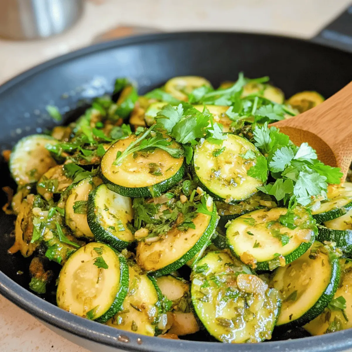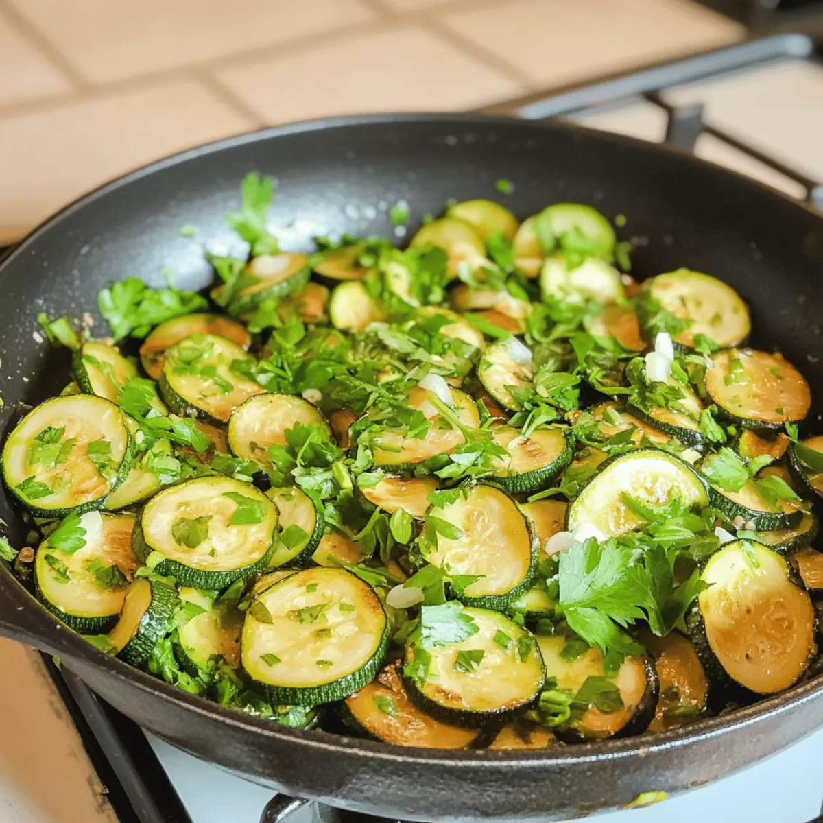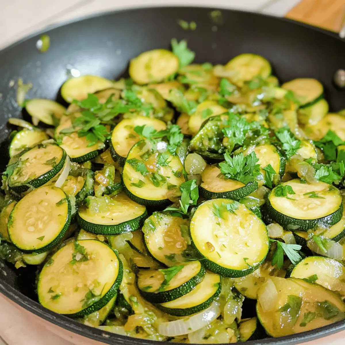 Ich liebe es, in der Küche neue, gesunde Rezepte auszuprobieren – und meine neueste Entdeckung ist die himmlische Zucchini Pfanne. Sie ist nicht nur schnell zubereitet, sondern auch unglaublich vielseitig! Diese farbenfrohe, vegetarische Delikatesse bringt frische Kräuter und eine leichte Konsistenz zusammen, perfekt als Beilage oder als Basis für dein Lieblingsomelett. Wenn die Zeit drängt und du dennoch etwas Gutes auf den Tisch bringen möchtest, hast du hier ein einfaches, schmackhaftes Gericht, das deinen Alltag bereichert. Außerdem ist die Zucchini Pfanne nicht nur gesund, sondern auch kalorienarm – ideal für alle, die eine ausgewogene Ernährung pflegen möchten. Bist du bereit, deinen Gaumen mit diesem zauberhaften Rezept zu verwöhnen? Warum solltest du diese Zucchini Pfanne lieben? Einfachheit: Die Zucchini Pfanne ist super schnell zubereitet. Mit nur wenigen Zutaten kannst du das Gericht in weniger als 30 Minuten fertigstellen. Frische Aromen: Die Kombination aus Zucchini und frischen Kräutern sorgt für einen unglaublichen Geschmack, der jedem an deinem Tisch Freude bereitet. Vielseitigkeit: Verwende sie als Beilage oder als Hauptgericht mit einer Portion quinoa oder braunem Reis. Gesundheit: Das Rezept ist leicht und kalorienarm, sodass du dich gut fühlst, während du schlemmen kannst. Flexibilität: Du kannst ganz einfach die Kräuter variieren, indem du zum Beispiel Auberginenpfanne Orientalische Gewaerze für etwas mehr Würze hinzufügst. Crowd-Pleaser: Egal, ob du für dich allein kochst oder Gäste bewirtest, diese Zucchini Pfanne wird immer ein Hit sein! Zucchini Pfanne Zutaten Hinweis: Diese Zucchini Pfanne ist nicht nur schnell zubereitet, sondern auch voller fabelhafter Aromen! Für die Pfanne Zucchini – eine frische und zarte Basis für das Gericht; wähle kleine, hellgrüne Zucchinis, um Bitterkeit zu vermeiden. Koriander (Cilantro) – bringt einen lebhaften Geschmack ins Spiel; ersetze ihn durch Petersilie für eine mildere Note. Zwiebel – für natürliche Süße und Tiefe beim Anbraten; in Ringe schneiden, damit sie gleichmäßig garen. Olivenöl – zum Anbraten der Zwiebel, um das gesamte Aroma zu verstärken. Salz und schwarzer Pfeffer – essentielle Gewürze zur Abschmeckung, dese solltest du nach deinem Geschmack anpassen. Wasser – dient zum Dämpfen und erhält die Feuchtigkeit der Zucchini während des Kochens. Schritt-für-Schritt-Anleitung für Zucchini Pfanne Step 1: Zwiebel anbraten Erhitze in einer großen Pfanne bei mittlerer Hitze 2 Esslöffel Olivenöl. Füge die in Ringe geschnittene Zwiebel hinzu und brate sie für etwa 3–4 Minuten, bis sie weich und leicht transparent sind. Achte darauf, dass die Zwiebel nicht anbrennt und regelmäßig umrühren, um gleichmäßige Bräunung zu erreichen. Step 2: Zucchini schneiden und hinzufügen Während die Zwiebel brät, wasche die Zucchini und schneide sie in 0,5 cm dicke Scheiben. Wenn die Zwiebel fertig ist, füge die Zucchinischeiben in die Pfanne hinzu. Gieße 100–120 ml Wasser dazu, um die Zucchini sanft zu dämpfen und deren Feuchtigkeit zu erhalten. Step 3: Dämpfen der Zucchini Decke die Pfanne mit einem Deckel ab und lasse die Zucchini bei mittlerer Hitze für 8–10 Minuten dämpfen. Überprüfe nach etwa 5 Minuten die Konsistenz der Zucchini; sie sollten weich, aber noch bissfest sein. Rühre gelegentlich um, damit alle Scheiben gleichmäßig garen. Step 4: Kräuter hinzufügen Nehme die Pfanne vom Herd, sobald die Zucchini die gewünschte Konsistenz erreicht haben. Hacke die Korianderblätter grob und streue sie über das gedämpfte Gemüse. Diese frischen Aromen verleihen deiner Zucchini Pfanne den perfekten Geschmack. Step 5: Würzen und servieren Abschließend mit Salz und schwarzem Pfeffer nach Geschmack würzen. Rühre alles gut um, damit die Gewürze gleichmäßig verteilt werden. Serviere die Zucchini Pfanne sofort heiß als Beilage oder Hauptgericht und genieße das köstliche, gesunde Gericht! Zucchini Pfanne Variationen & Alternativen Lass deiner Kreativität freien Lauf und passe dieses Rezept nach deinem Geschmack an! Petersilie: Ersetze Koriander durch frische Petersilie für einen milderen, klassischen Geschmack. Kräutermischung: Experimentiere mit einer Mischung aus frischen Kräutern wie Basilikum und Thymian, um spannende neue Aromen zu entdecken. Gemüse-Boost: Füge gewürfelte Paprika oder Karotten hinzu, um zusätzliche Süße und Farbe in dein Gericht zu bringen. Diese Variationen sorgen für eine besondere Note und machen dein Essen noch gesünder! Würzige Note: Mische etwas Chiliflocken oder frische Chilischoten hinzu, um deinem Gericht eine angenehme Schärfe zu verleihen. Tomaten: Für eine saftigere Textur und zusätzlichen Geschmack kannst du gewürfelte Tomaten während des Dämpfens hinzufügen. Quinoa oder Reis: Verwandle die Zucchini Pfanne in eine sättigende Hauptspeise, indem du sie auf einem Bett aus gekochtem Quinoa oder braunem Reis servierst. Nüsse: Garniere die Pfanne mit gerösteten Mandeln oder Pinienkernen für einen köstlichen Crunch und gesunde Fette. Vegetarische Proteinquelle: Ein paar weiße Bohnen oder Kichererbsen machen deine Zucchini Pfanne noch nahrhafter und erhöhen den Proteingehalt. Suchst du eine weitere köstliche Beilage? Probiere unbedingt die Auberginenpfanne Orientalische Gewaerze aus! Vorbereitung der Zucchini Pfanne für stressfreie Abende Die Zucchini Pfanne ist perfekt für alle, die Zeit sparen wollen! Du kannst die Zucchini bis zu 24 Stunden im Voraus schneiden und in einem luftdichten Behälter im Kühlschrank aufbewahren, um ihre Frische zu bewahren – das verhindert, dass sie braun werden. Auch die Zwiebeln lassen sich bereits einige Stunden vorher vorbereiten; einfach in Ringe schneiden und in einem geschlossenen Behälter lagern. Zum Kochen erhitzt du das Olivenöl, brätst die Zwiebeln und fügst die Zucchini hinzu, gefolgt von Wasser zum Dämpfen. Wenn du schnell ein gesundes Gericht zuberei